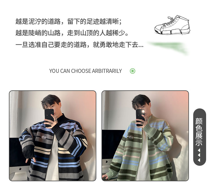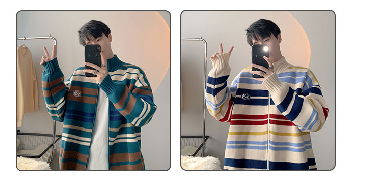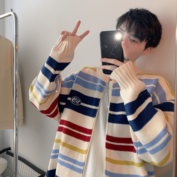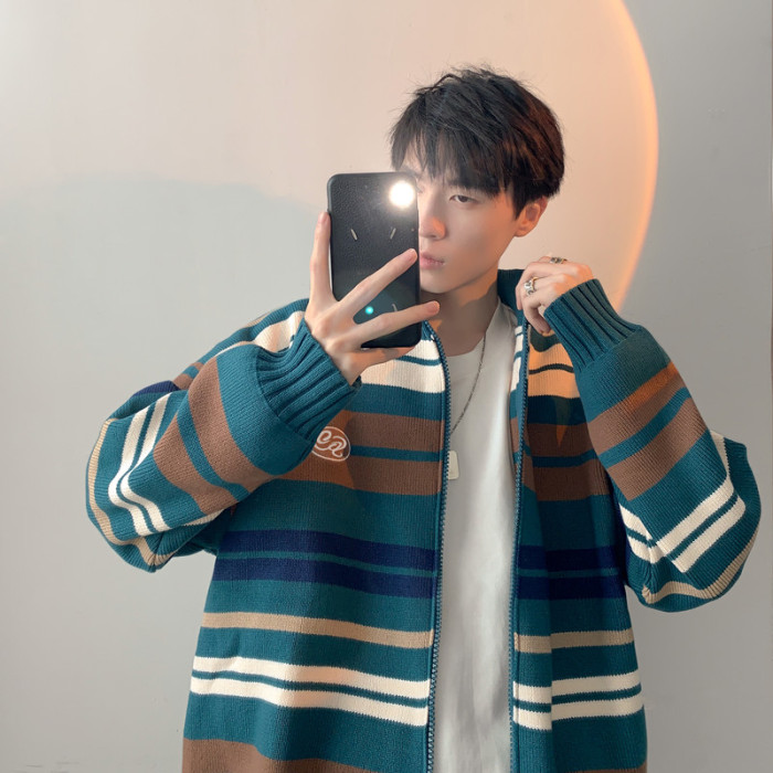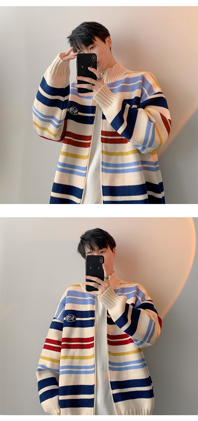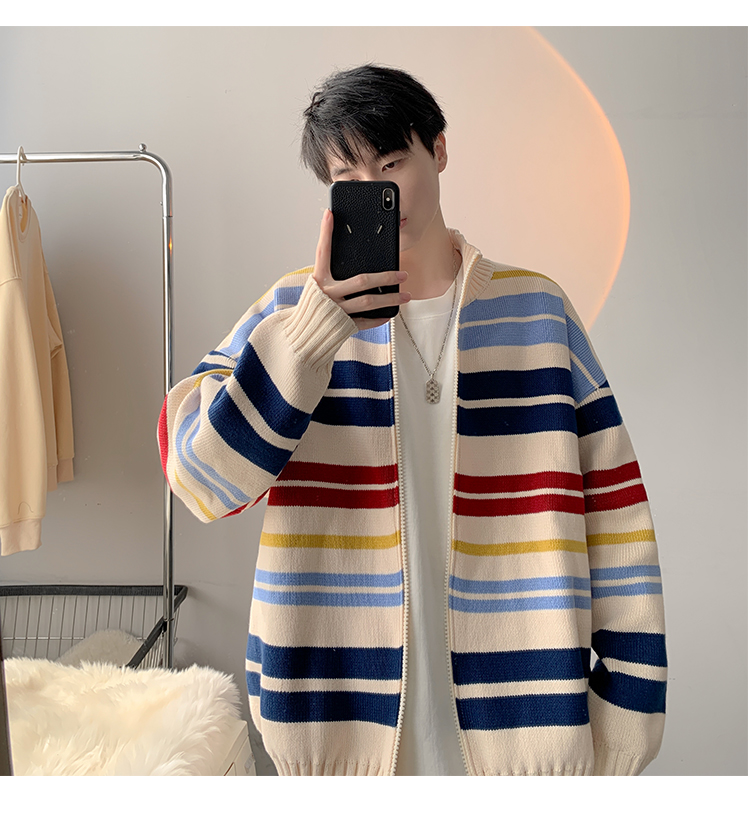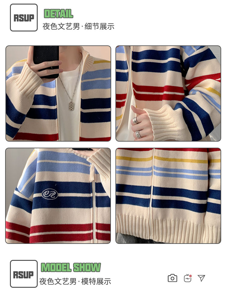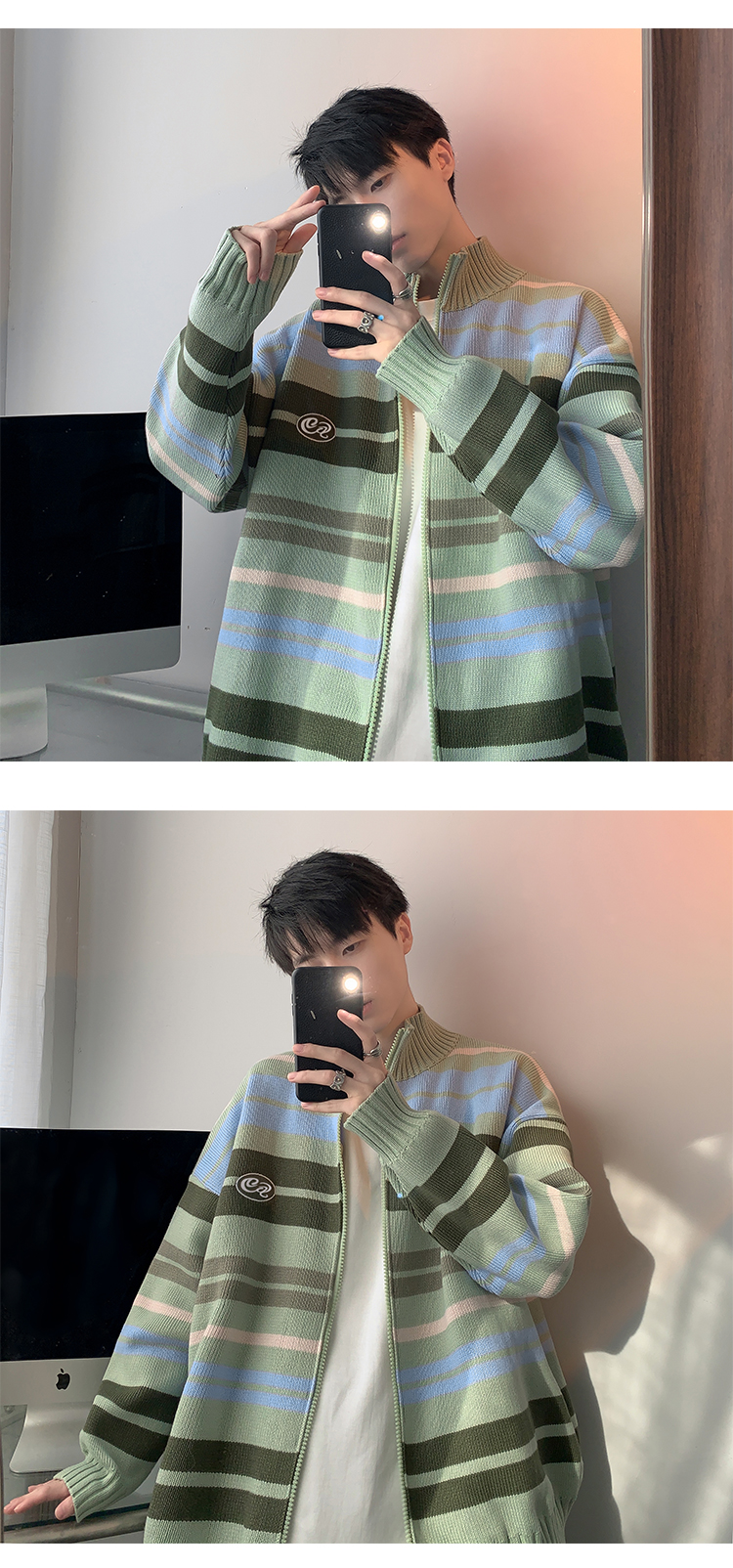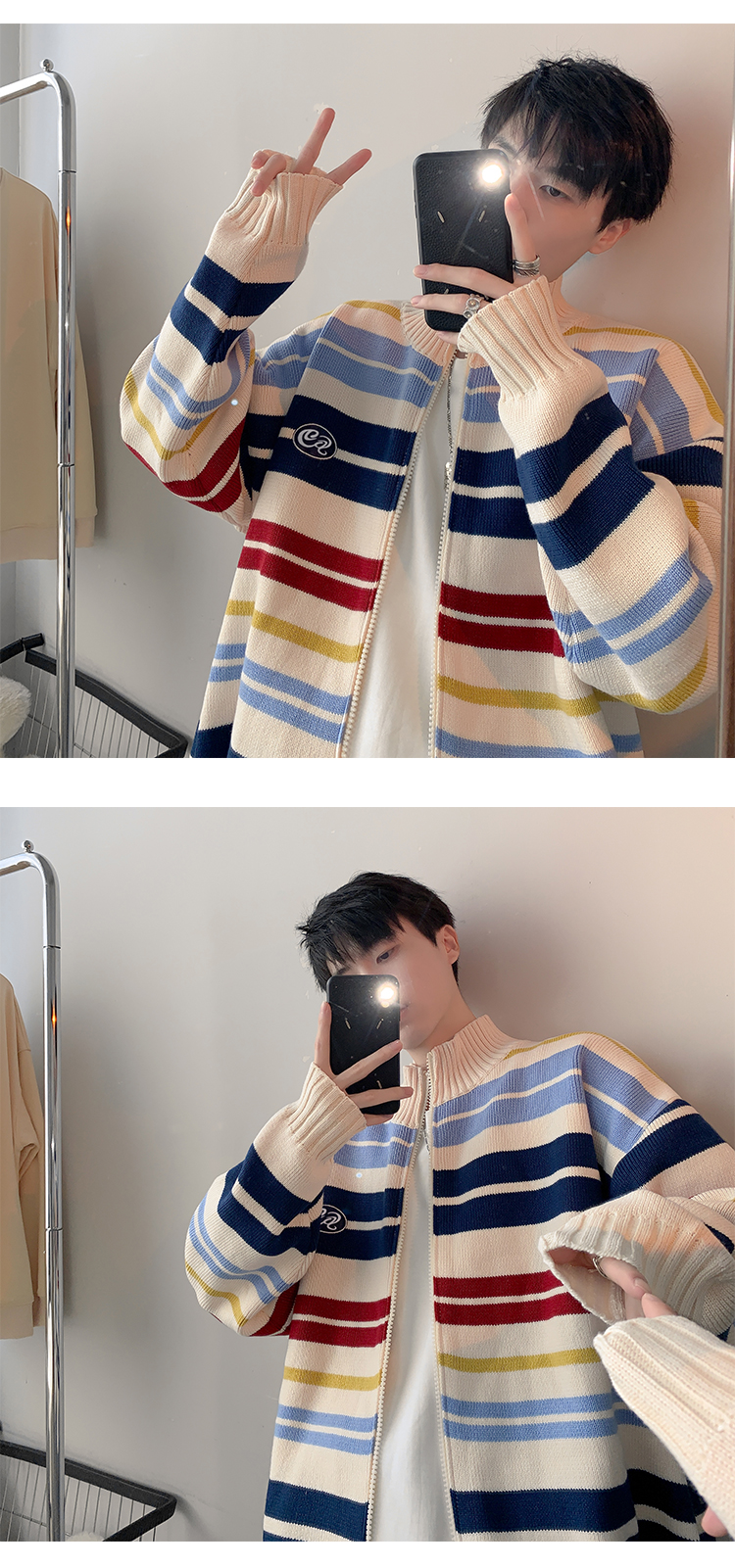 日系拼色條紋立領開衫毛衣男女潮牌ins情侶裝針織衫寬松秋冬外套