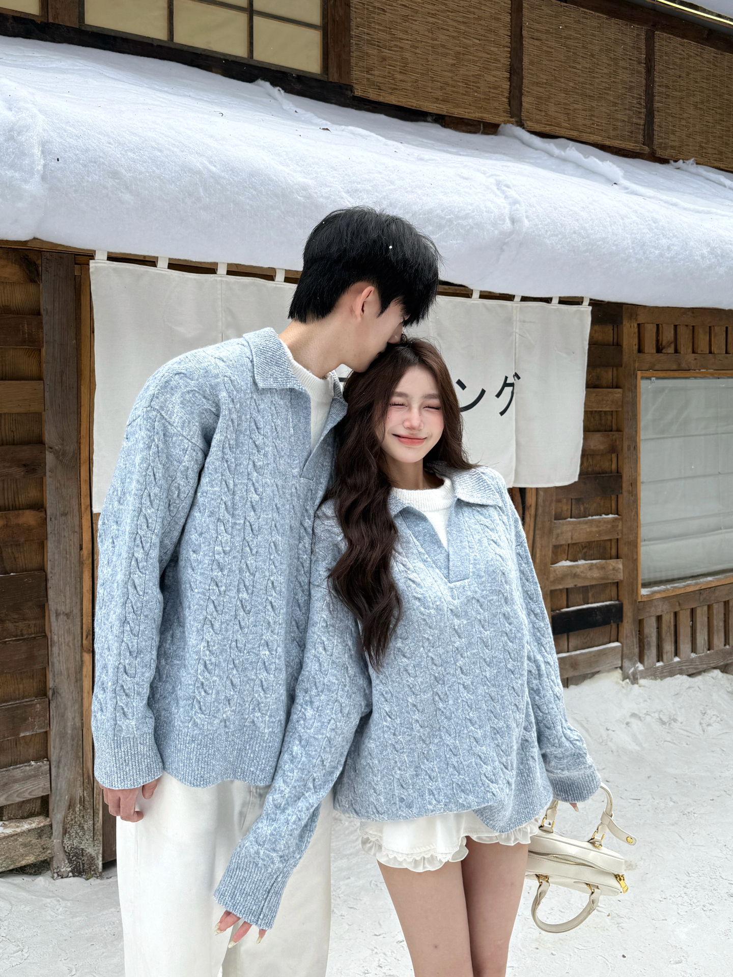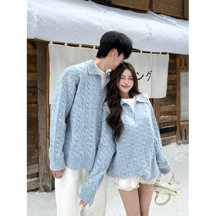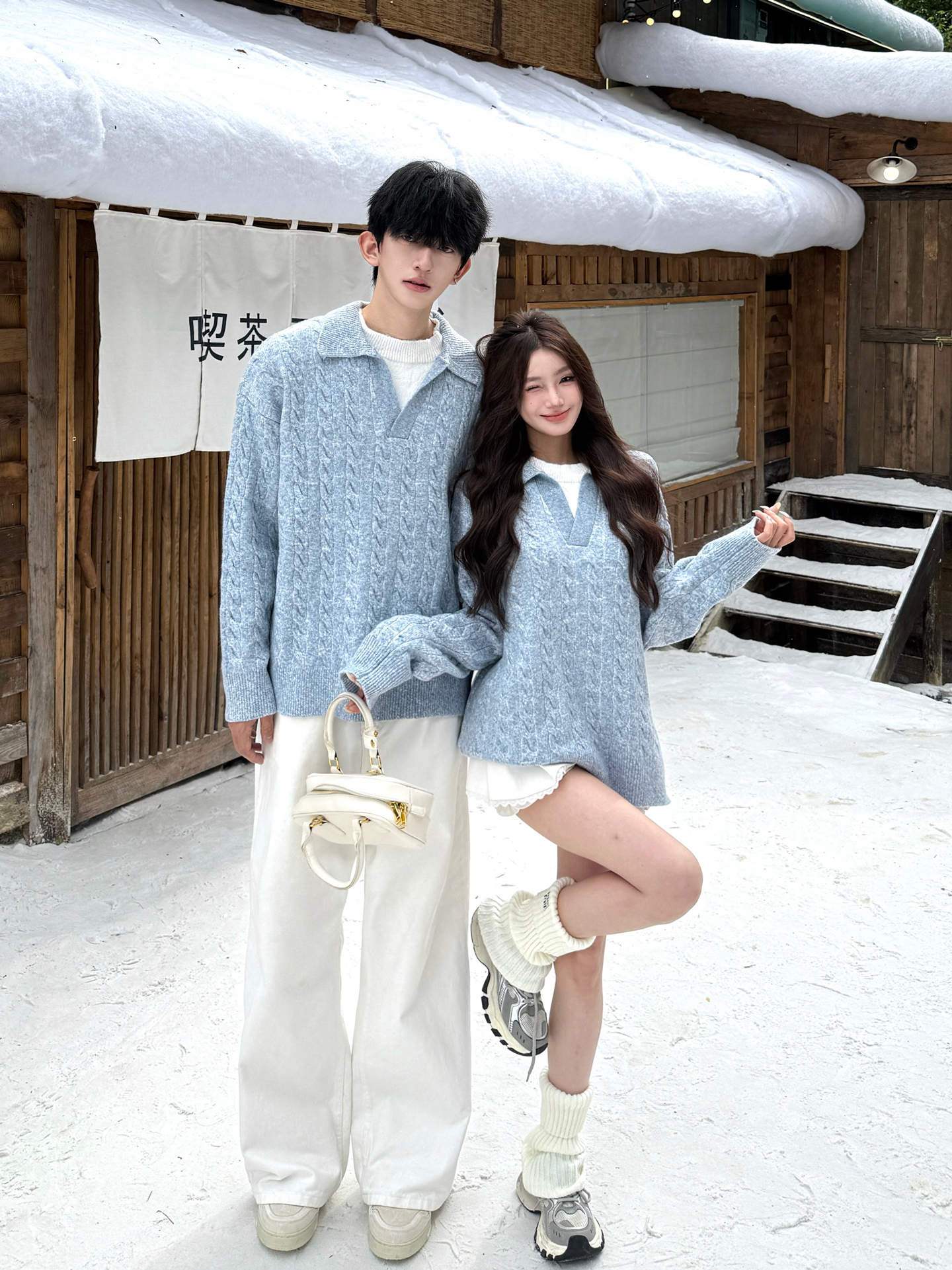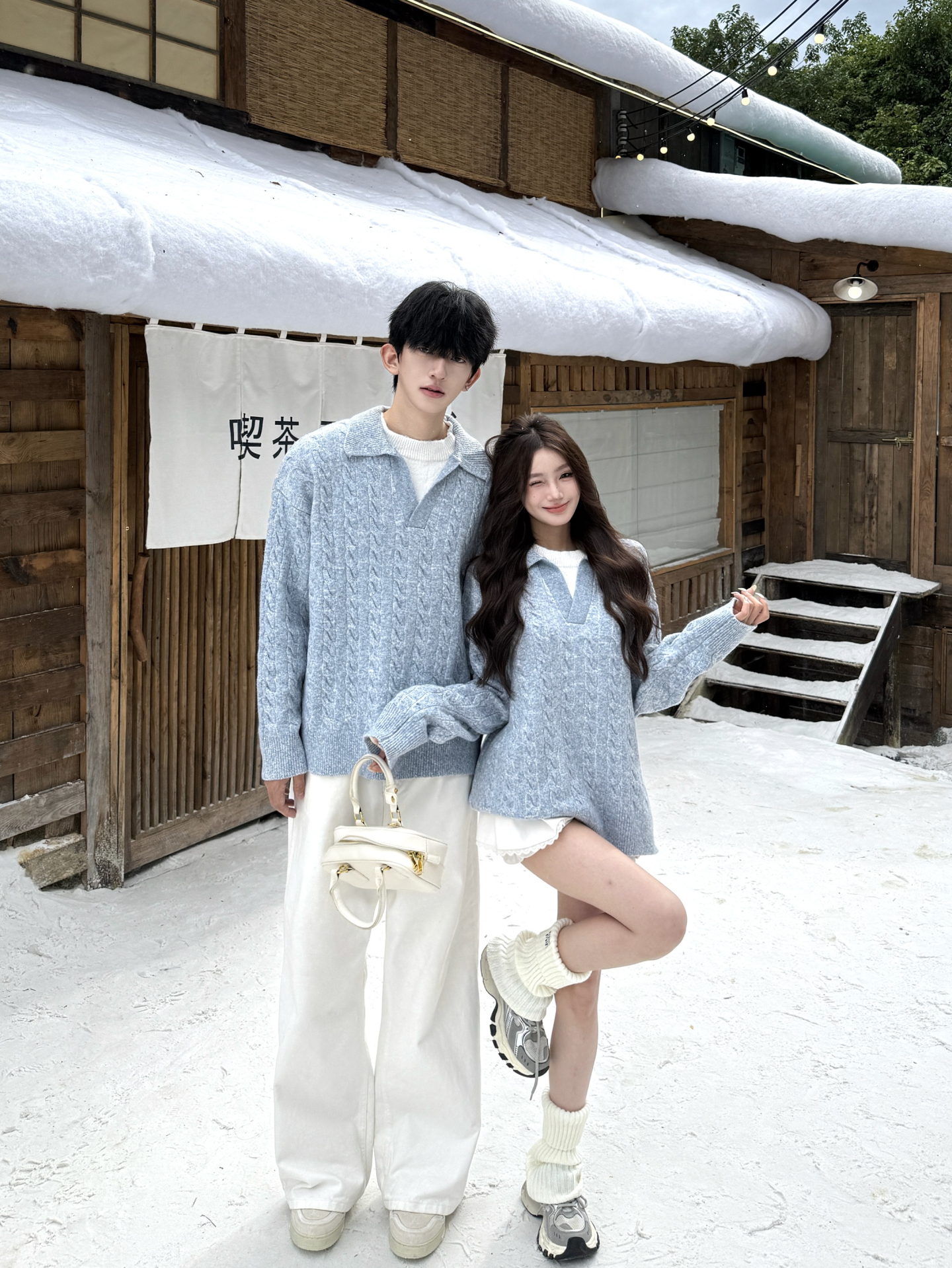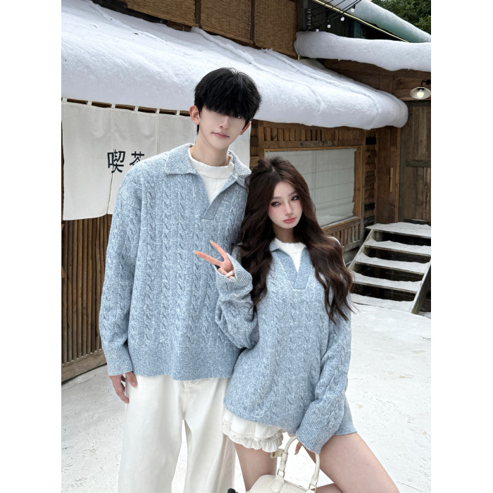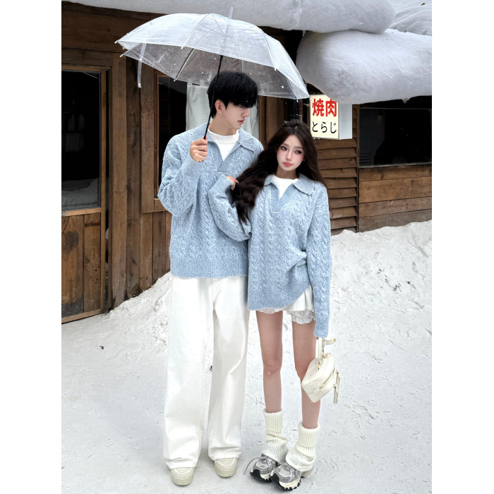 韓系假兩件翻領套頭針織衫男女情侶裝秋冬季寬松純色休閒麻花毛衣
