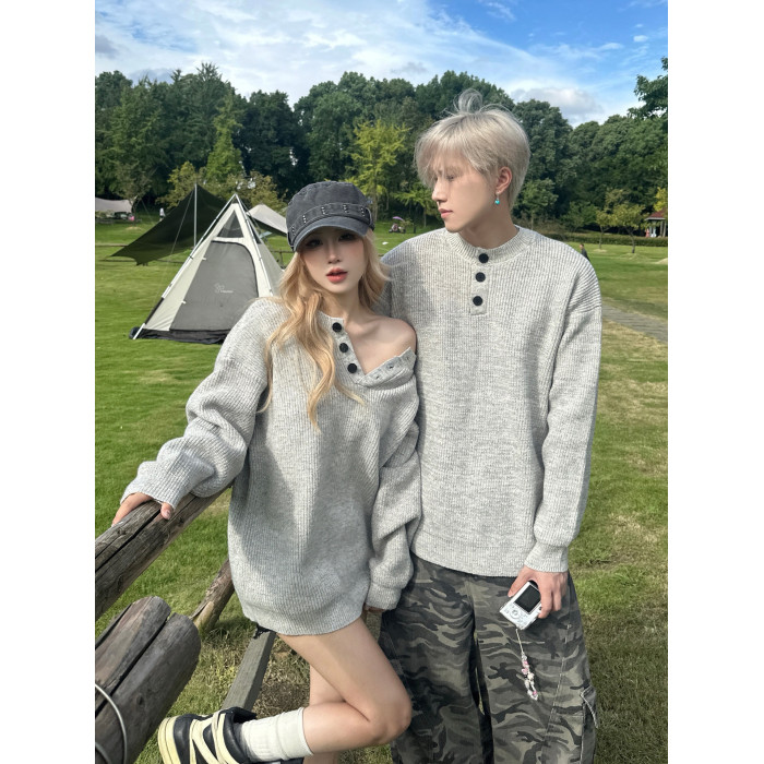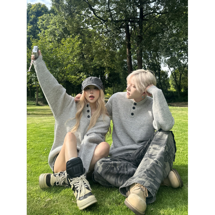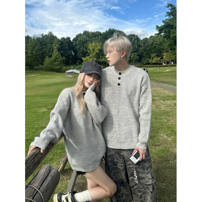 美式復古亨利領毛衣男女情侶裝秋冬季慵懶風cleanfit高級感針織衫