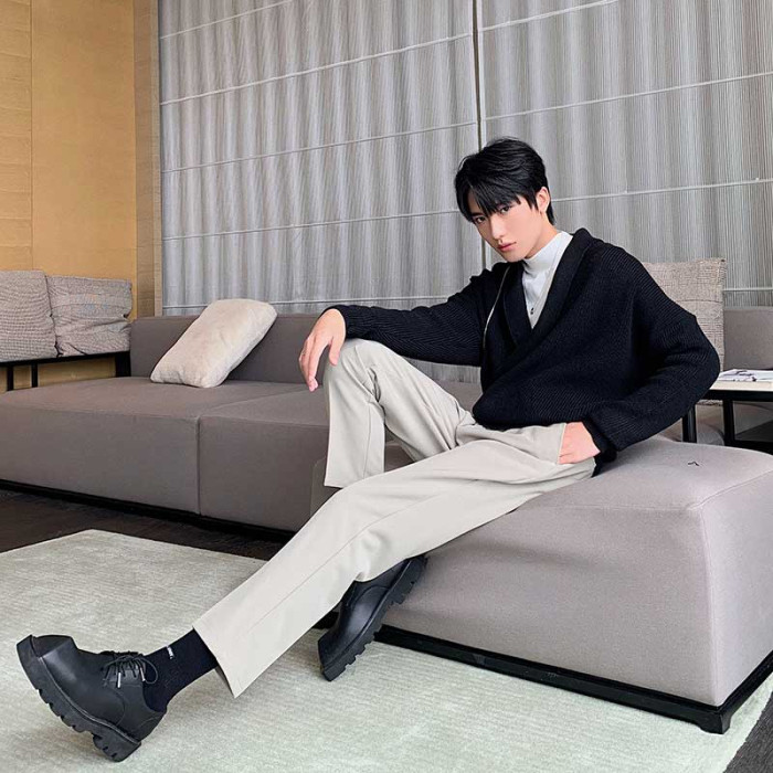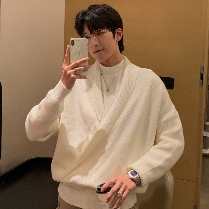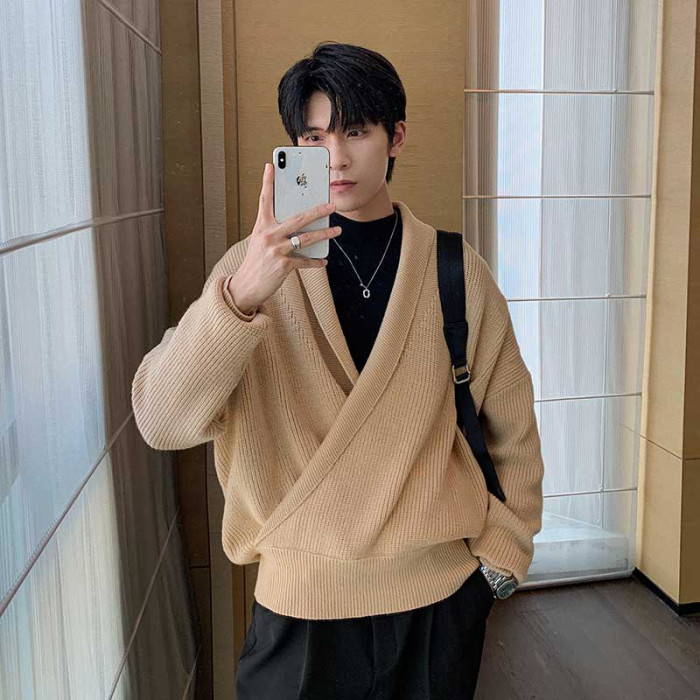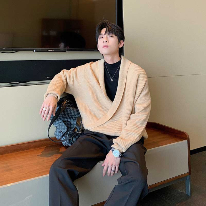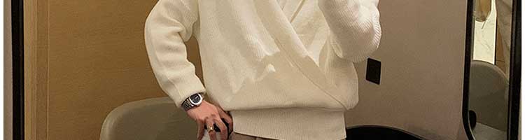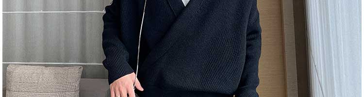 秋冬日系復古毛衣男潮ins男生慵懶風套頭半開衫深V領墜垂感針織衫