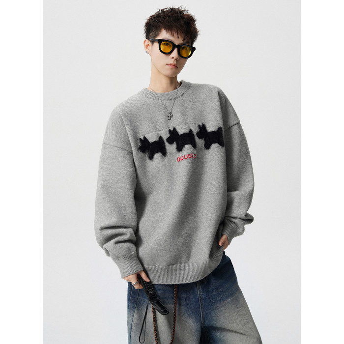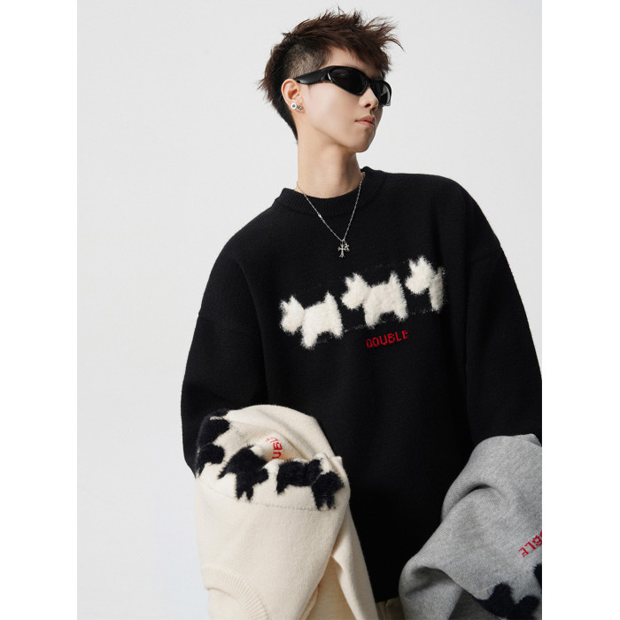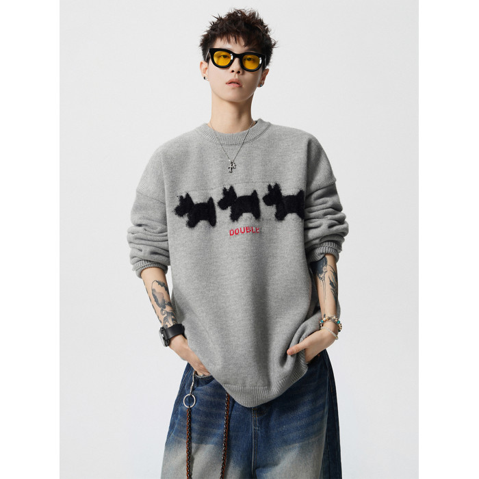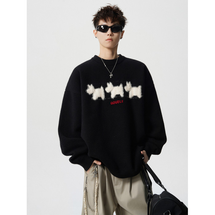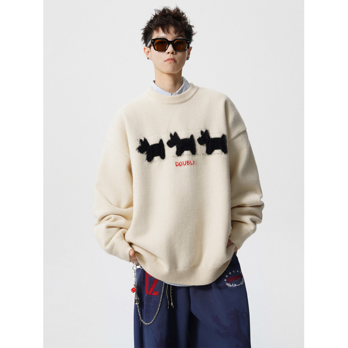 美式小狗植絨圓領毛衣男女冬季新款潮牌寬松慵懶風情侶針織衫上衣