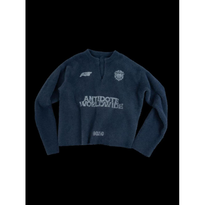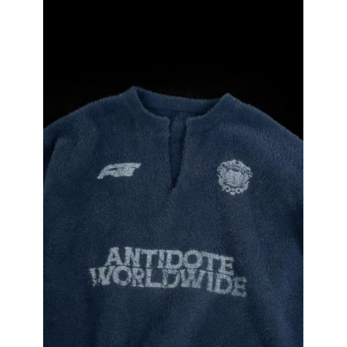 ANTIDOTE 貂毛運動風毛衣美式復古徽章印花v領球服加絨針織衫外套