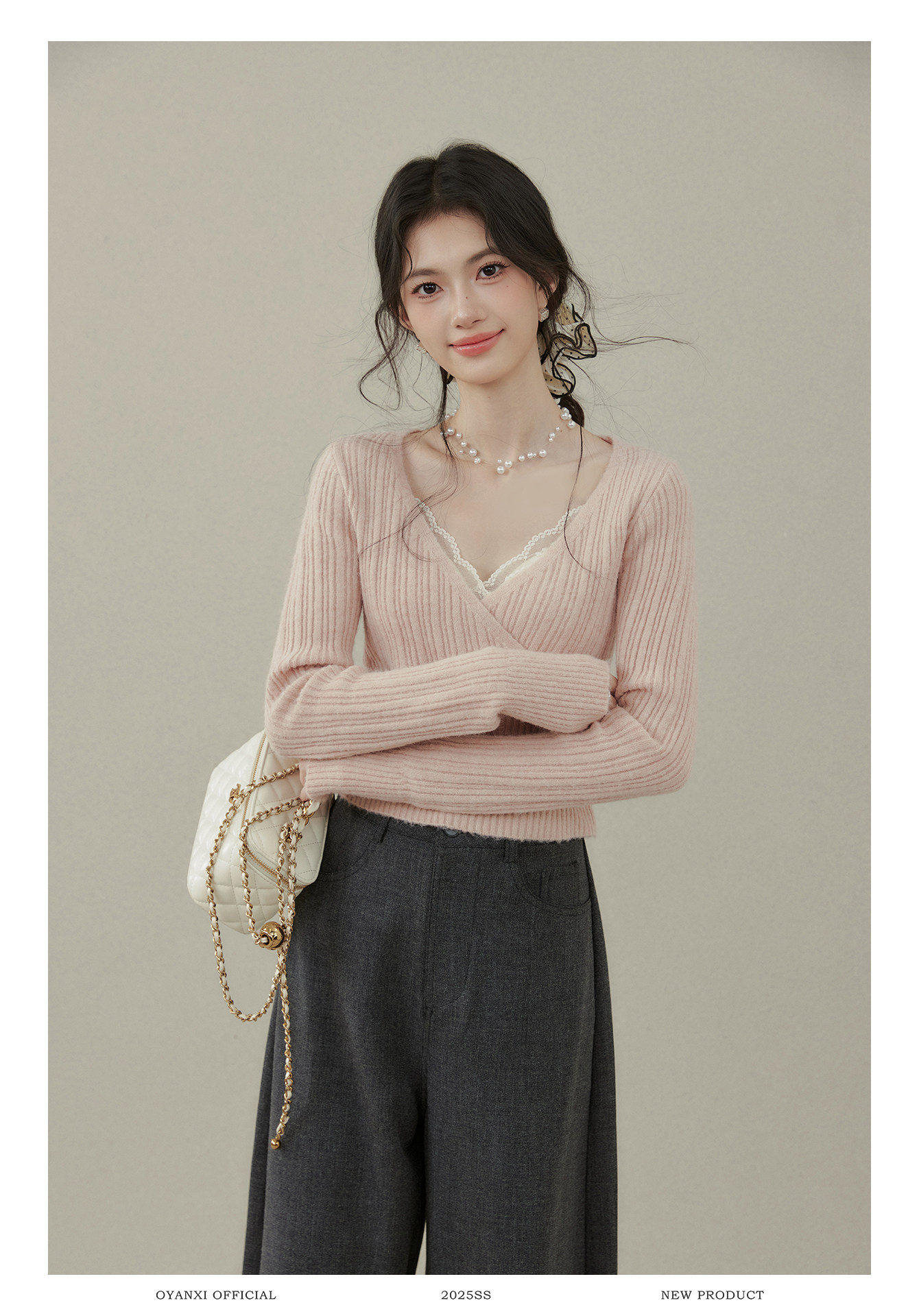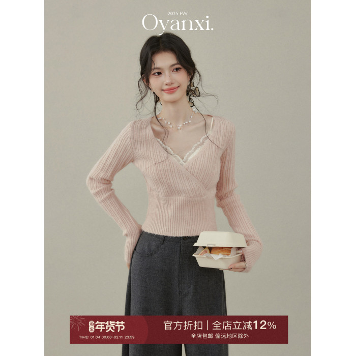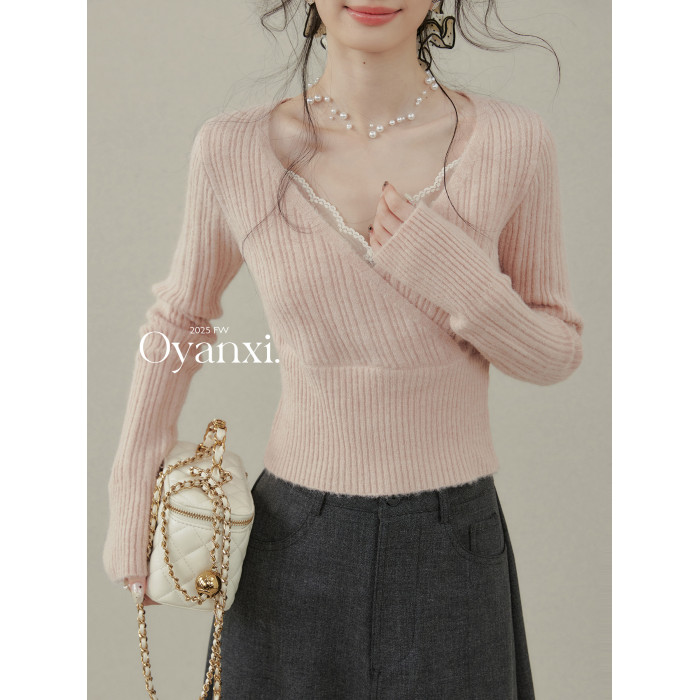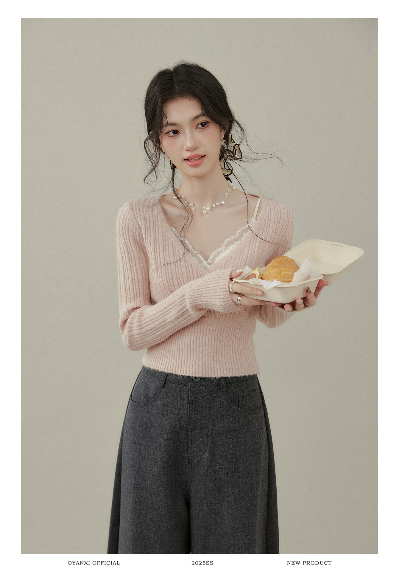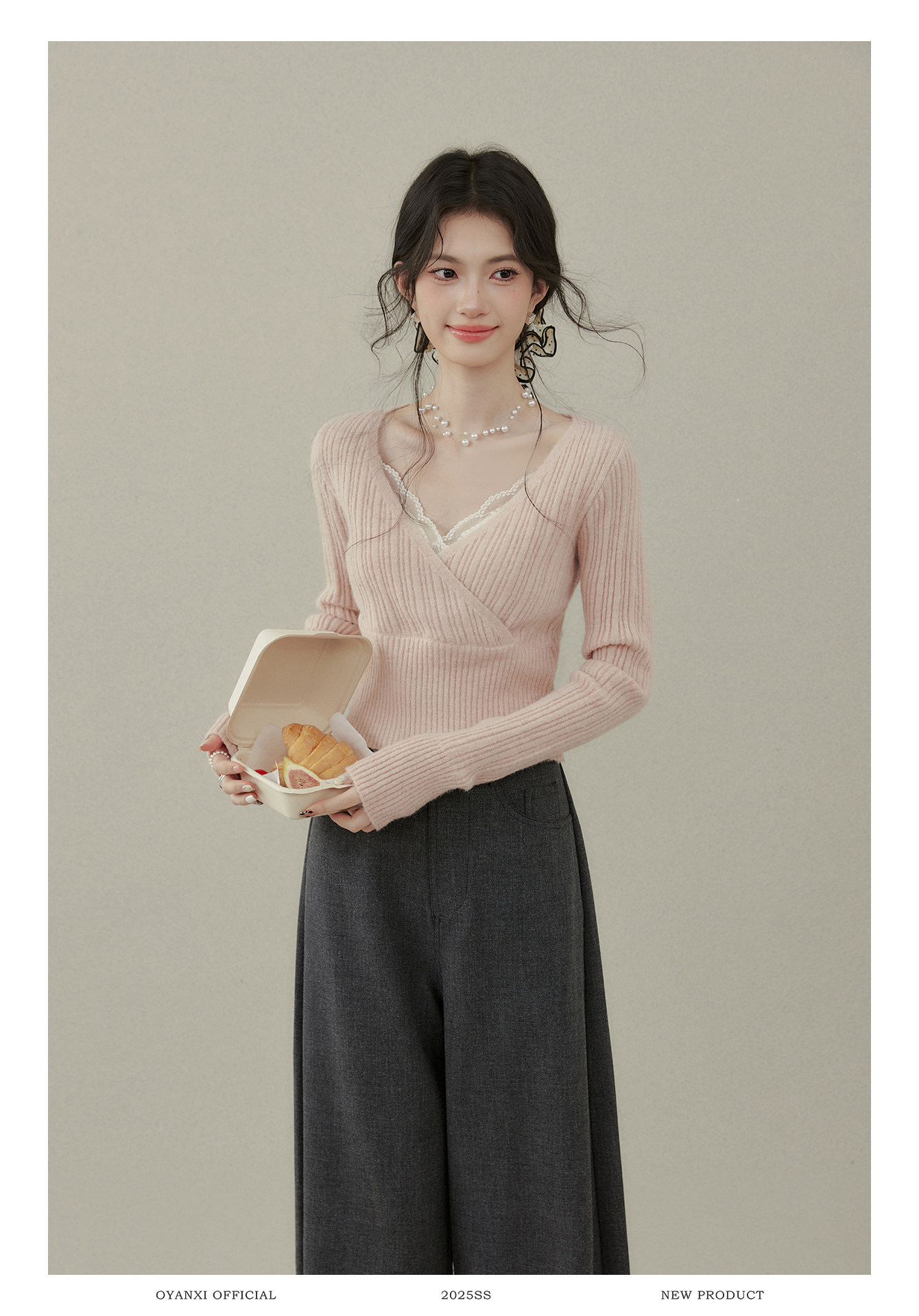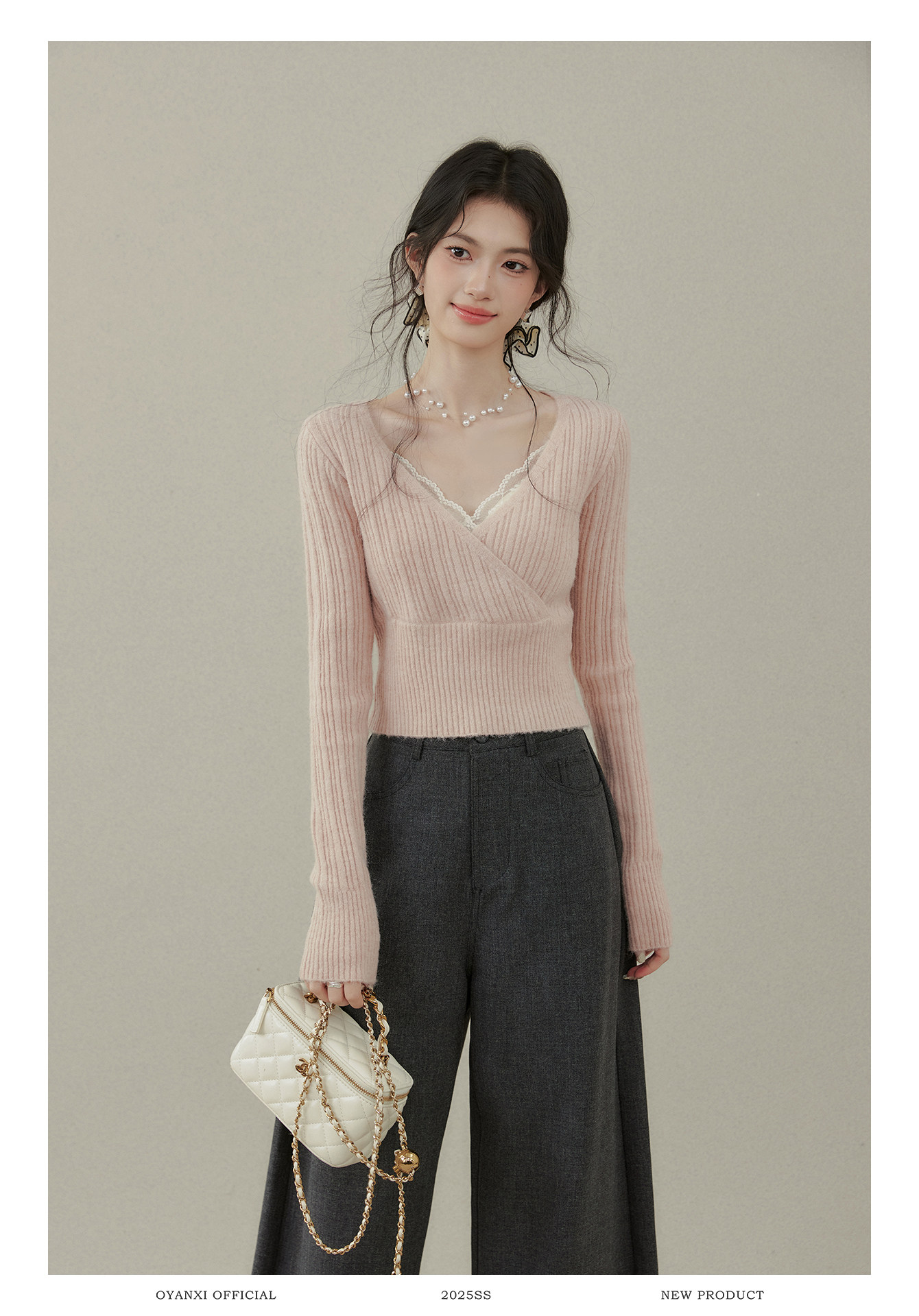 歐陽喜《甜氧旋律》粉色長袖針織毛衣女秋冬季新款修身絕美小上衣