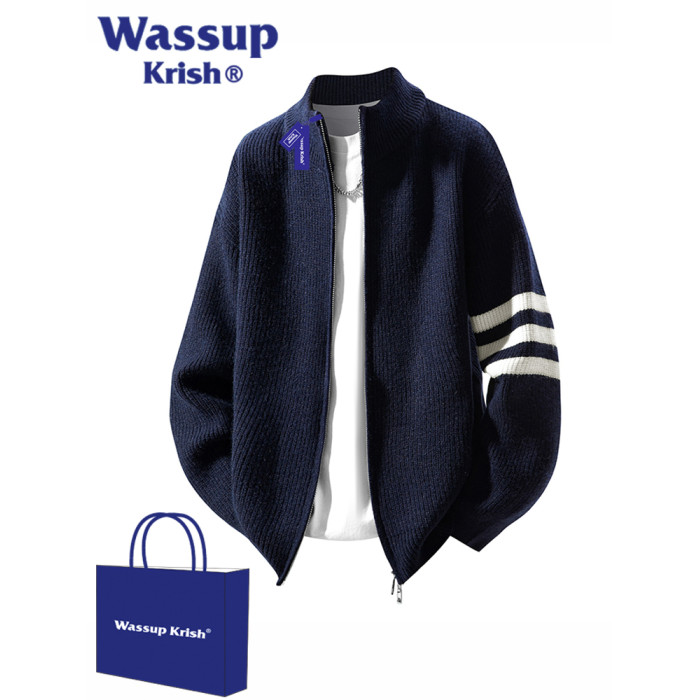 WASSUP KRISH條紋立領慵懶開衫毛衣男秋季休閒寬松輕熟風針織外套