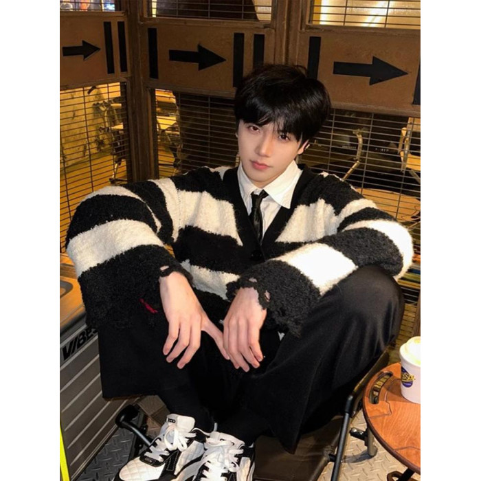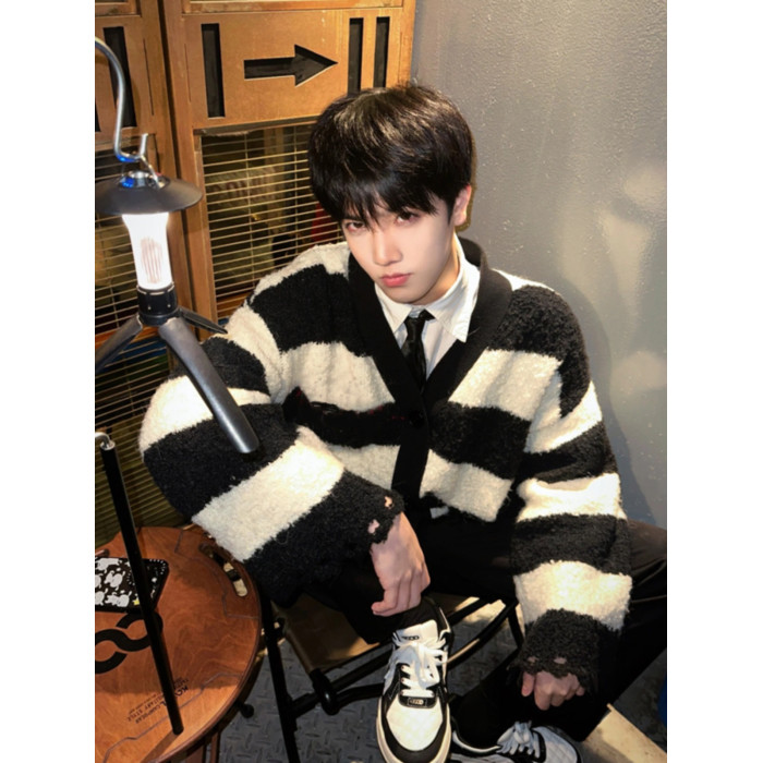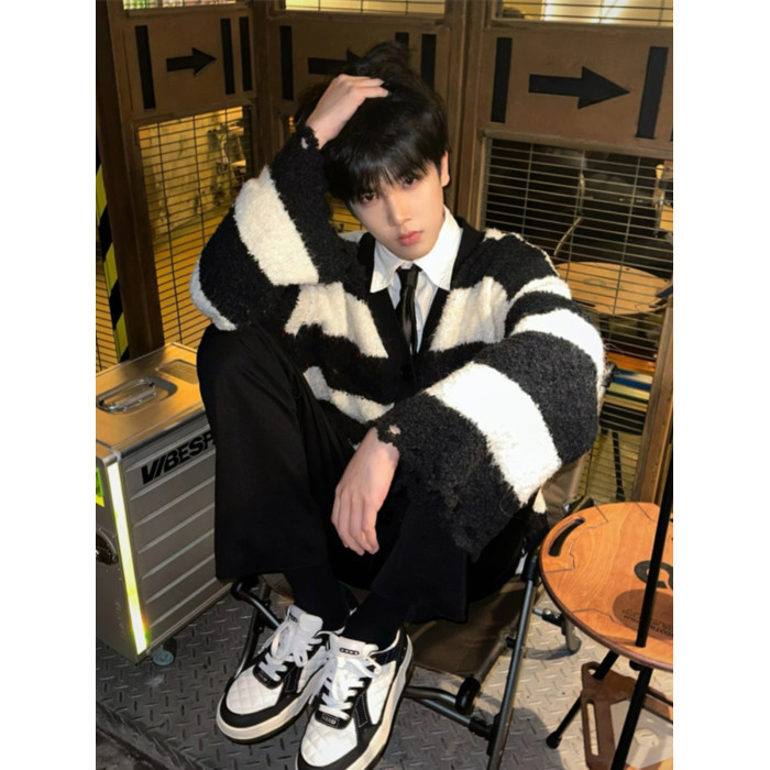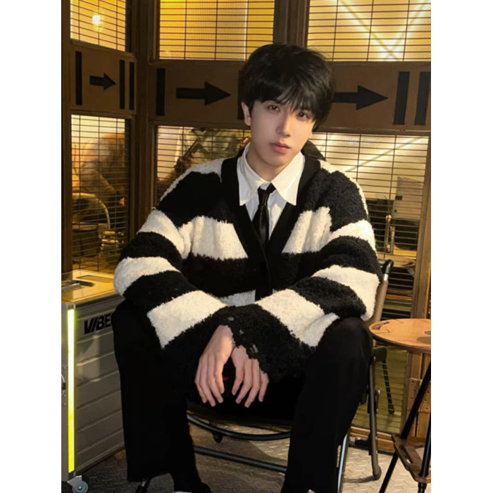 撞色條紋毛衣男冬季日系復古仿貂毛慵懶針織衫高級感軟糯開衫外套