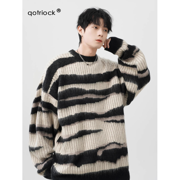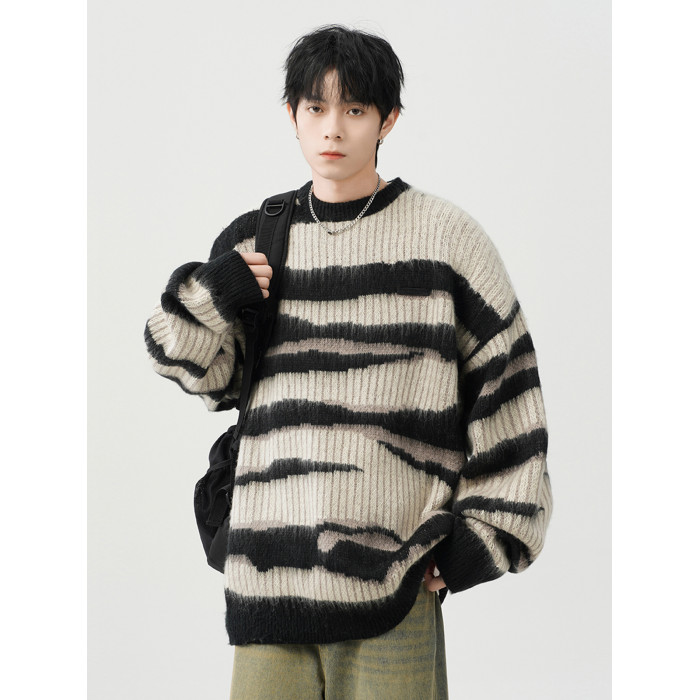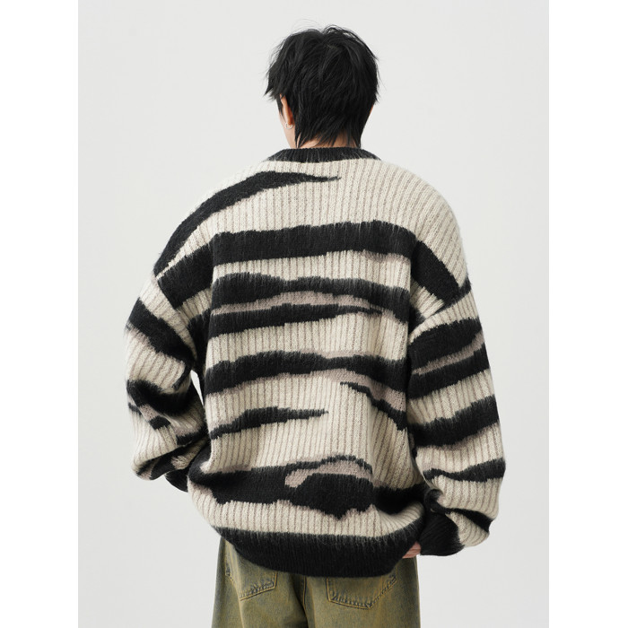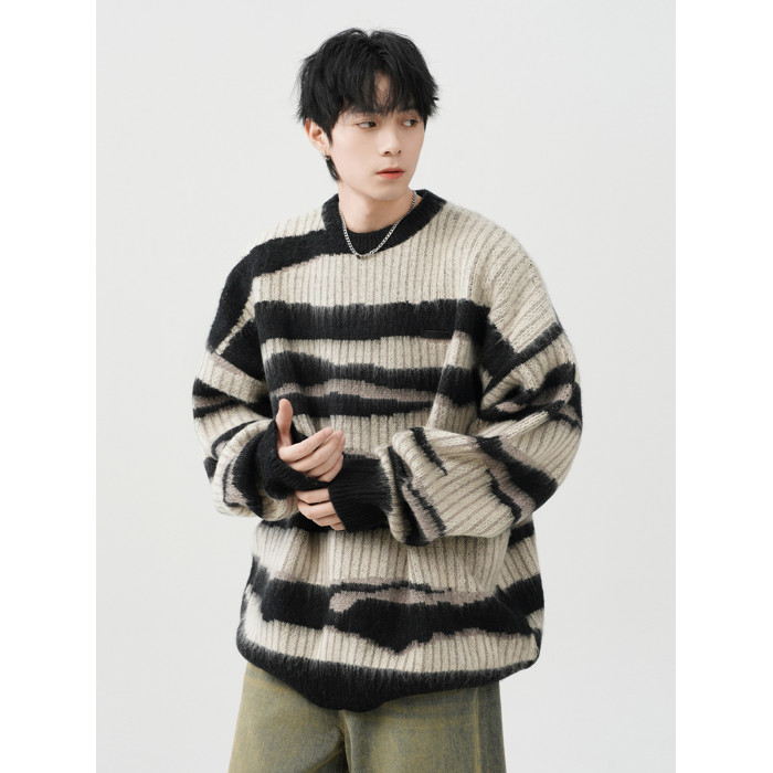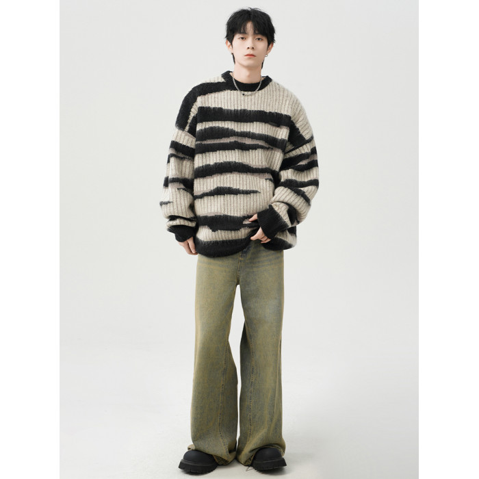 美式復古海馬毛條紋圓領毛衣男女冬季潮牌oversize慵懶休閒針織衫
