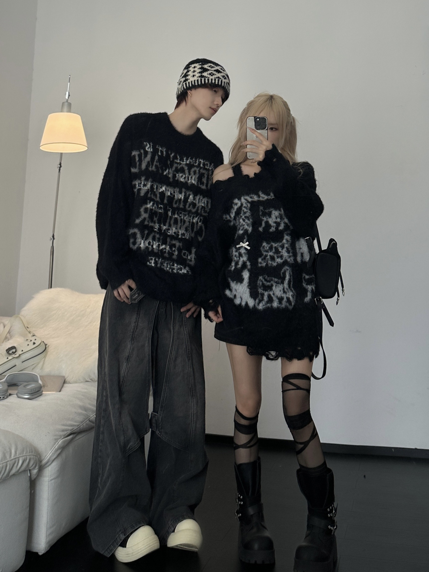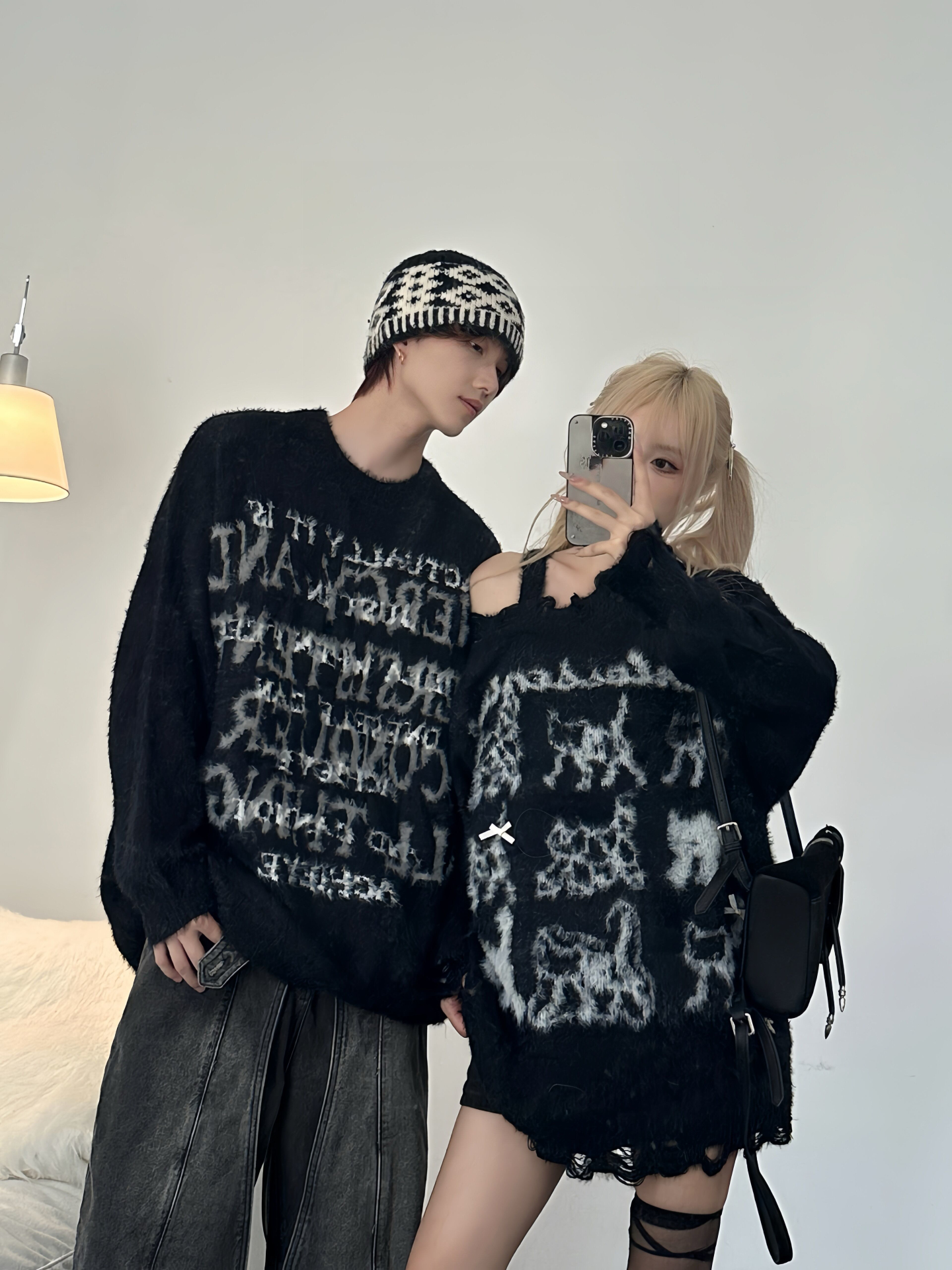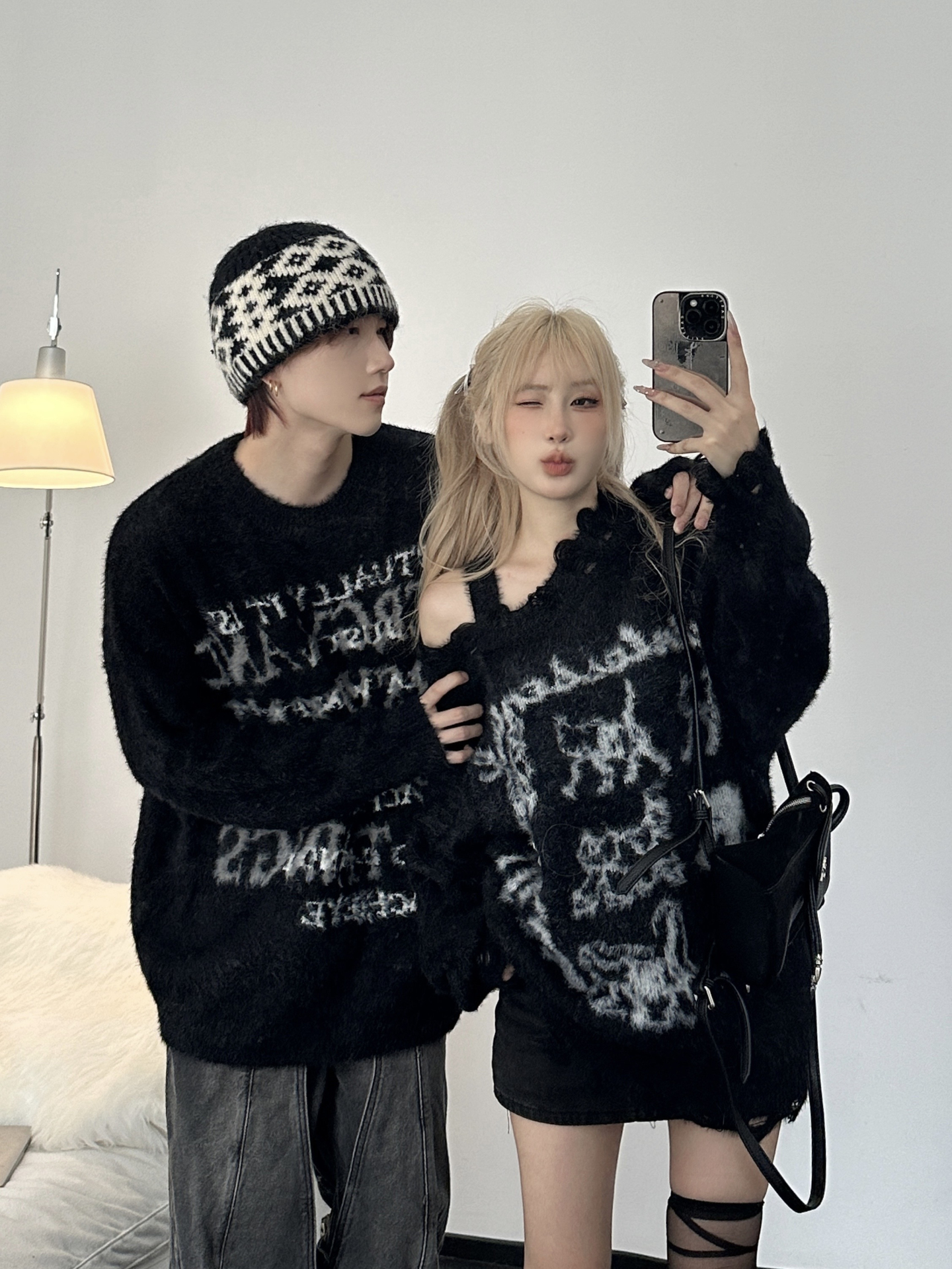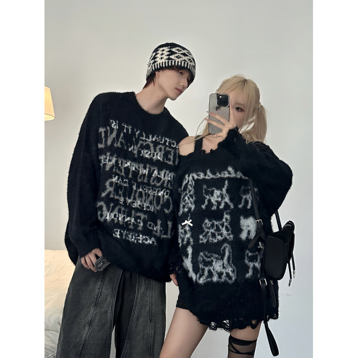 美式潮牌毛衣男女情侶裝秋冬寬松慵懶風仿貂毛軟糯小衆露肩針織衫