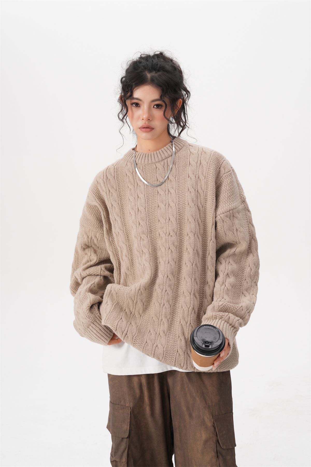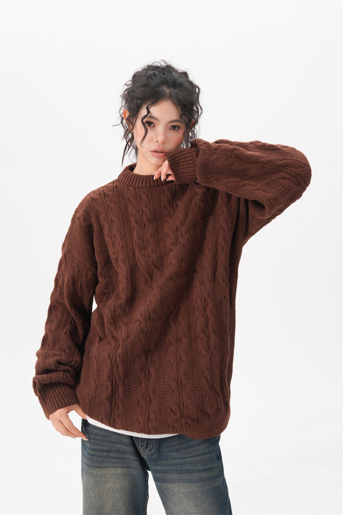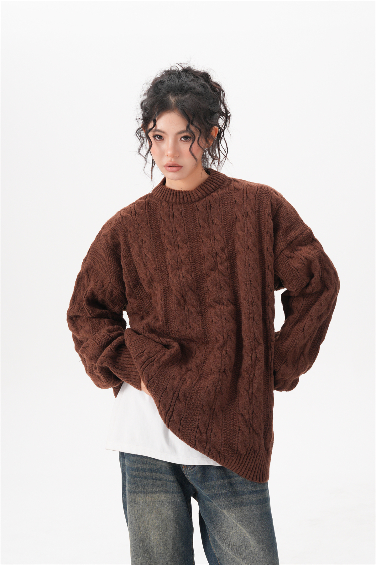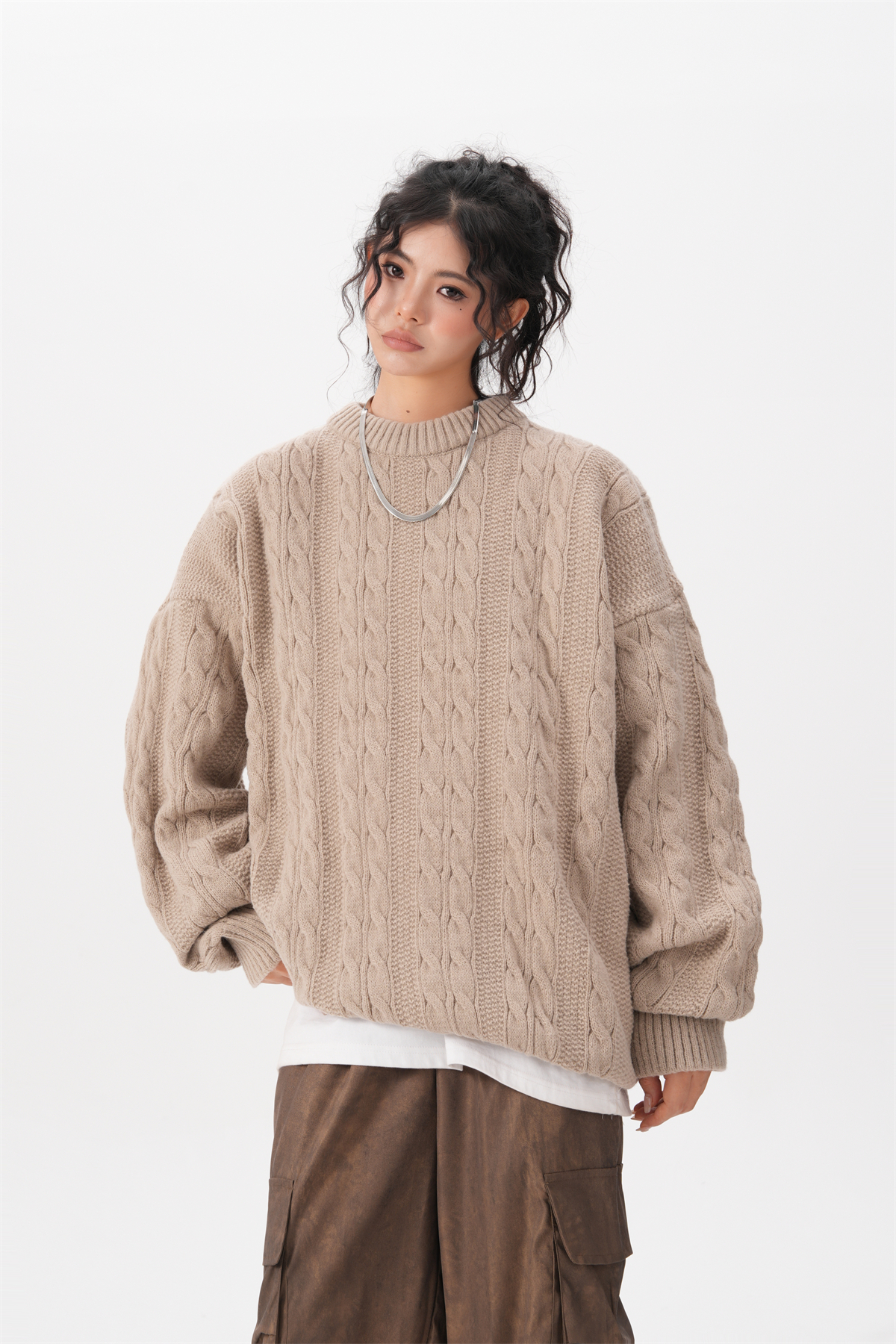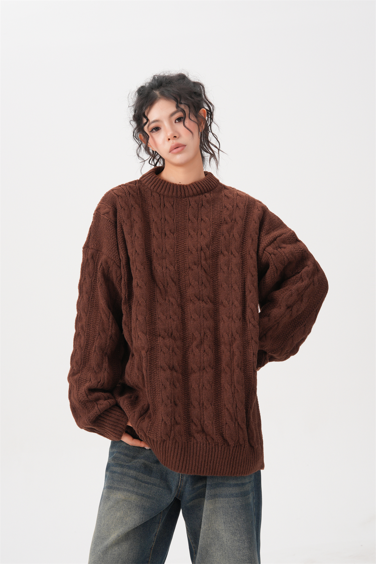 BWKA美式復古麻花圓領毛衣女男秋冬重磅加厚慵懶風寬松情侶針織衫