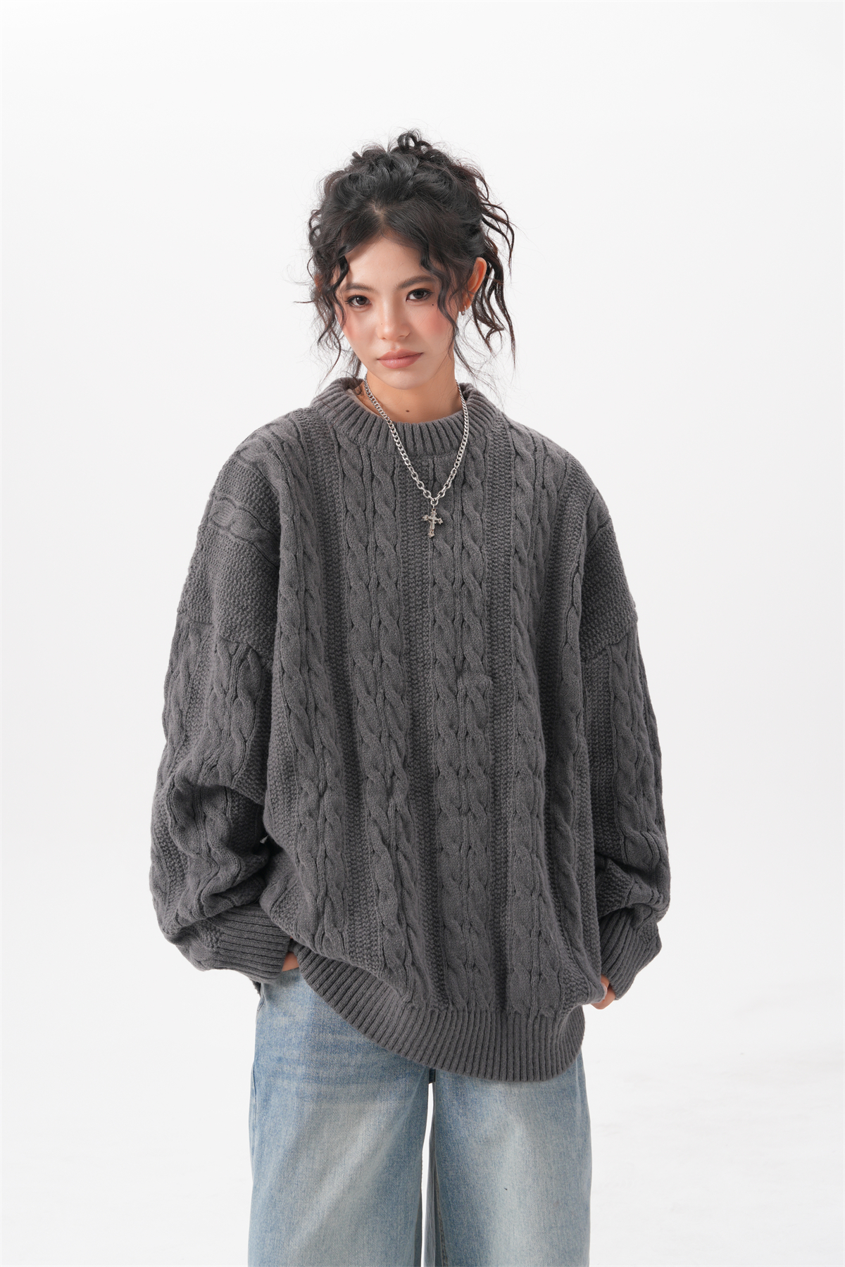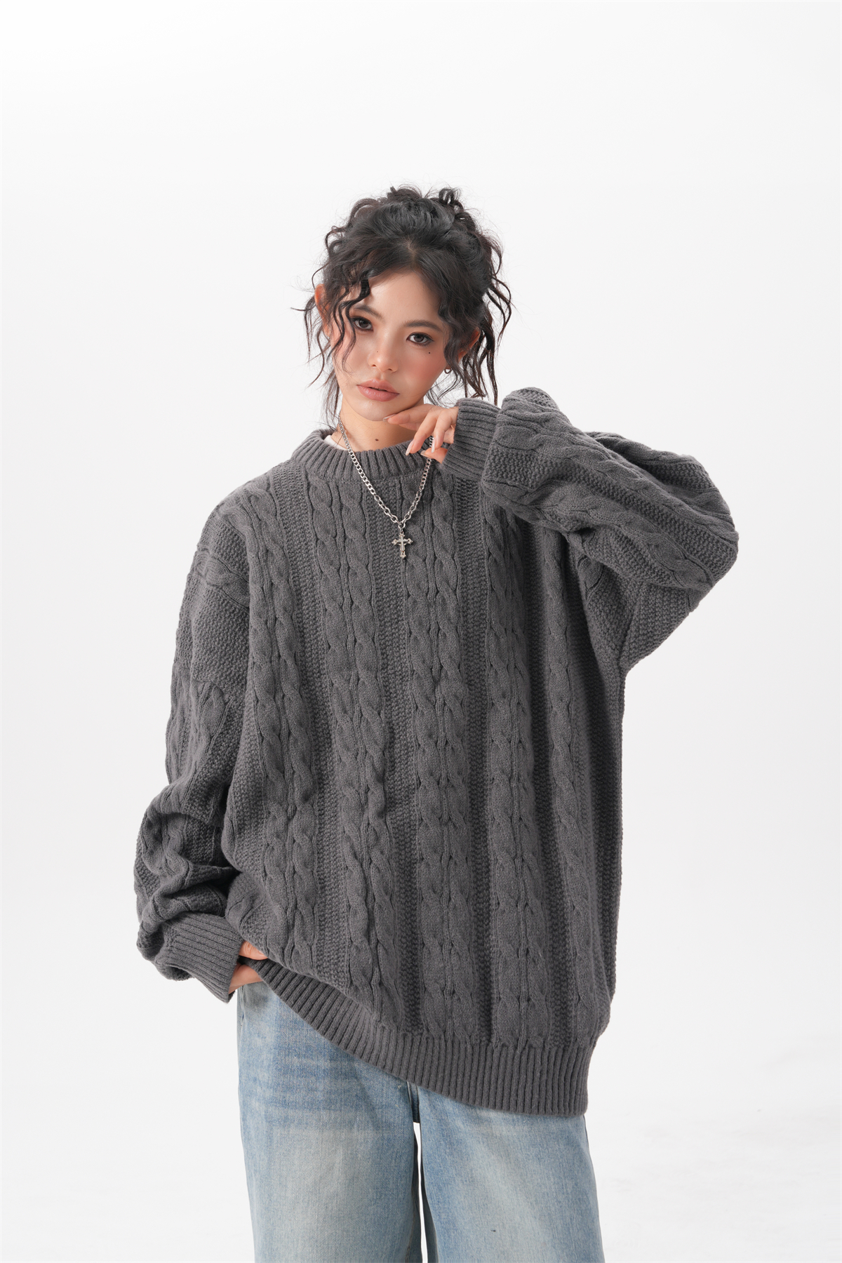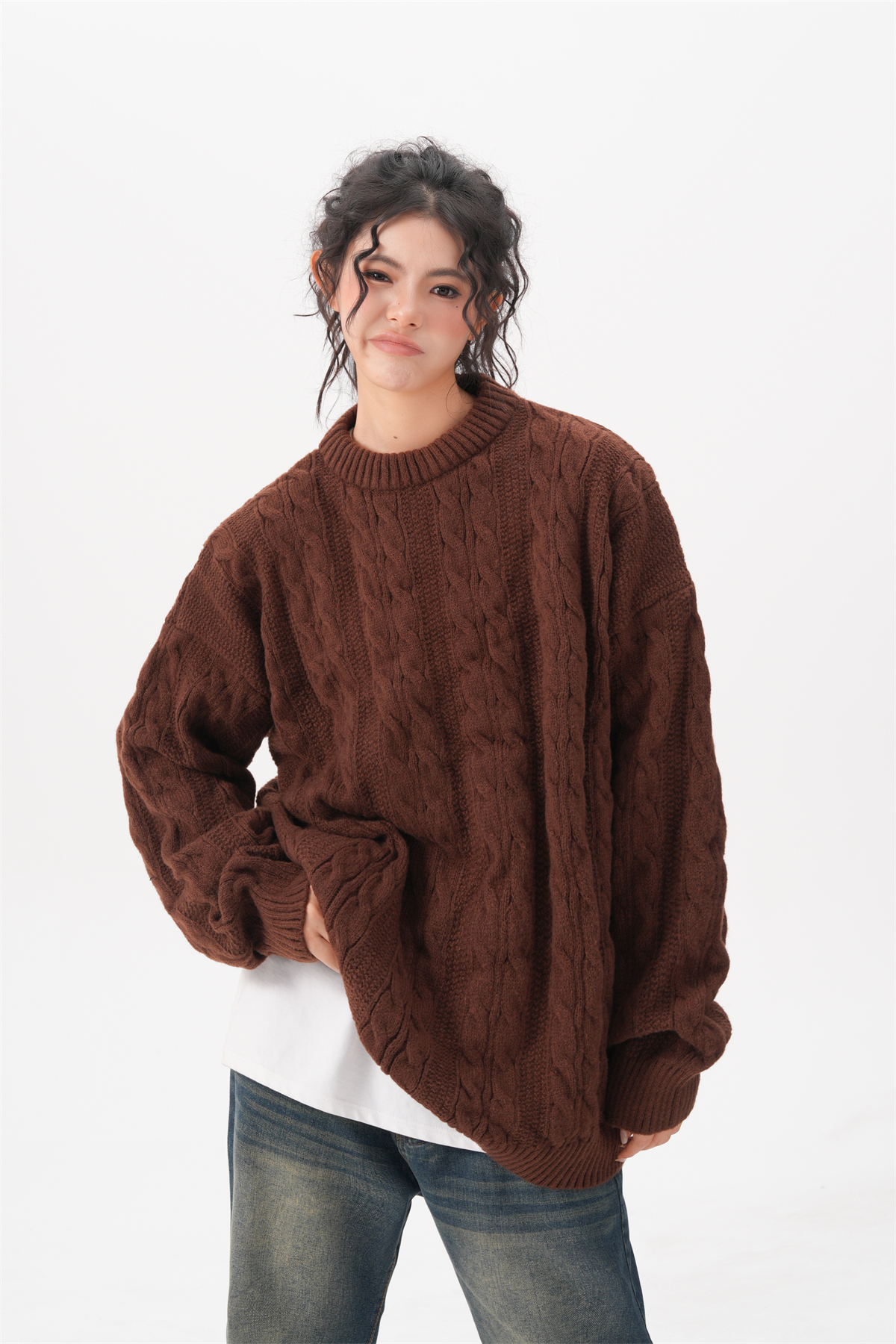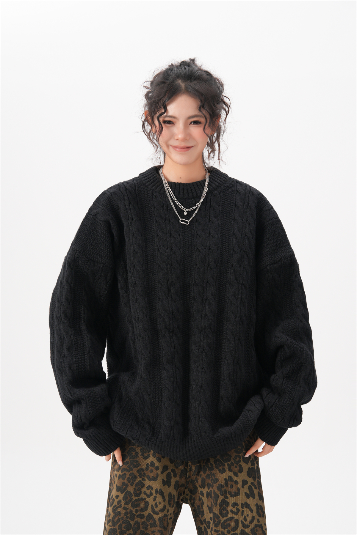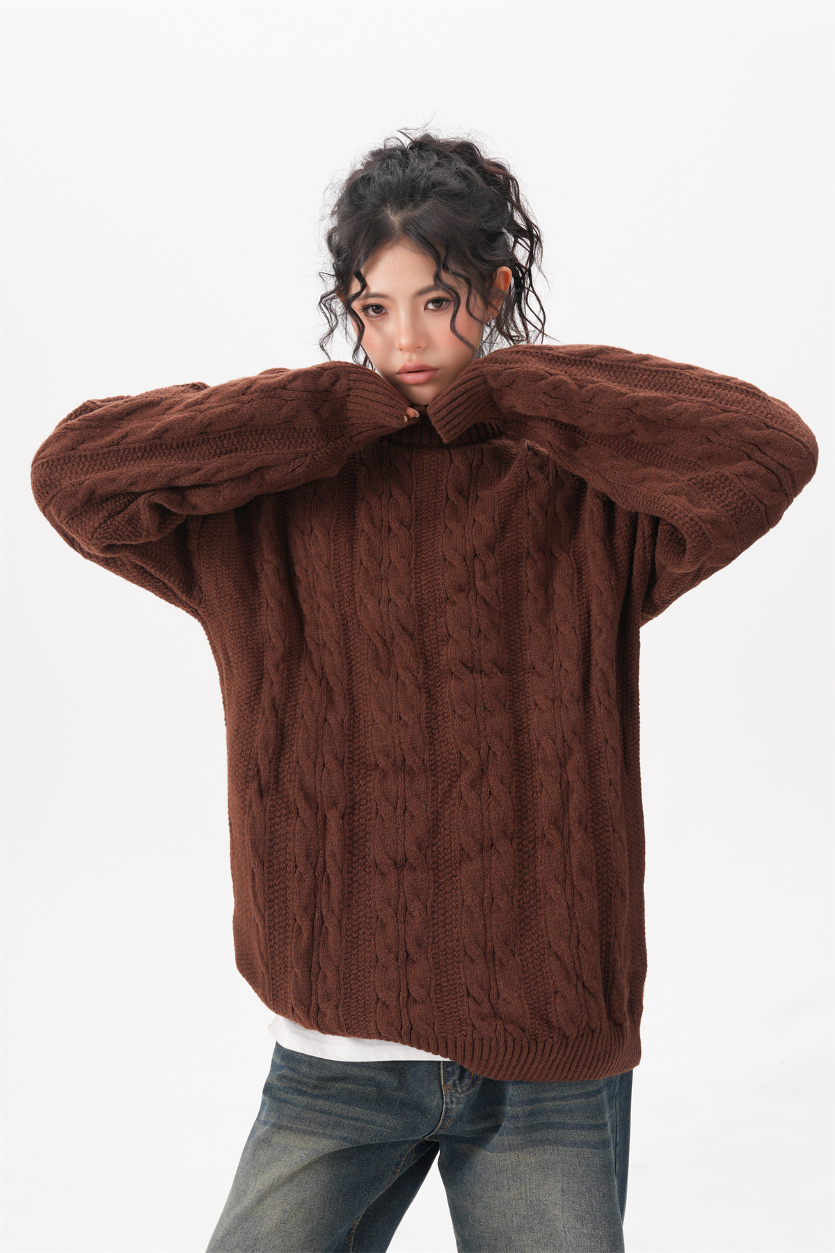 BWKA美式復古麻花圓領毛衣女男秋冬重磅加厚慵懶風寬松情侶針織衫