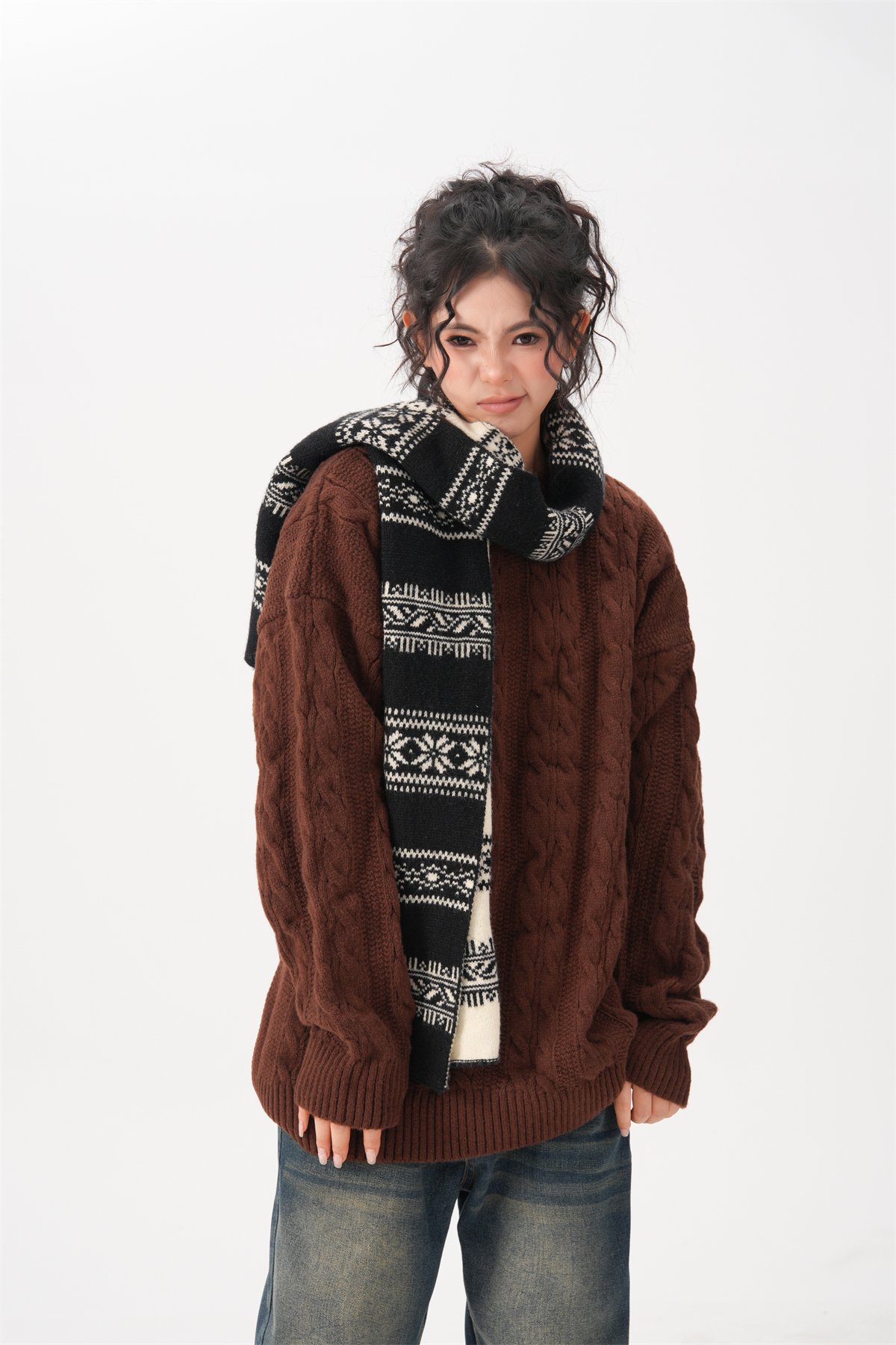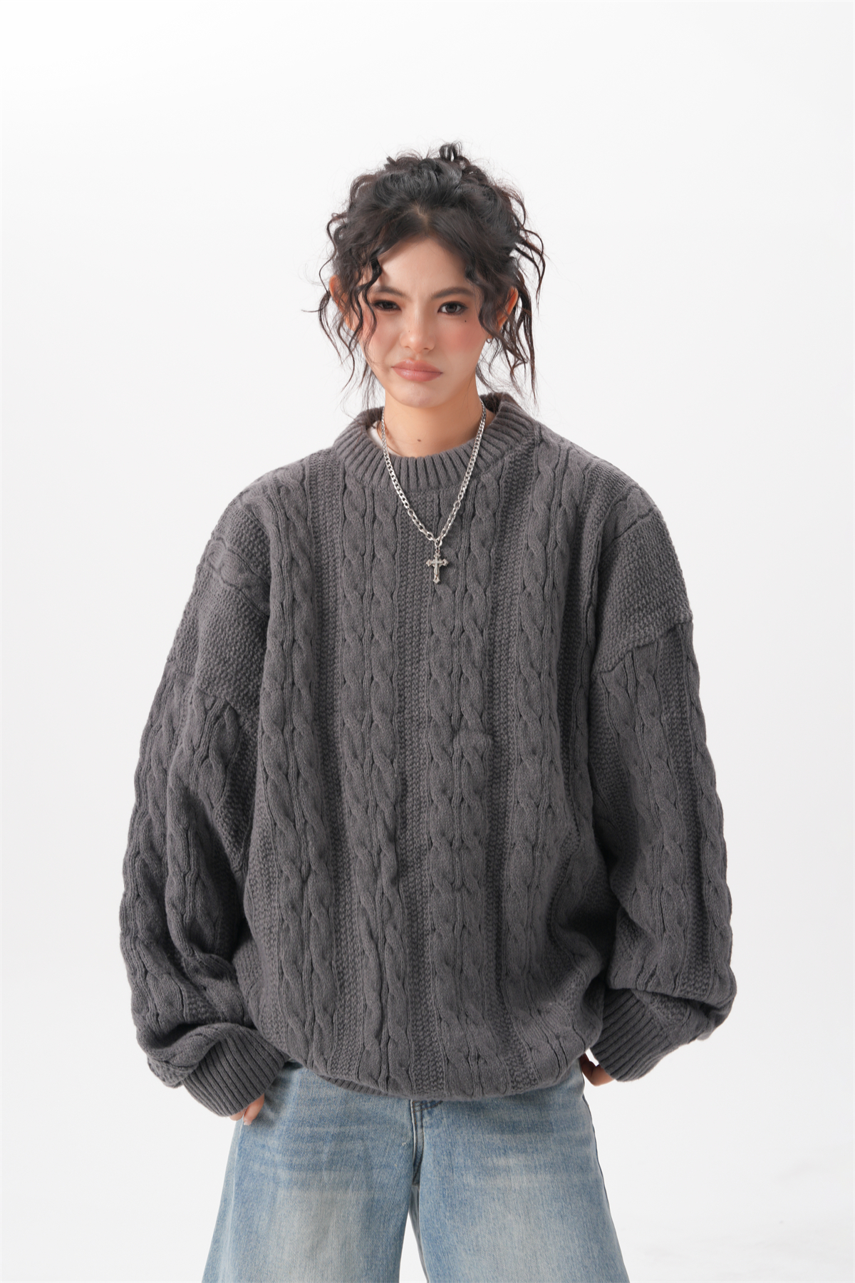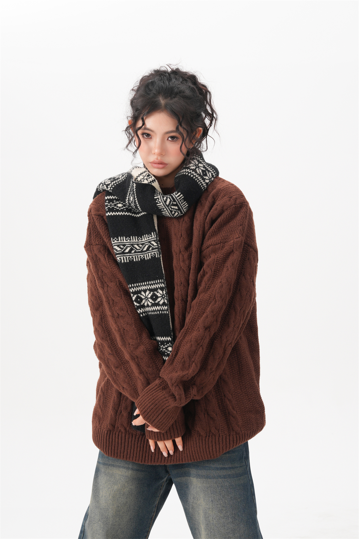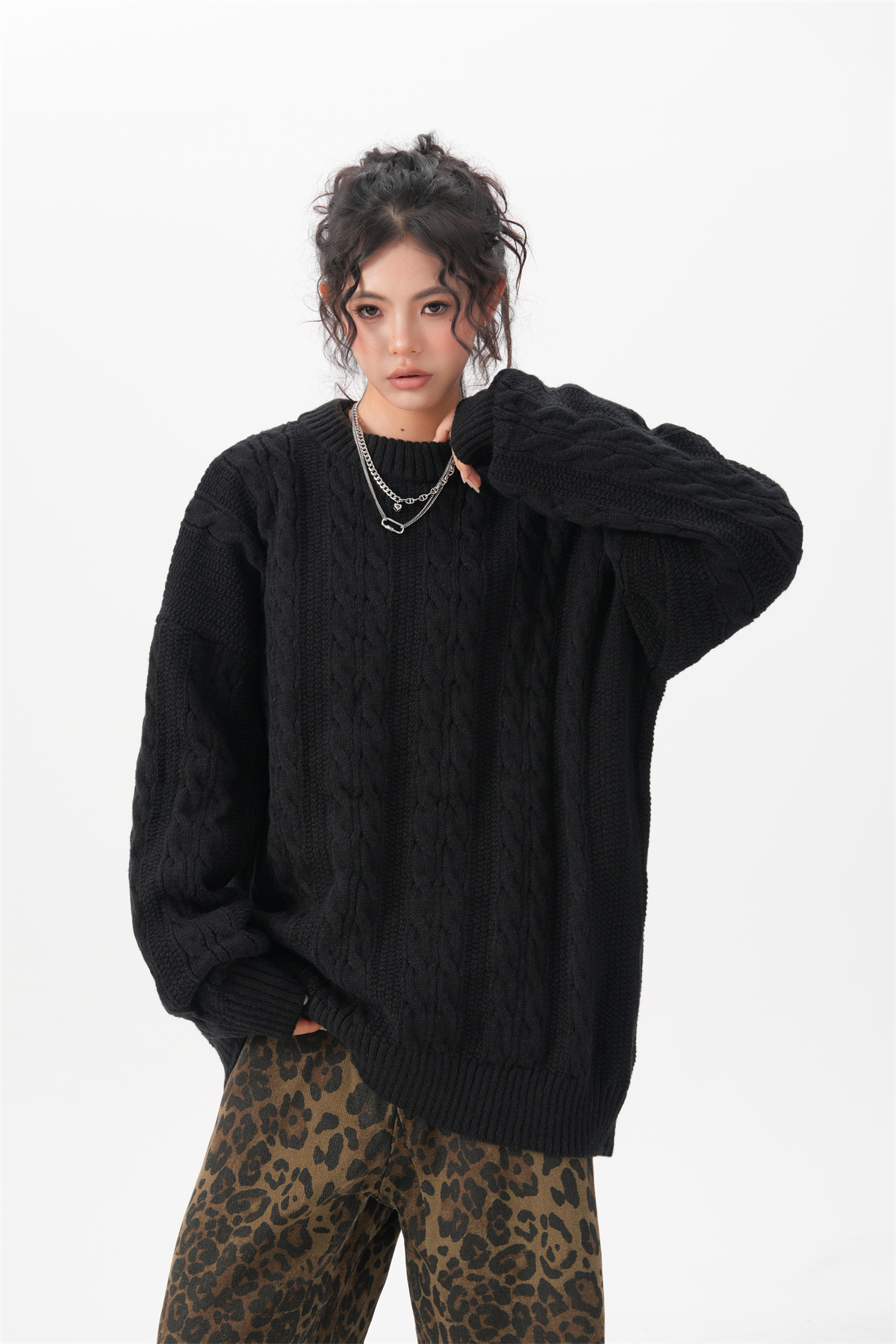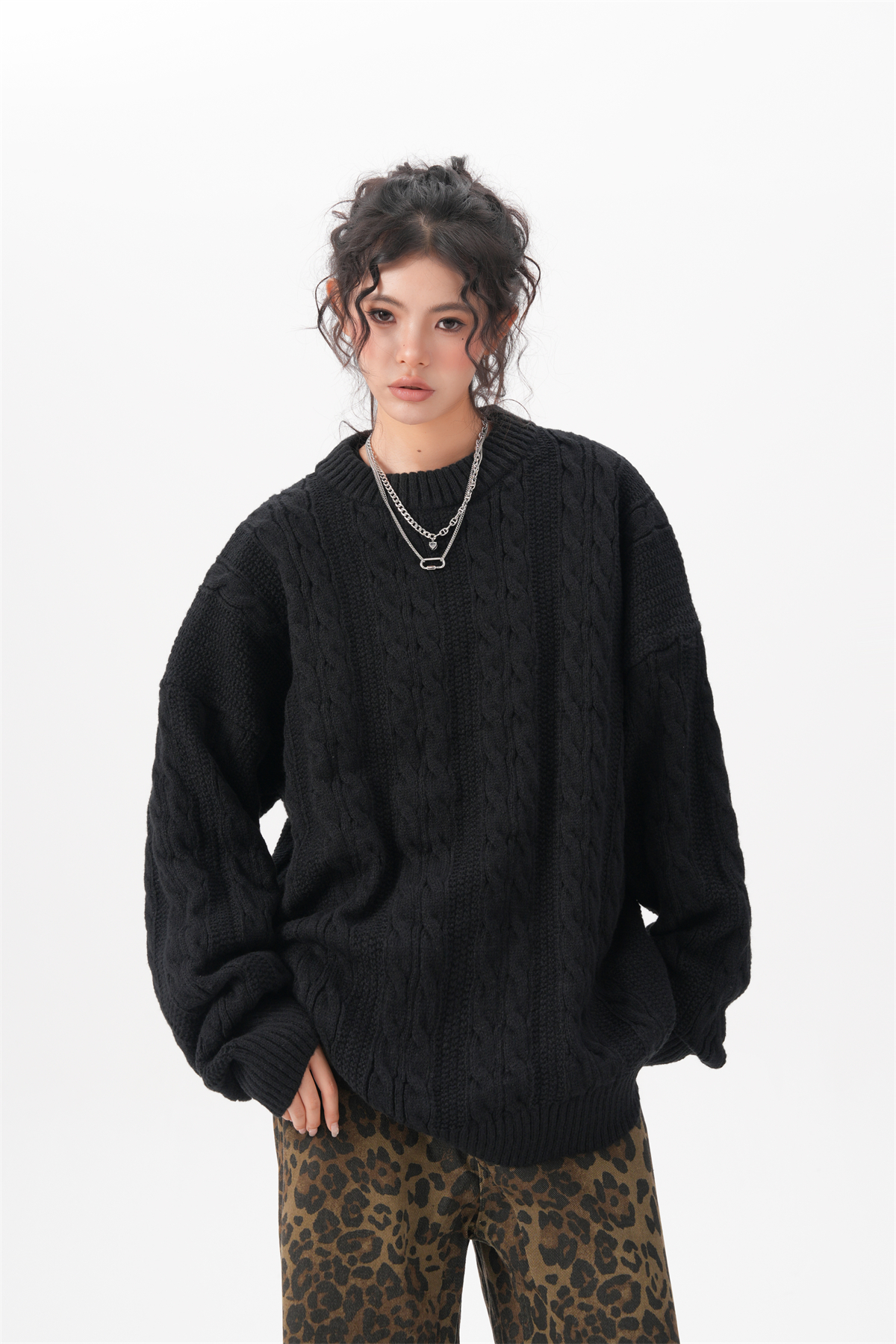 BWKA美式復古麻花圓領毛衣女男秋冬重磅加厚慵懶風寬松情侶針織衫