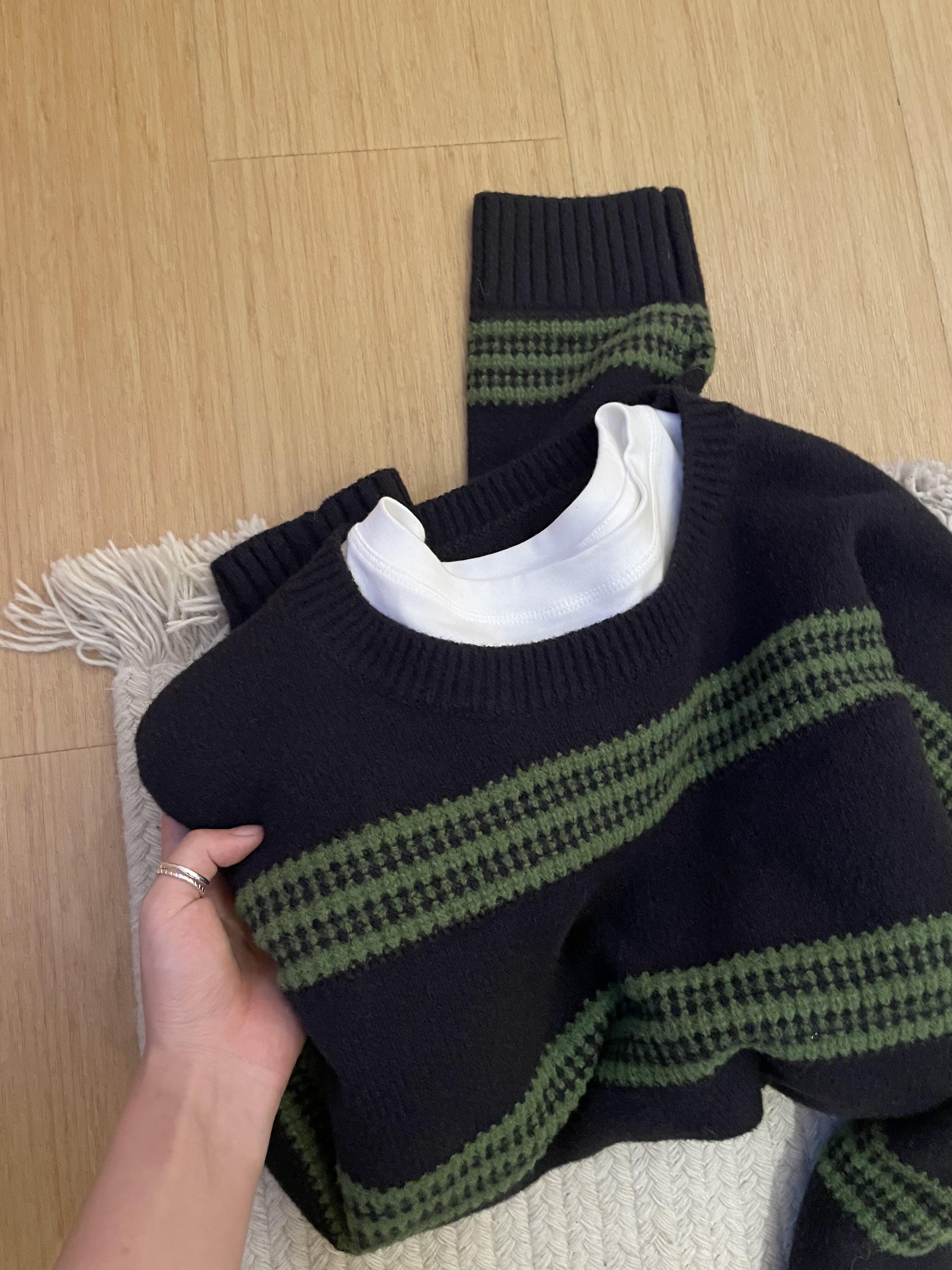韓系條紋撞色毛衣女秋冬新款高級感寬松慵懶風軟糯內搭針織衫上衣