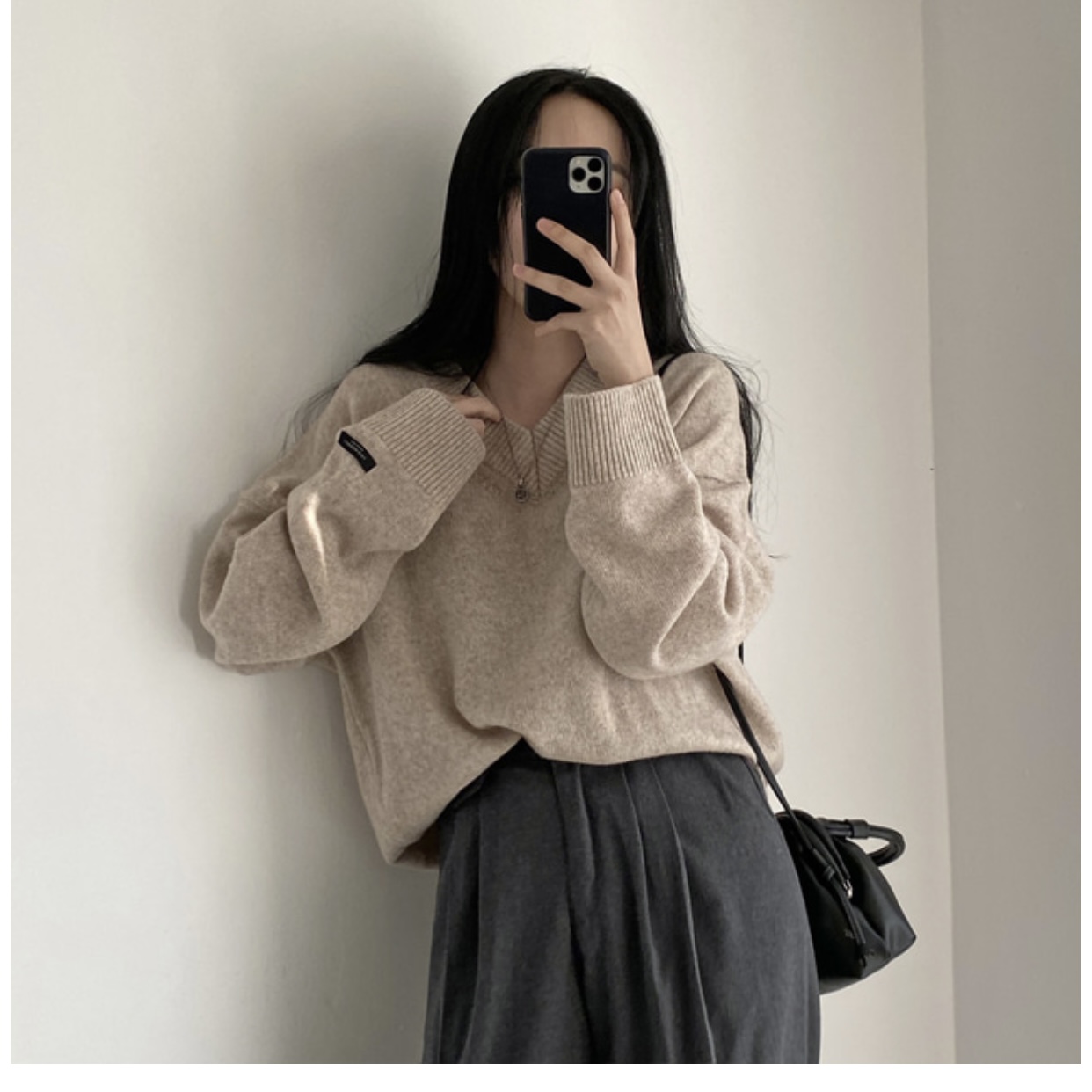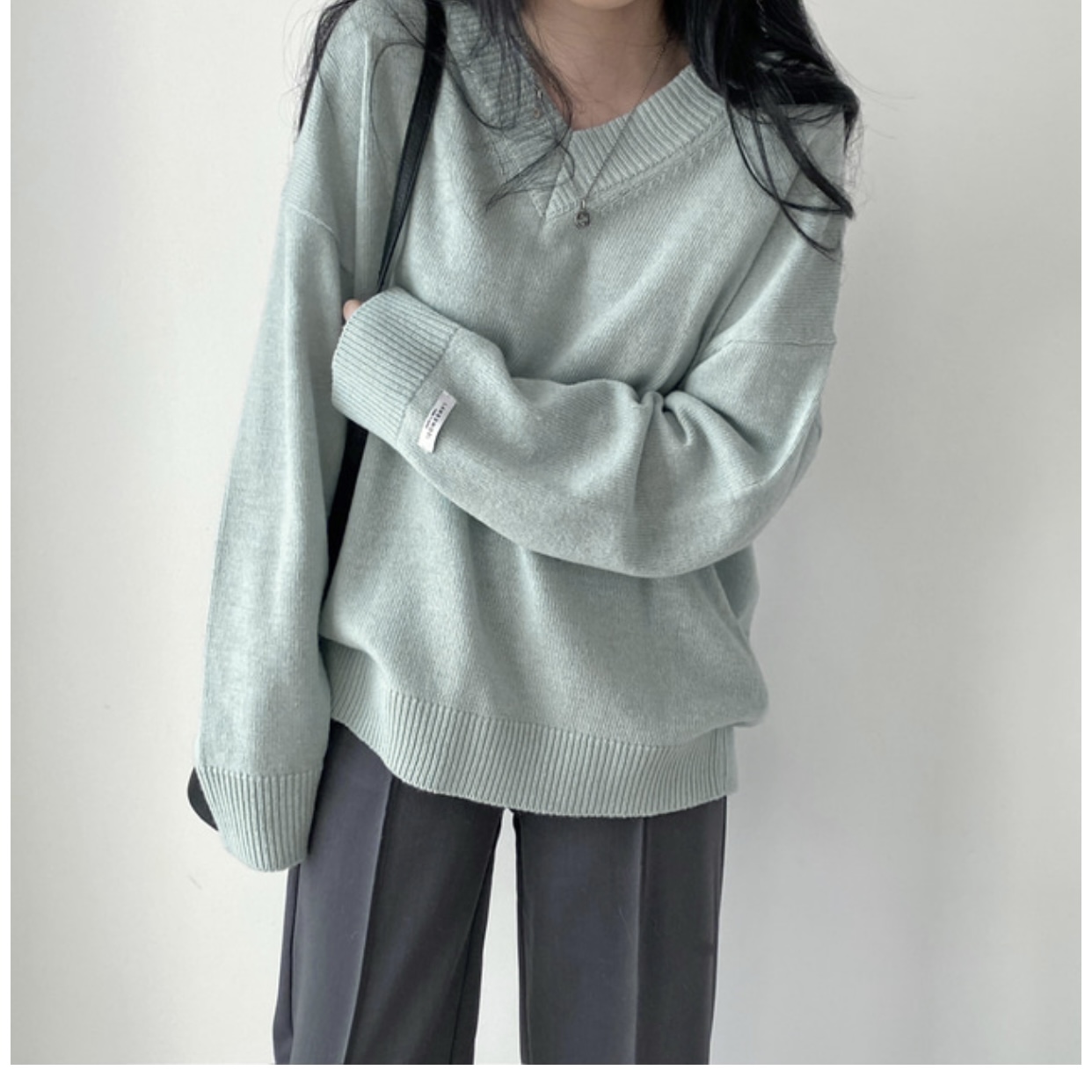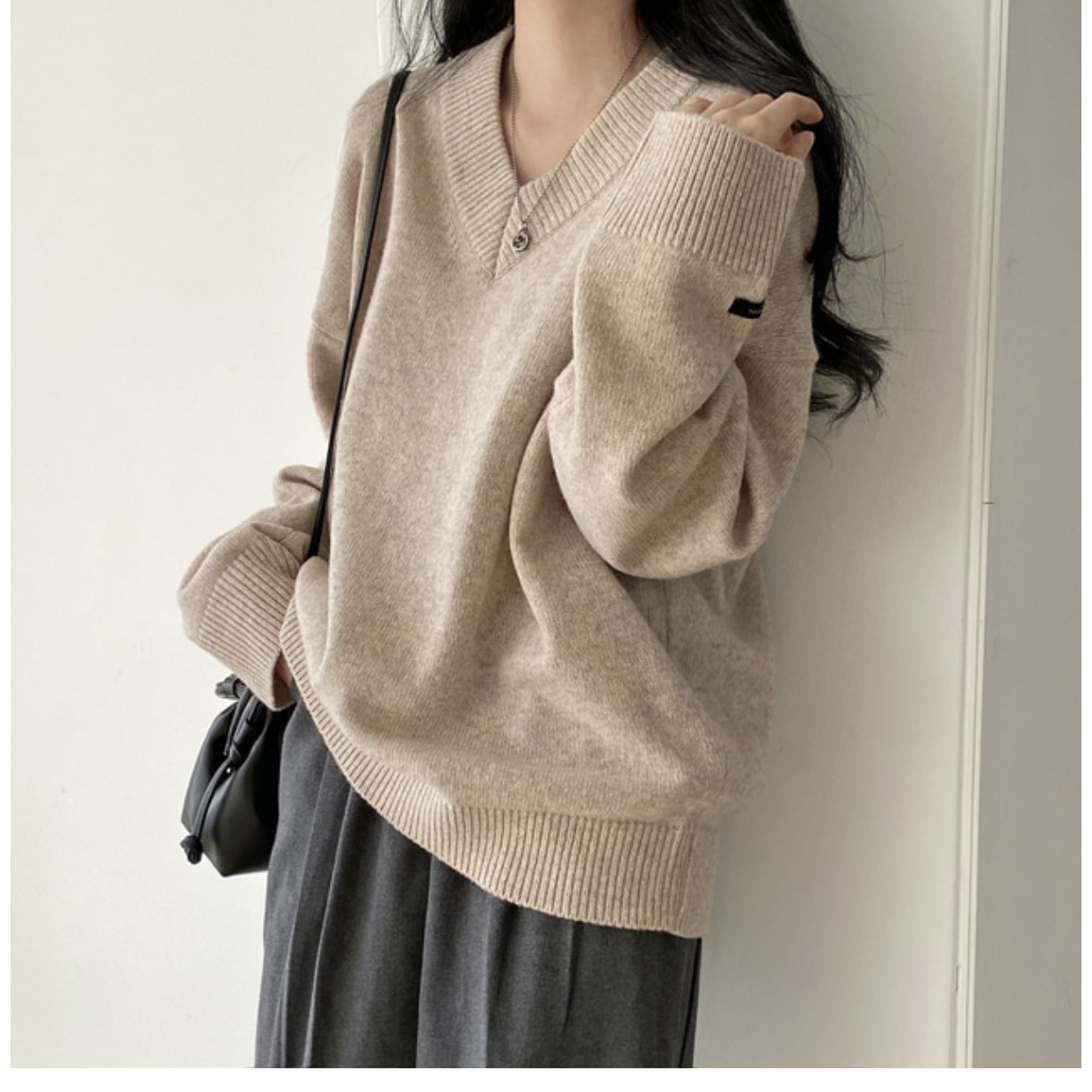 大碼慵懶風灰色v領毛衣女秋季胖mm中長款寬松顯瘦外穿針織上衣
