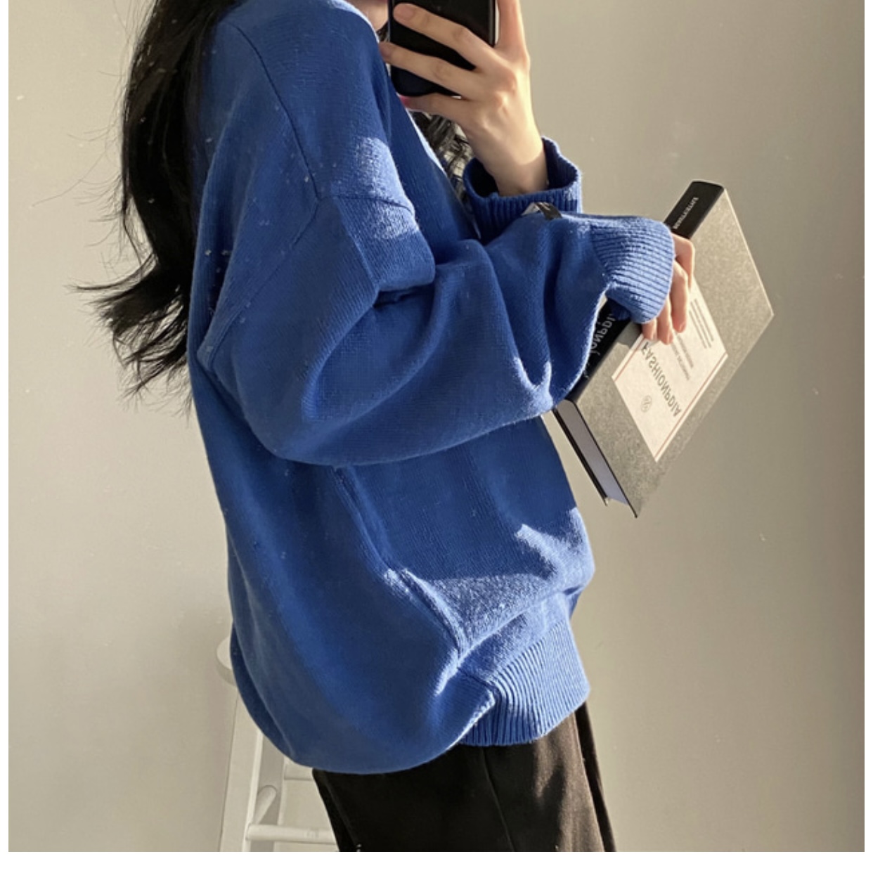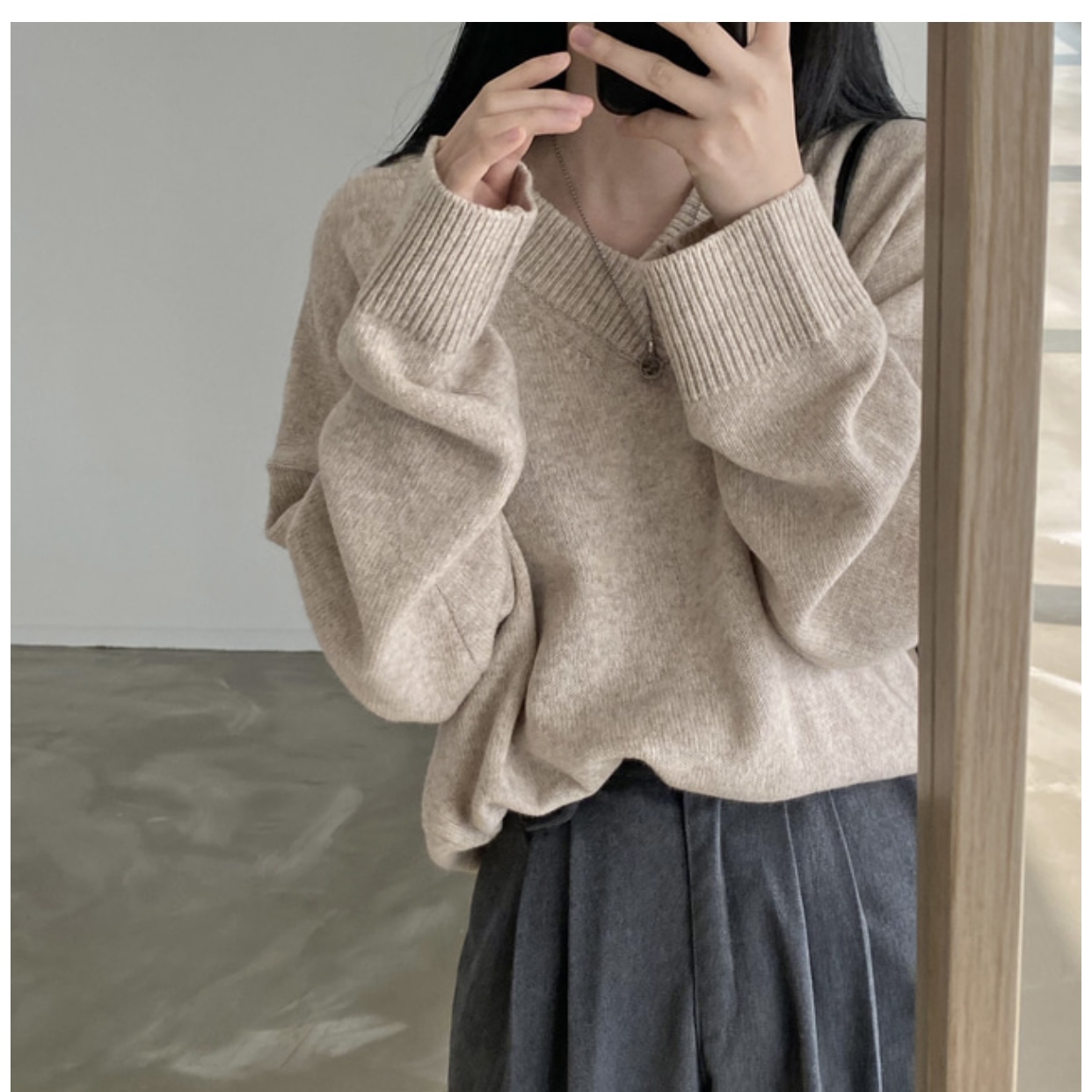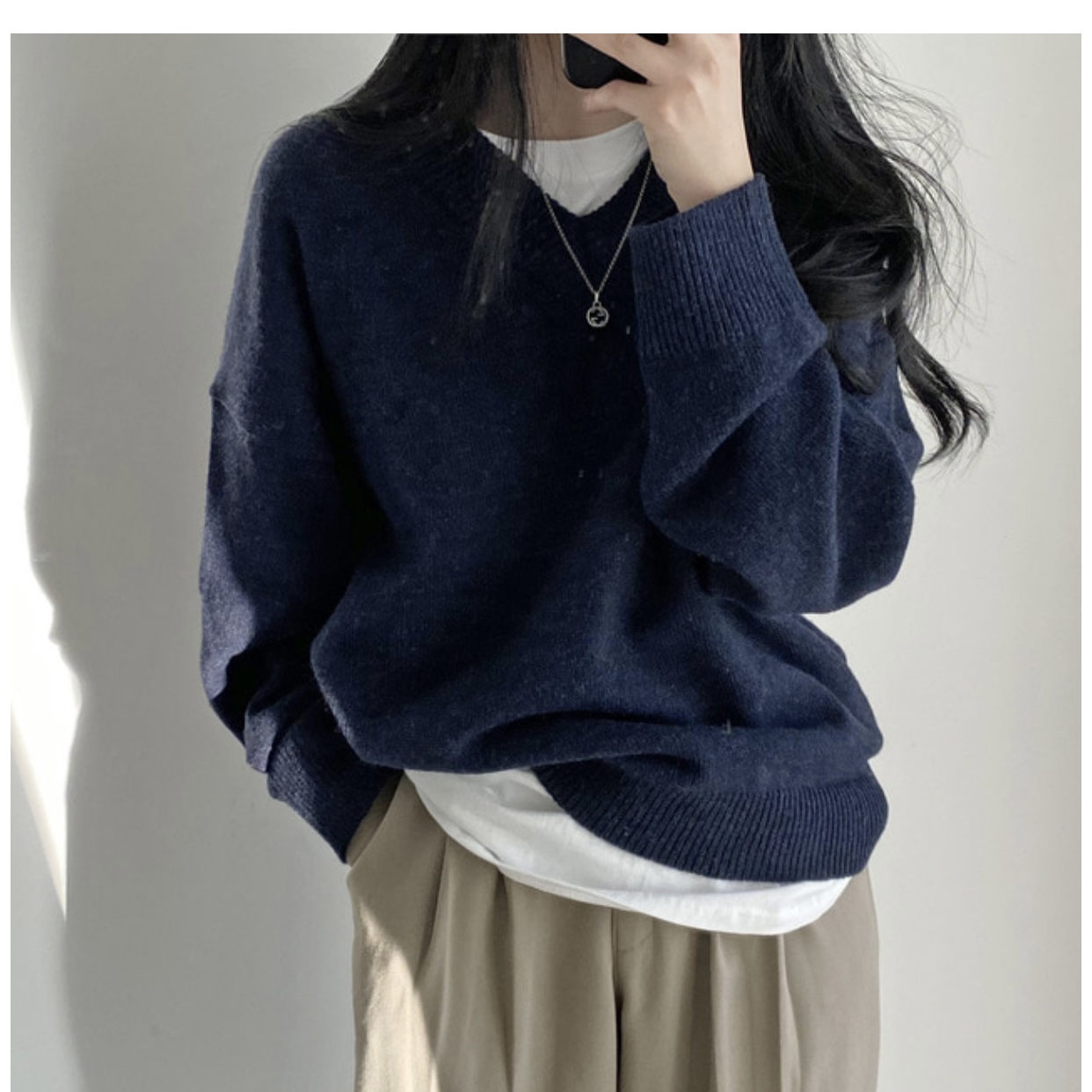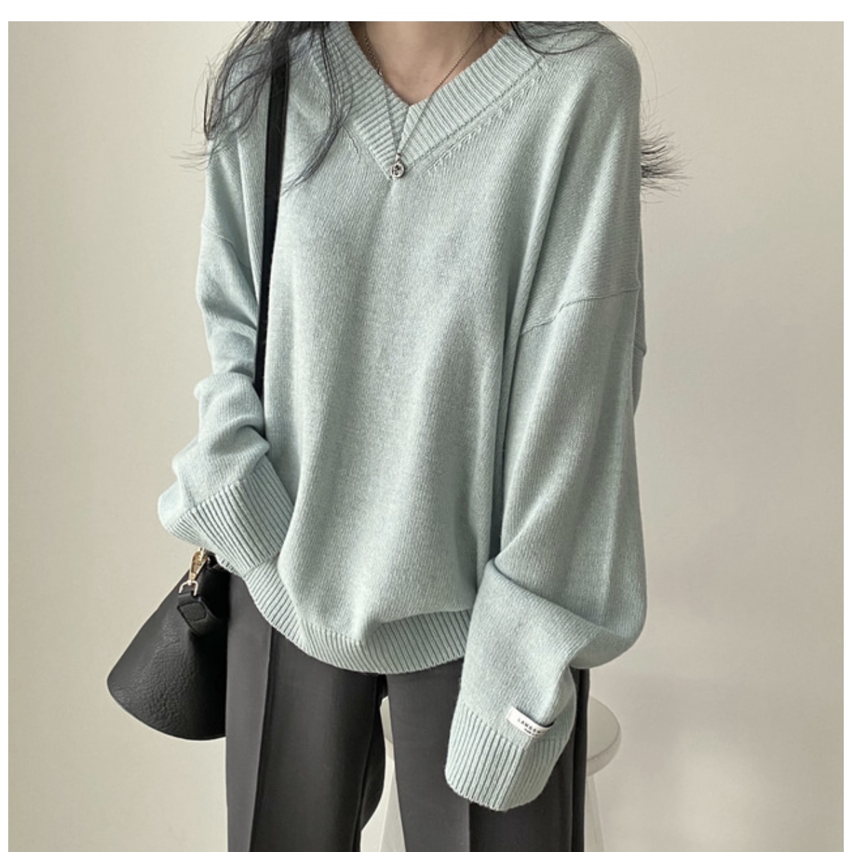 大碼慵懶風灰色v領毛衣女秋季胖mm中長款寬松顯瘦外穿針織上衣