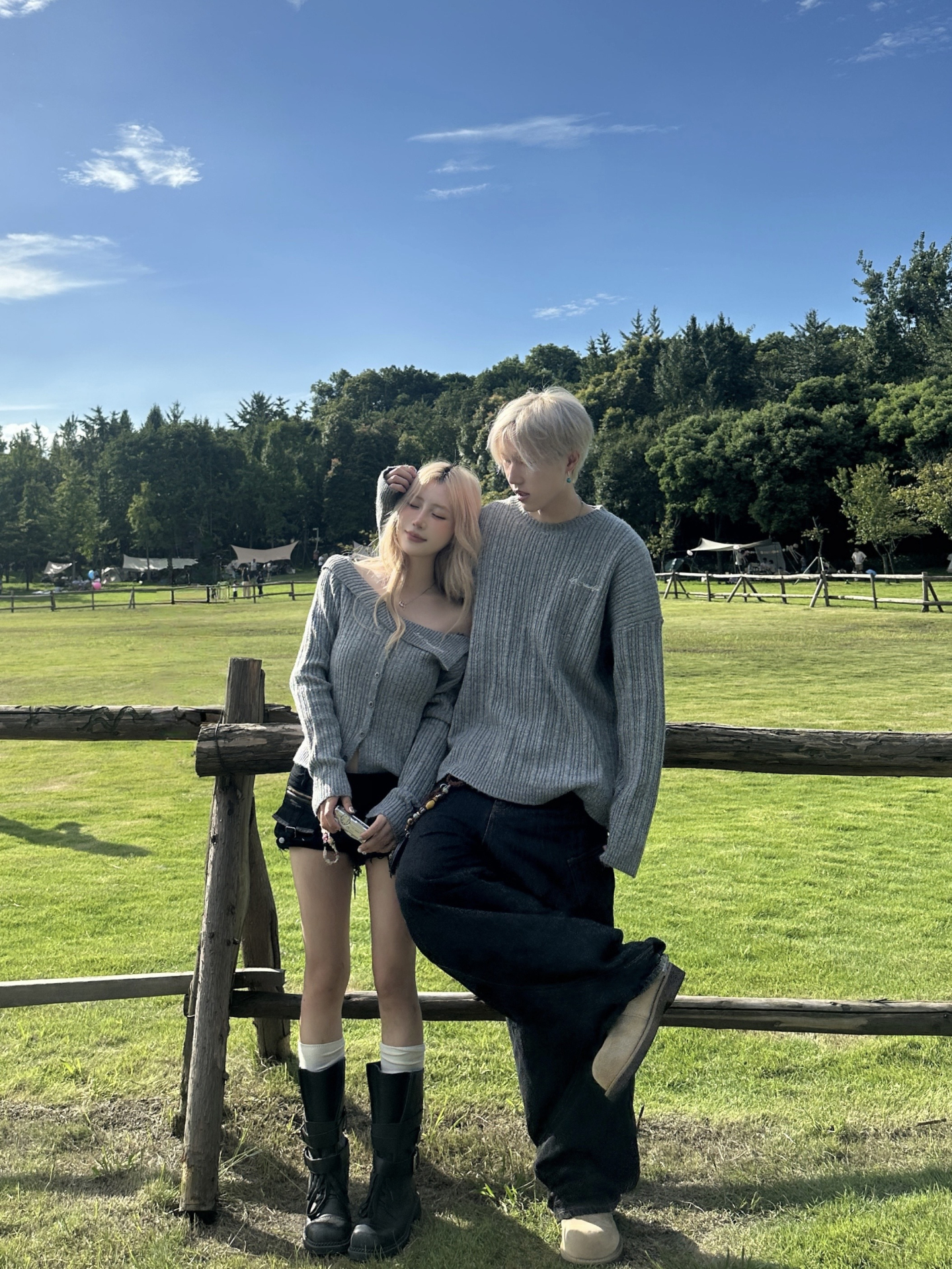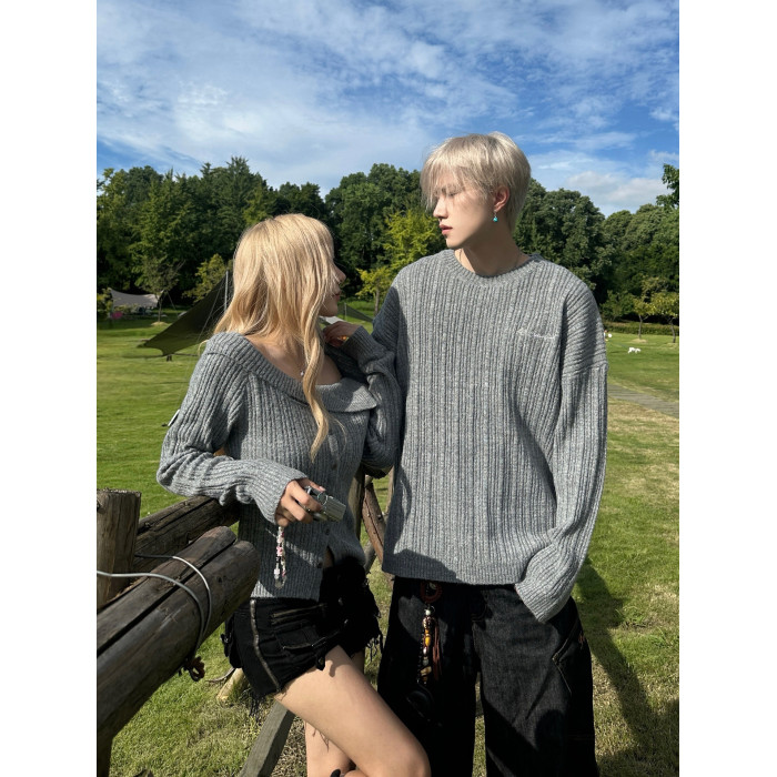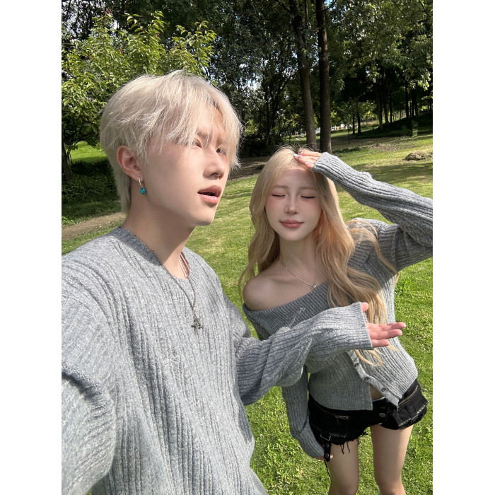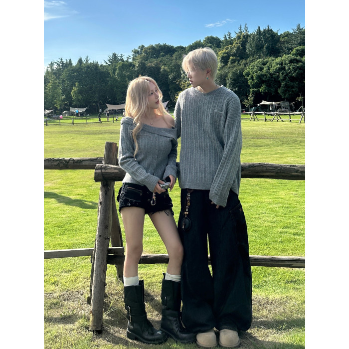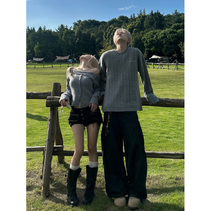 小衆設計感情侶裝毛衣2025秋冬一字肩純欲顯瘦針織衫一長一短上衣