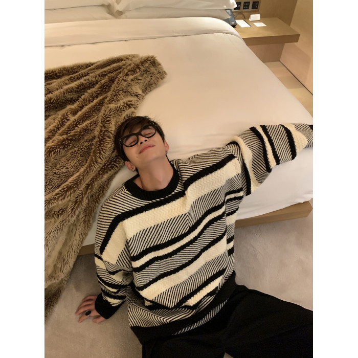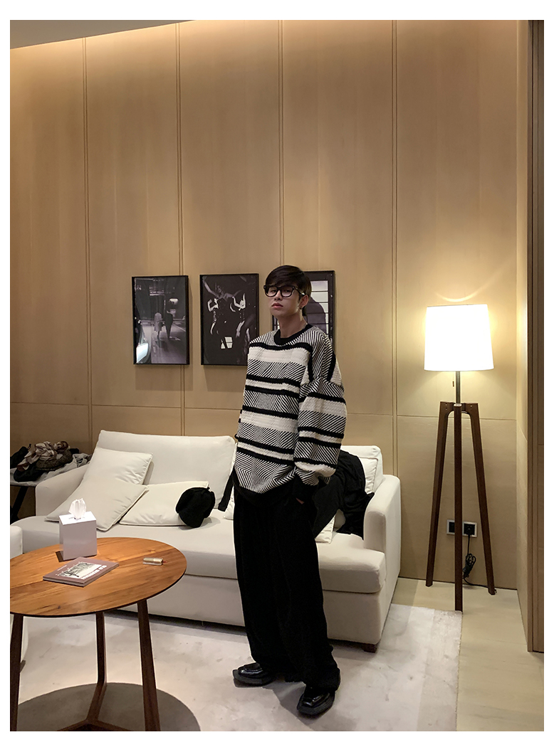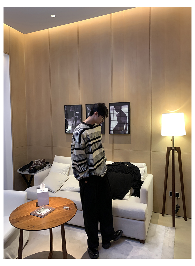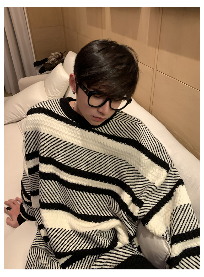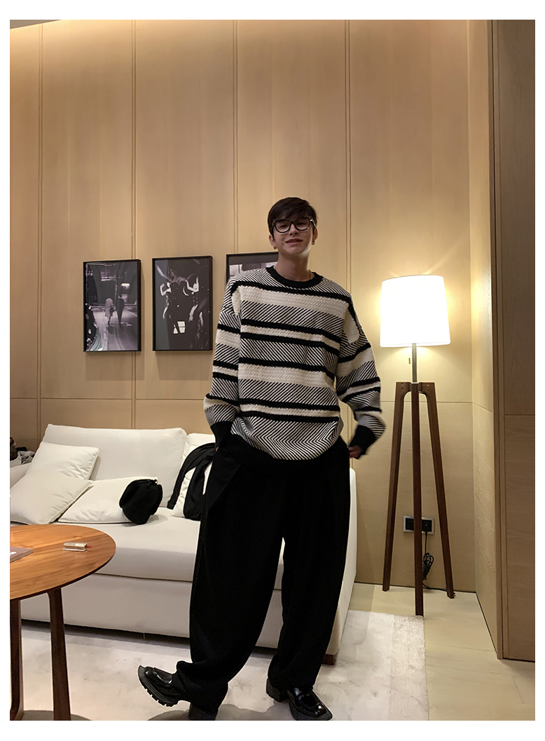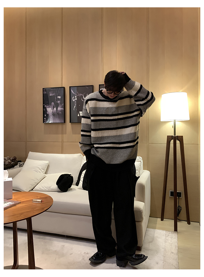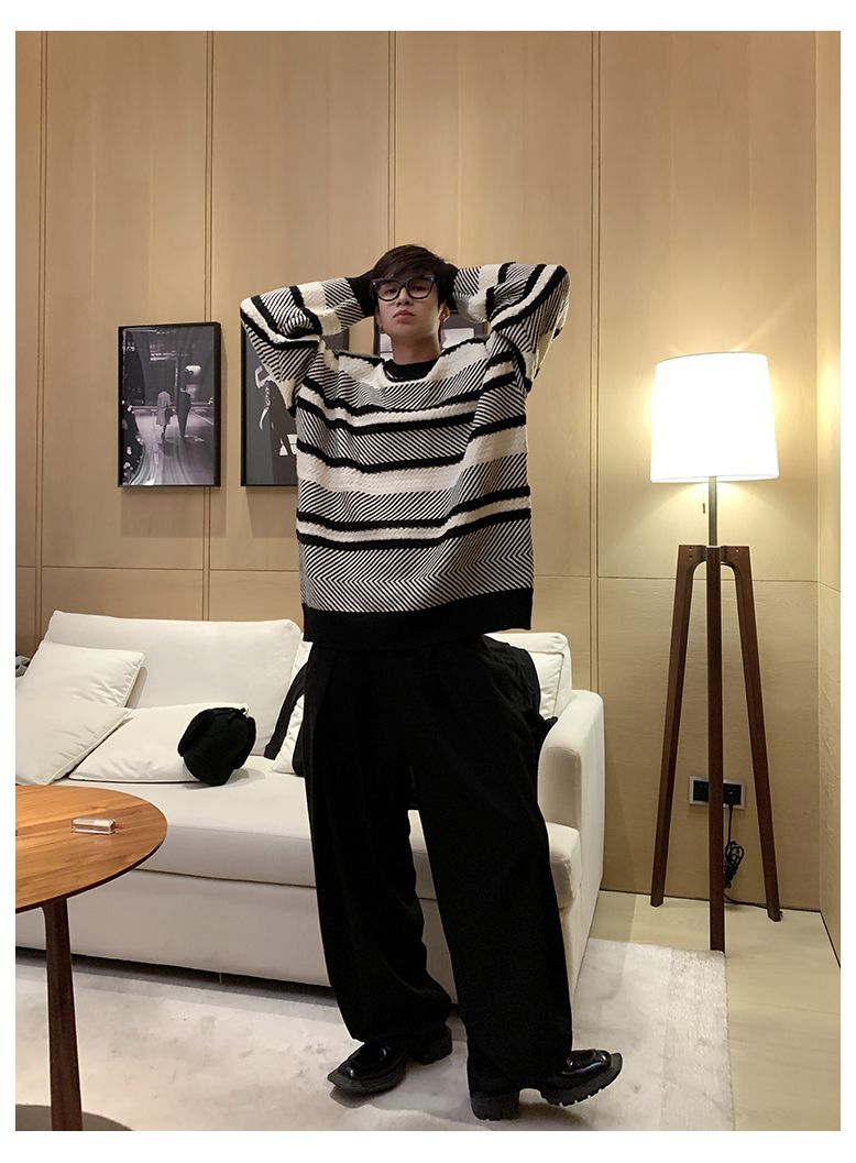 ESC MAN STUDIO/自製 CHIC風個性條紋拼色 寬松百搭質感套頭毛衣