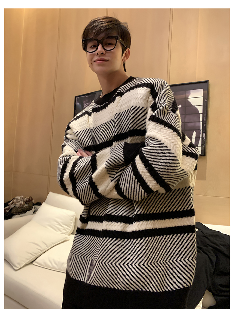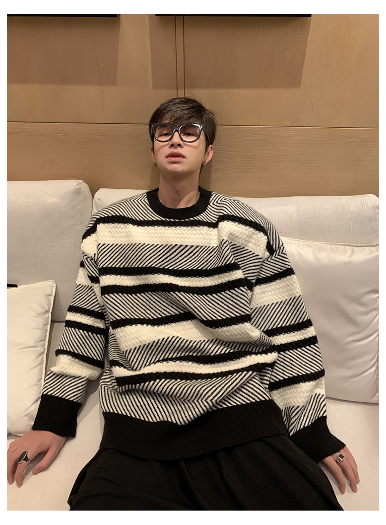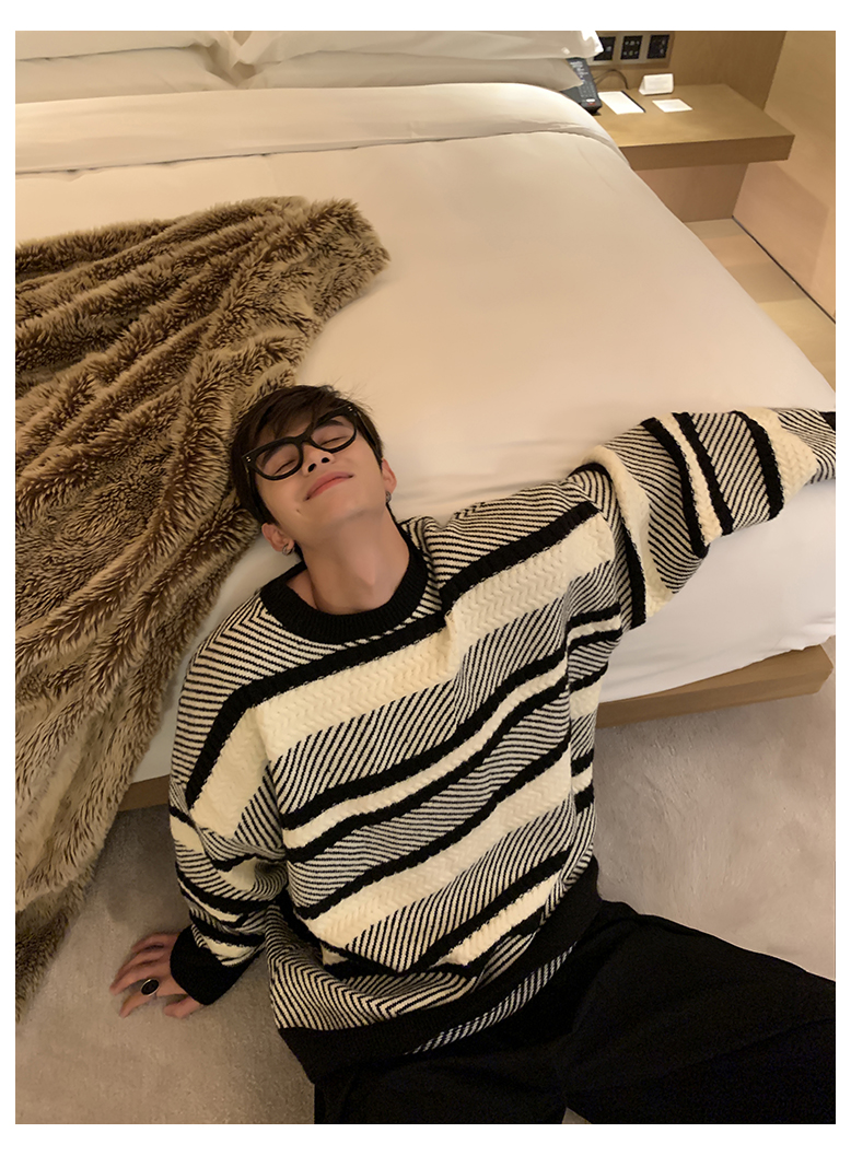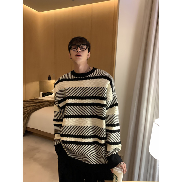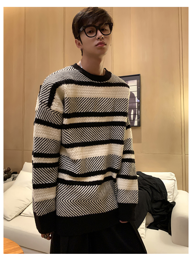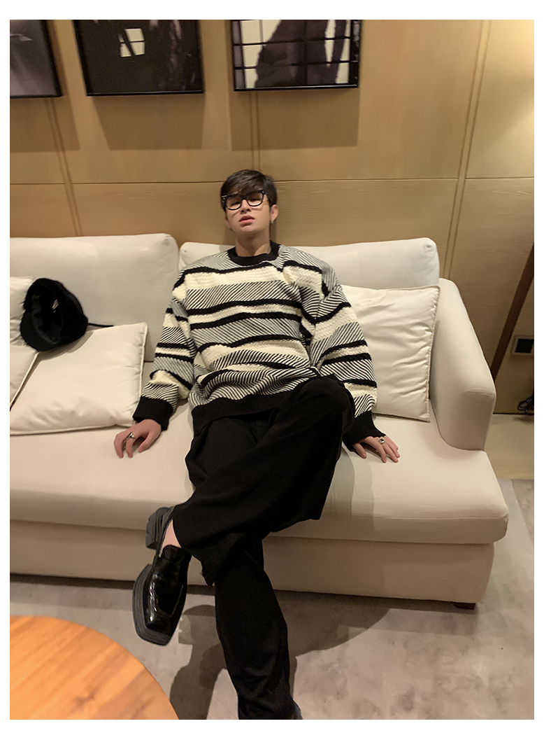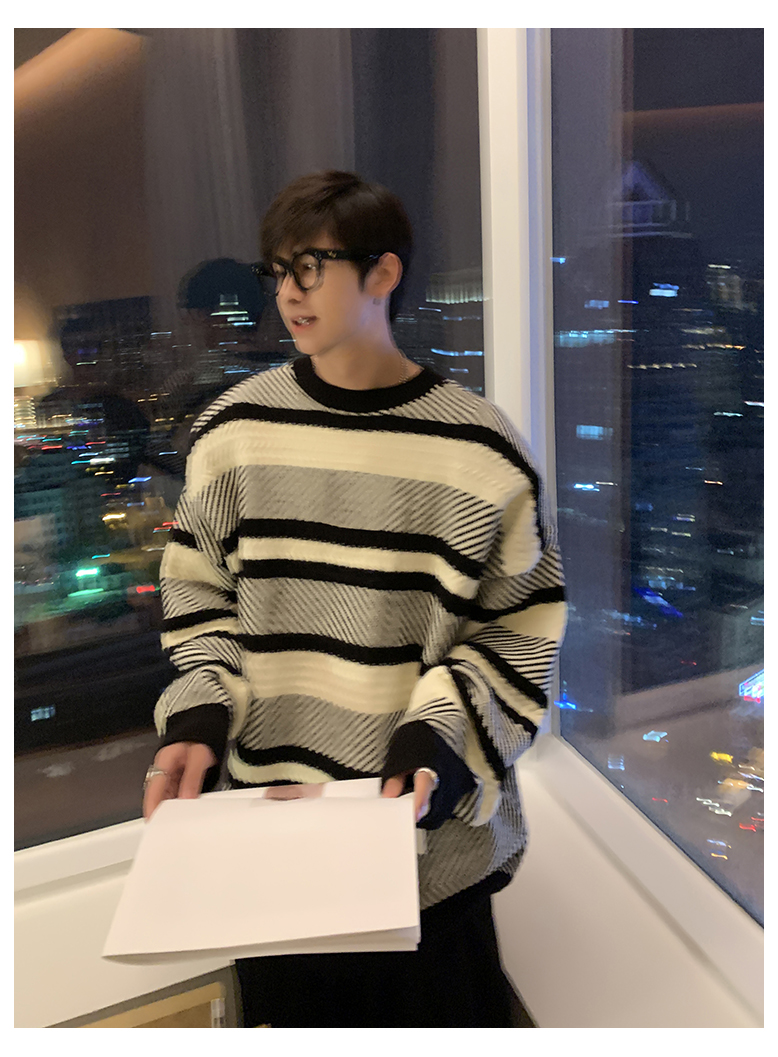 ESC MAN STUDIO/自製 CHIC風個性條紋拼色 寬松百搭質感套頭毛衣