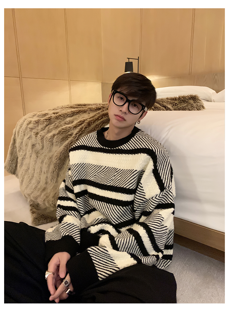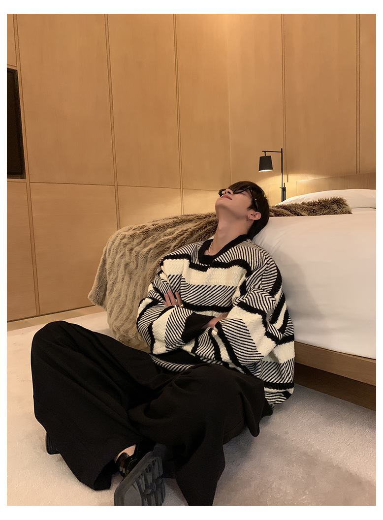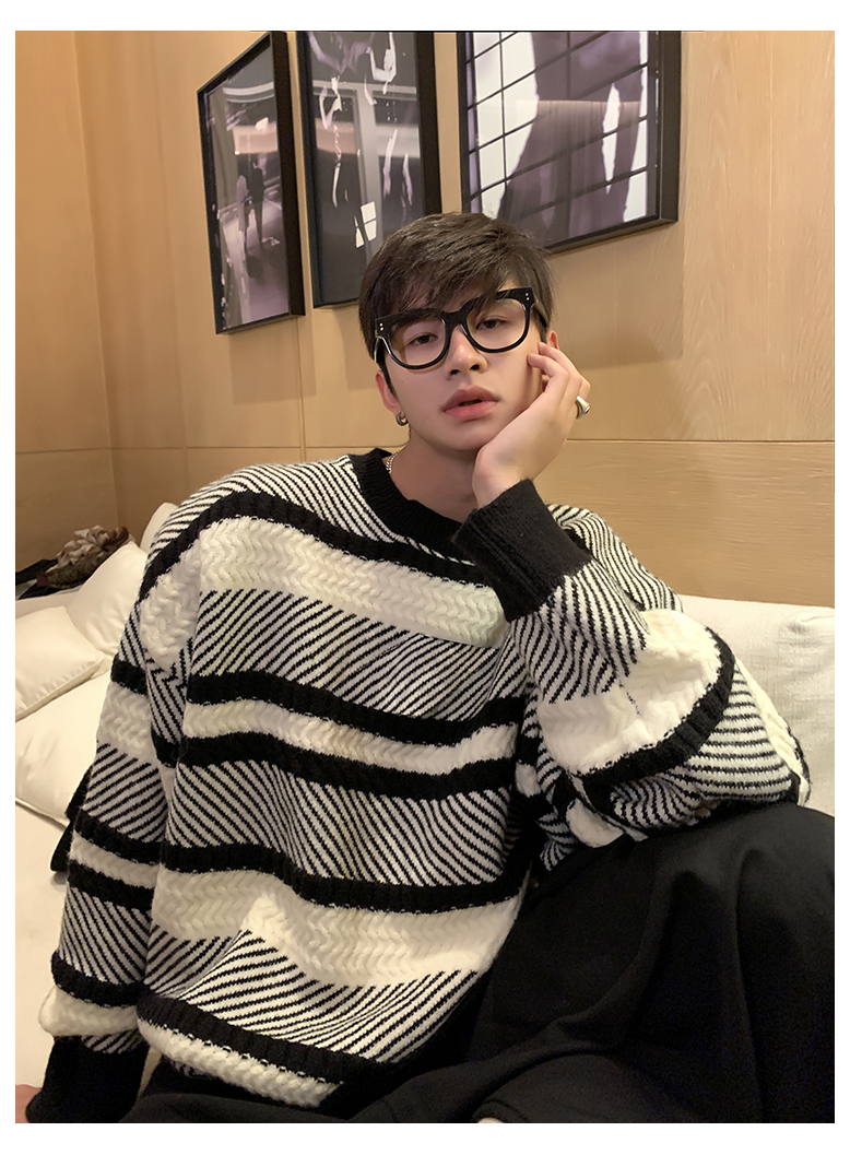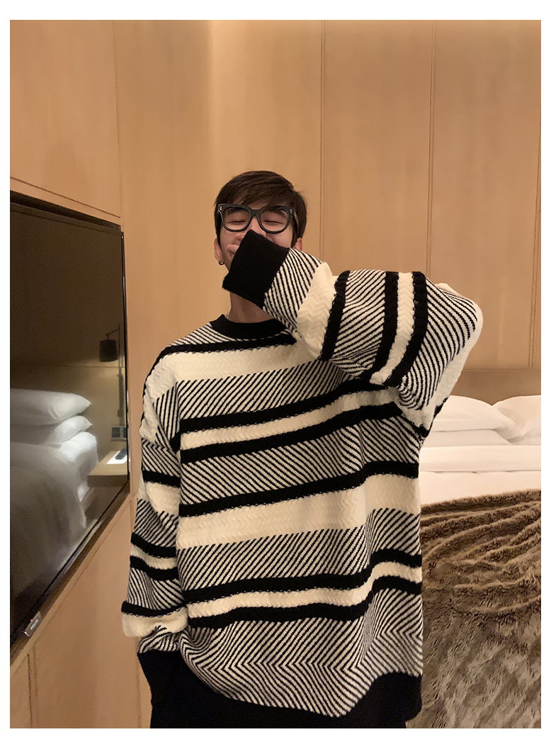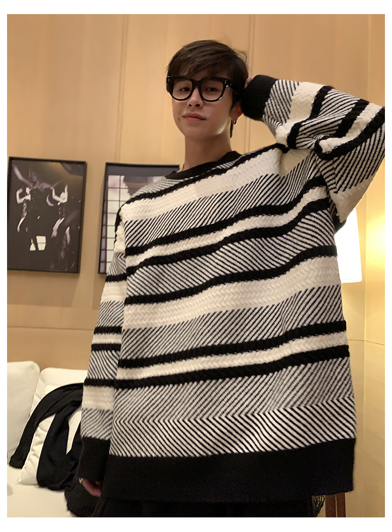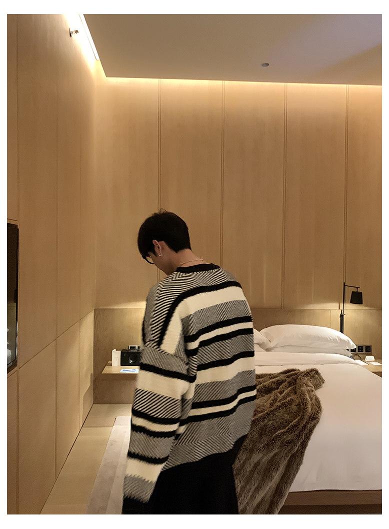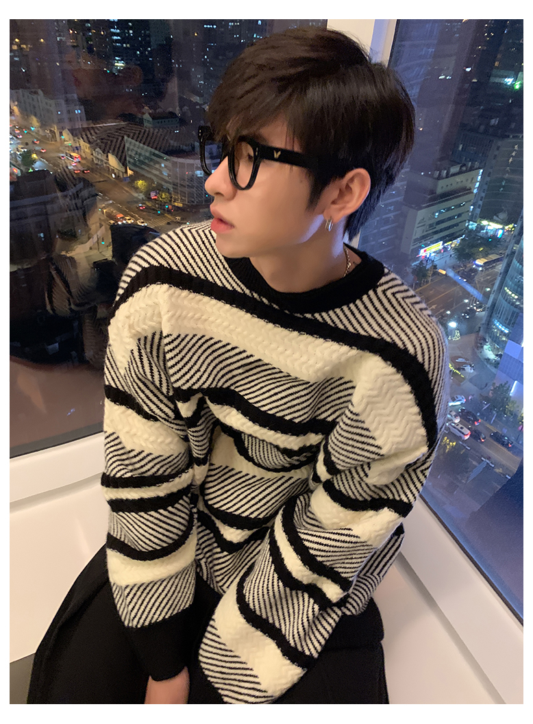 ESC MAN STUDIO/自製 CHIC風個性條紋拼色 寬松百搭質感套頭毛衣