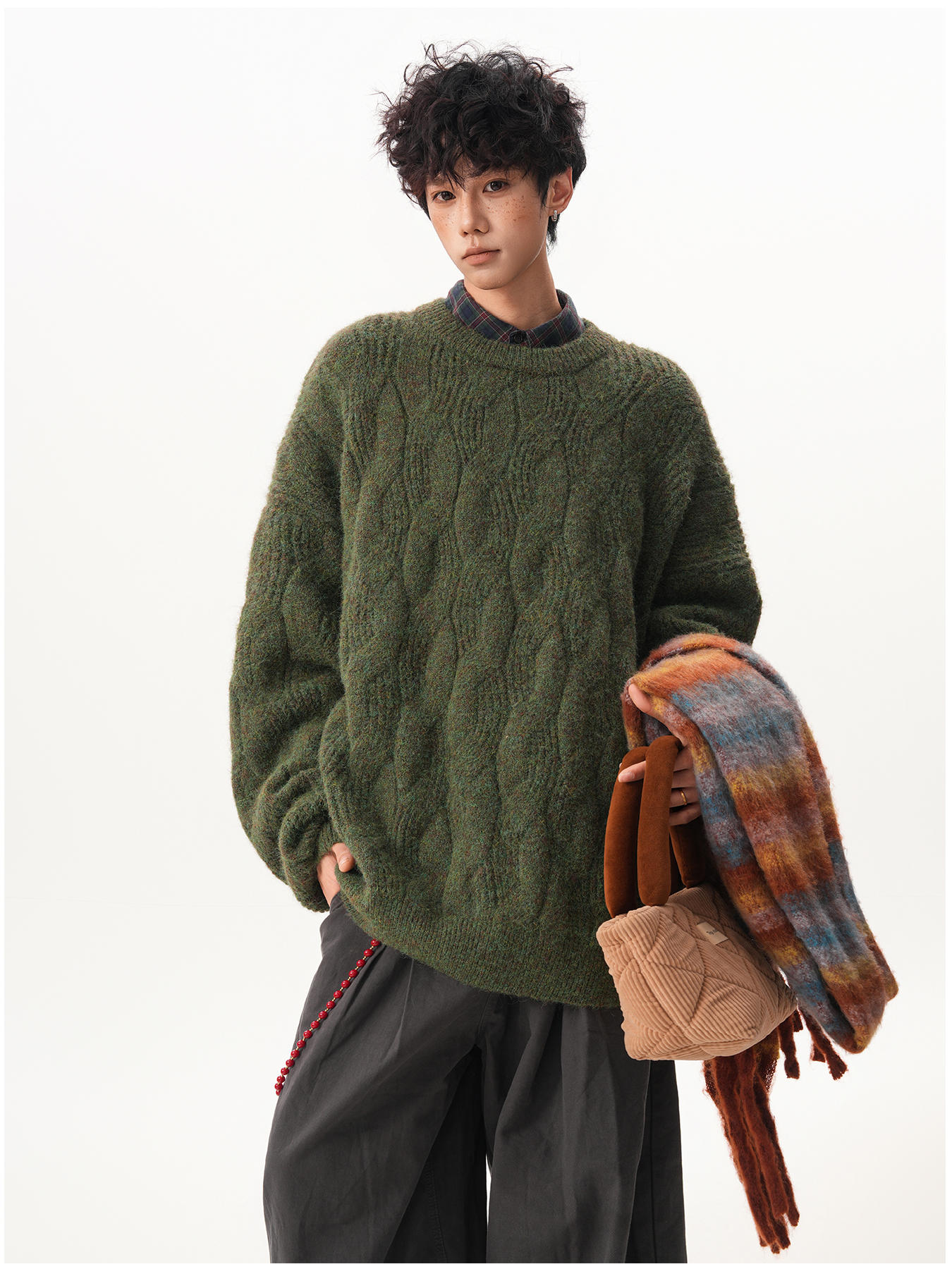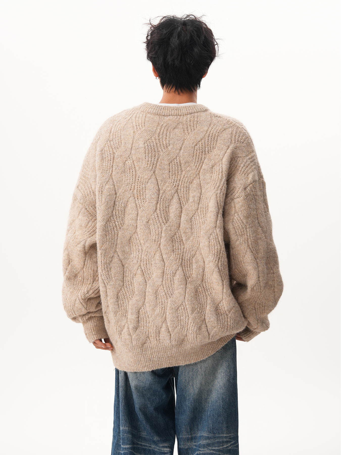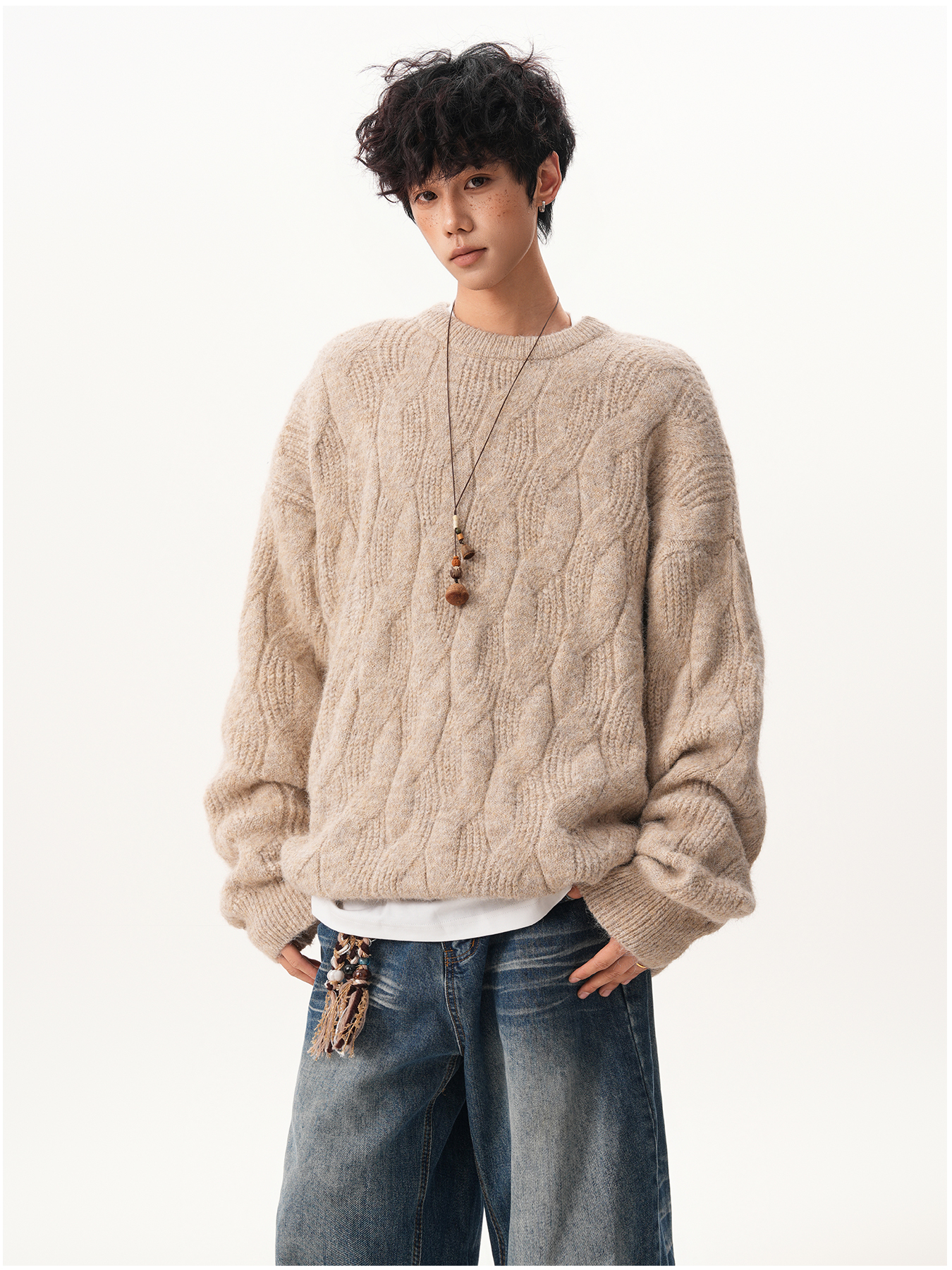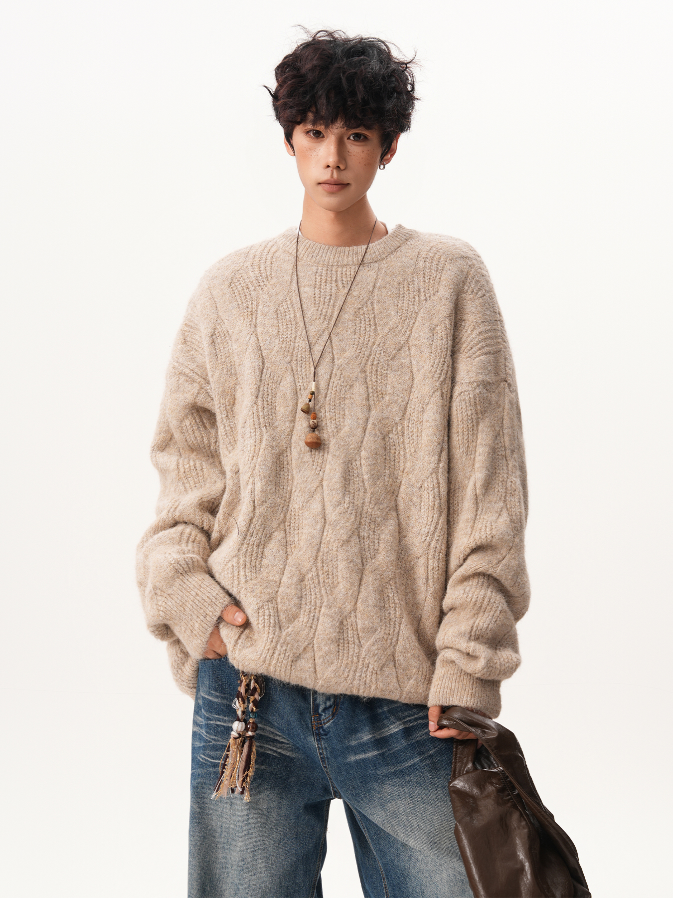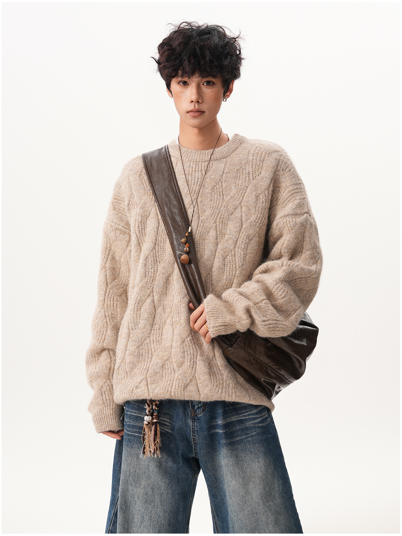 復古氛圍感圓領毛衣男女秋冬寬松慵懶感麻花厚實情侶針織外套上衣