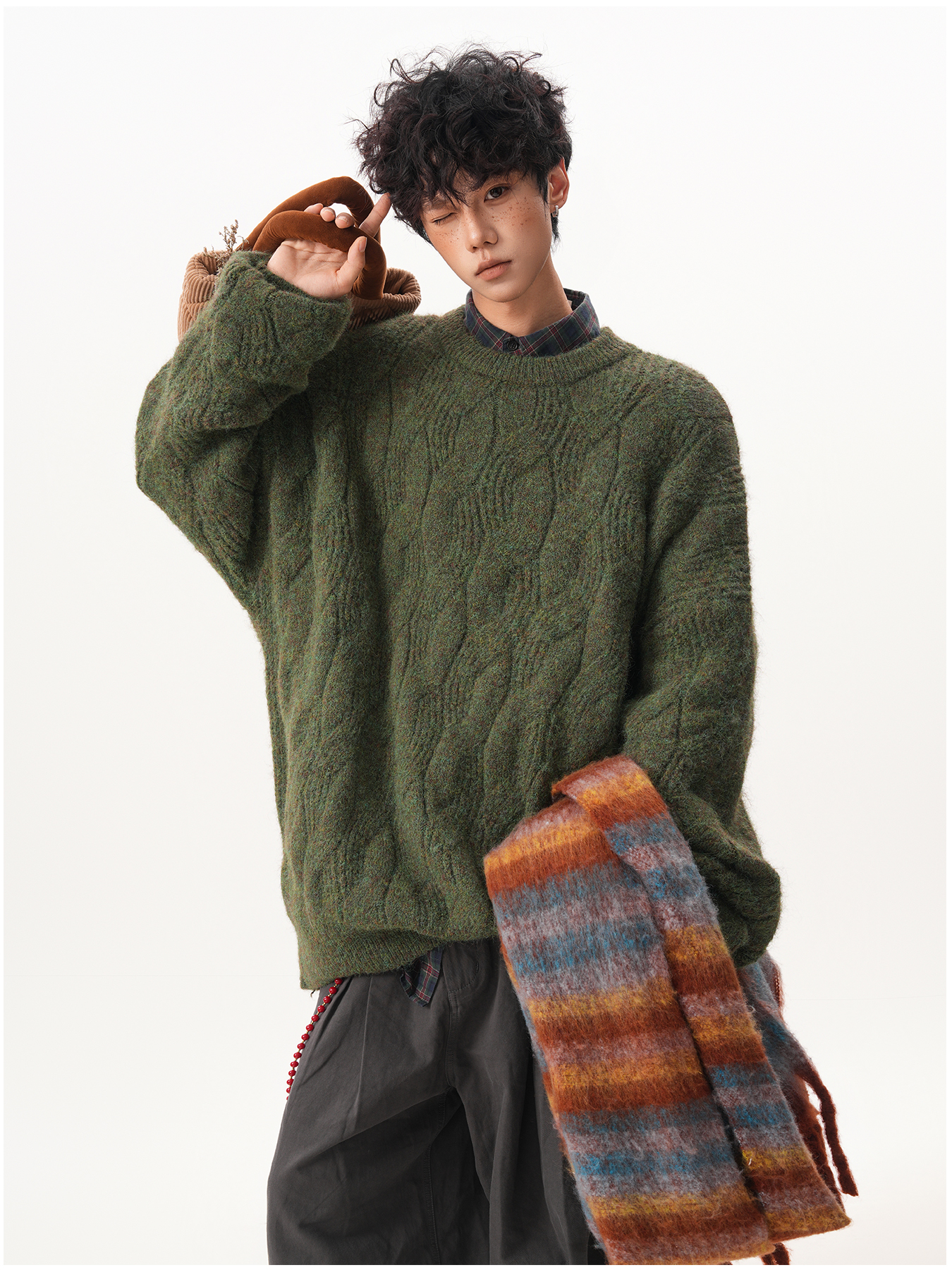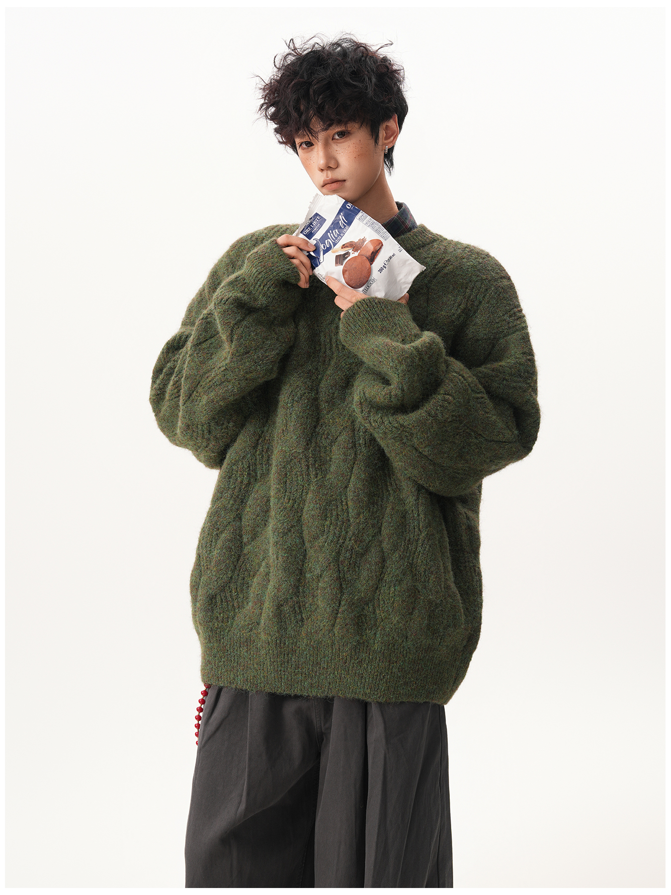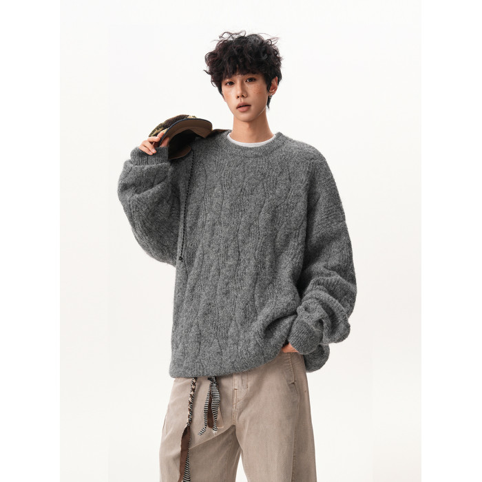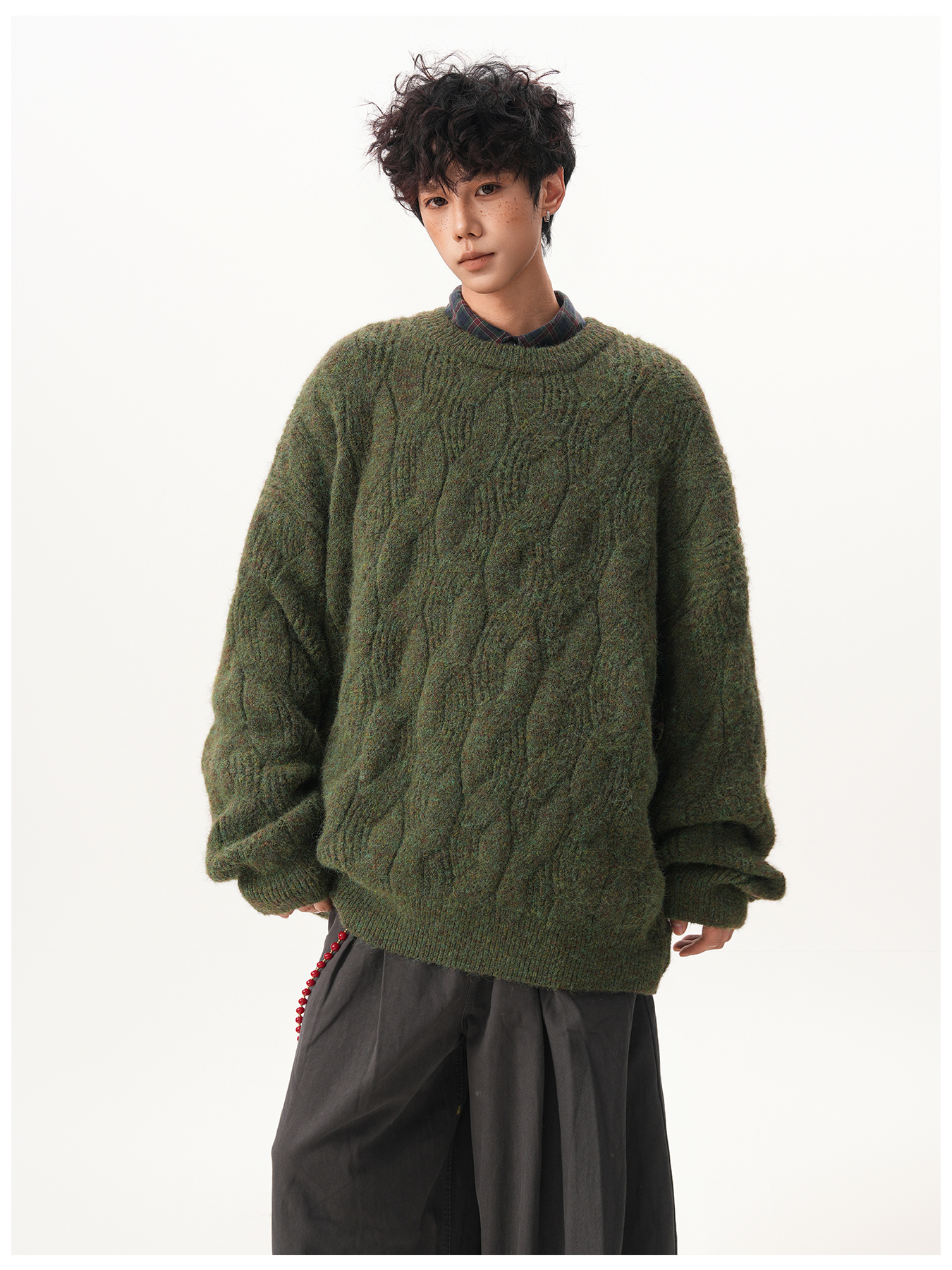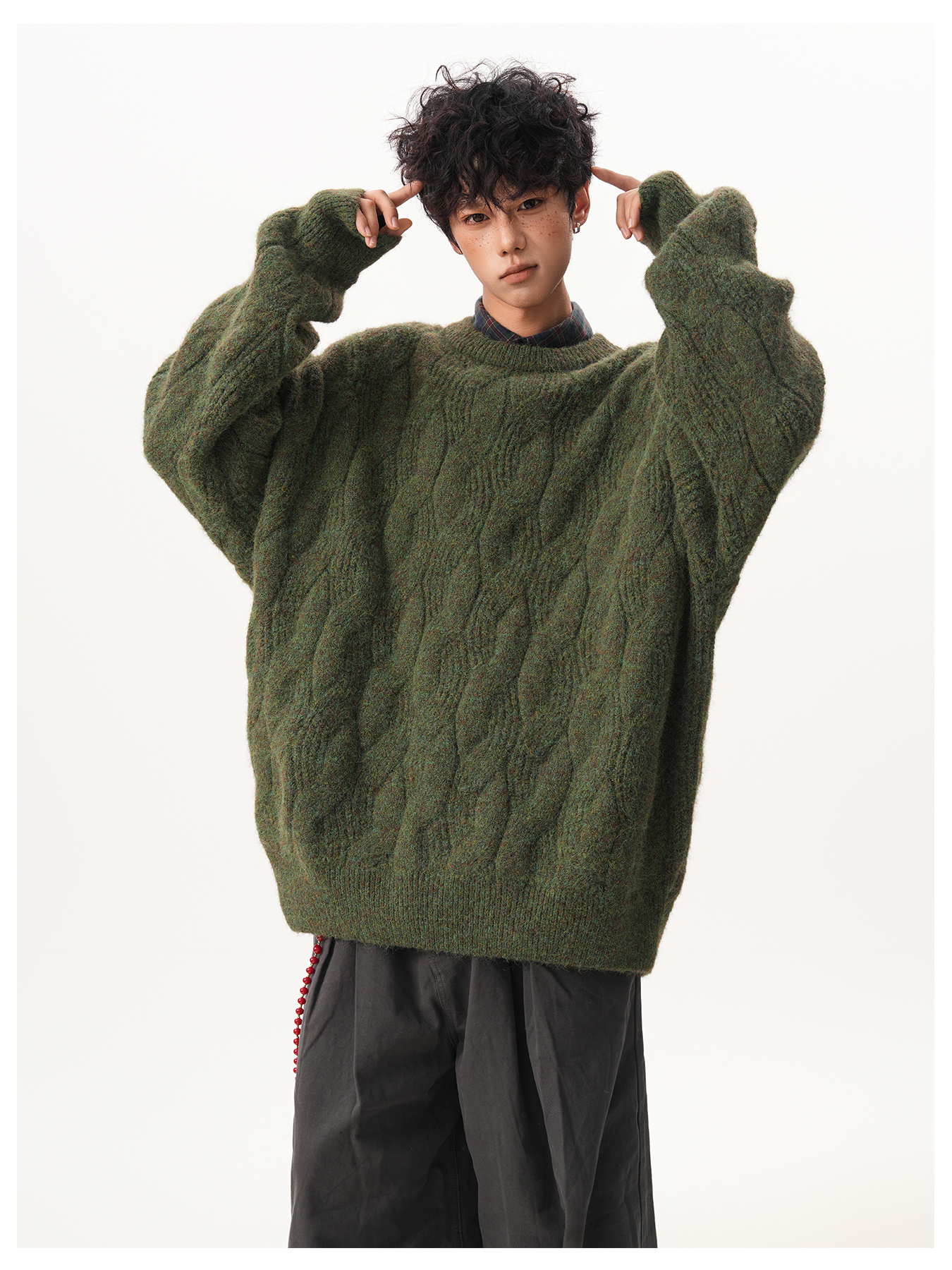 復古氛圍感圓領毛衣男女秋冬寬松慵懶感麻花厚實情侶針織外套上衣
