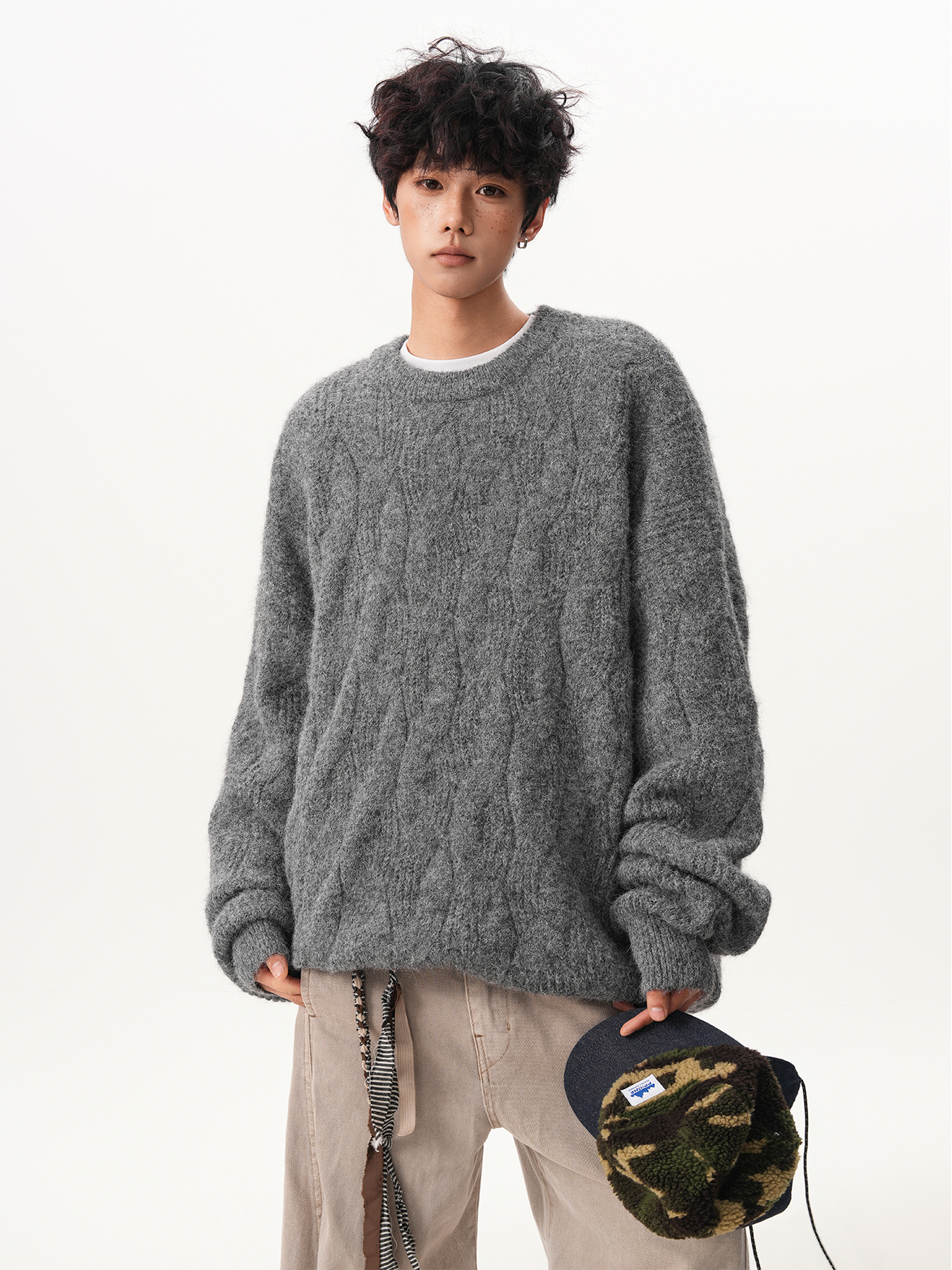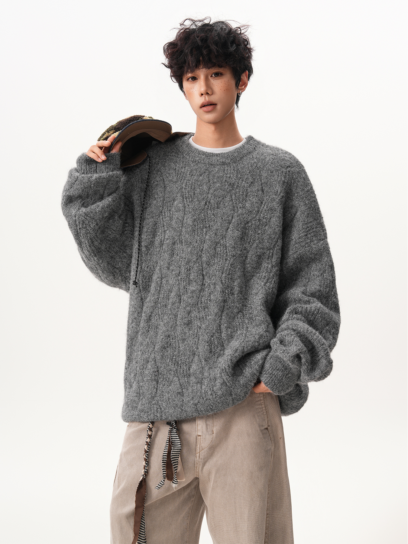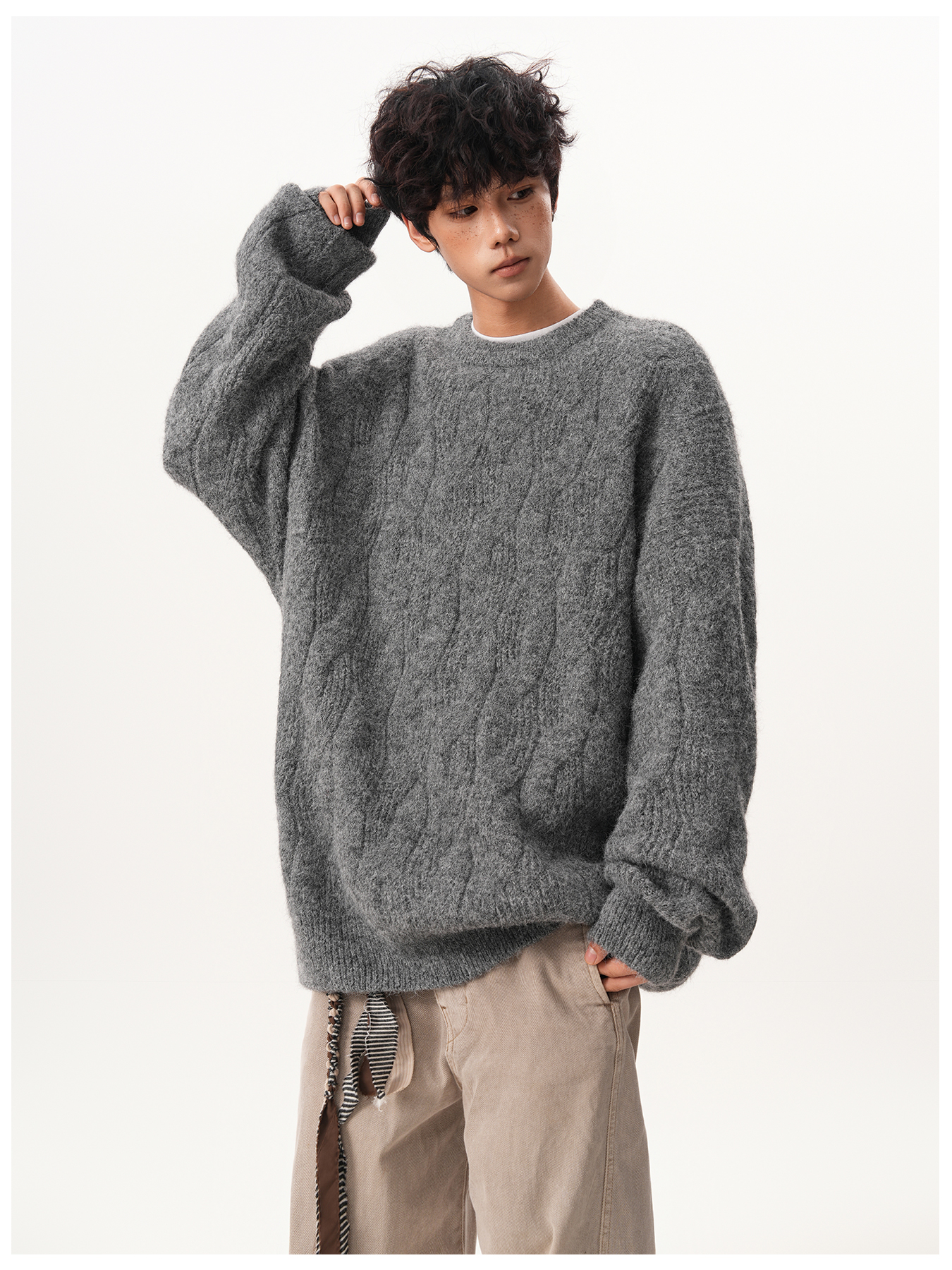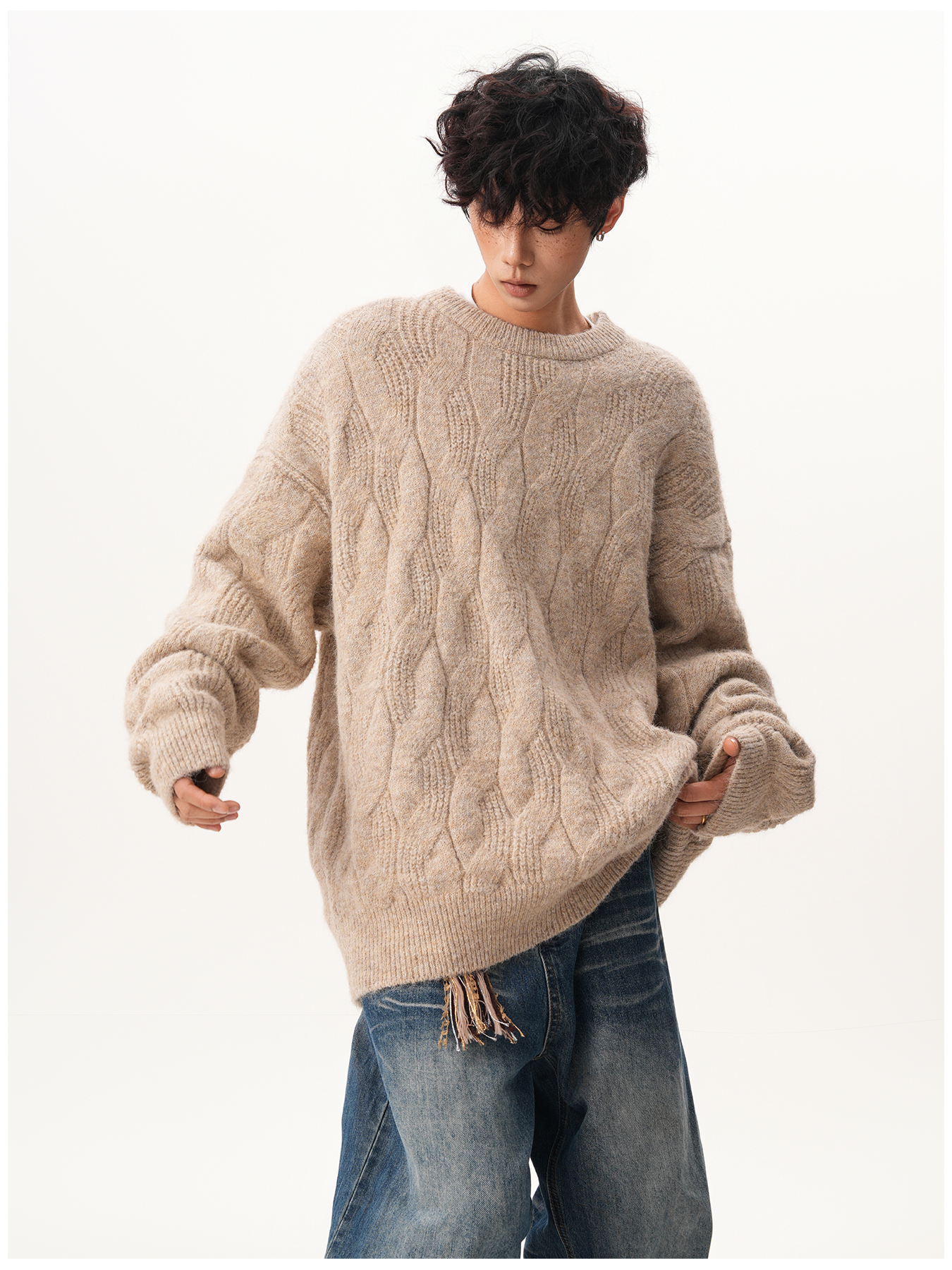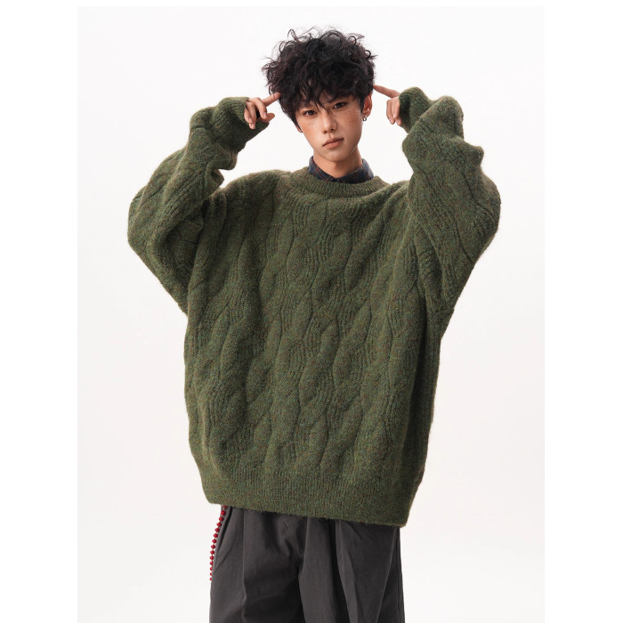 復古氛圍感圓領毛衣男女秋冬寬松慵懶感麻花厚實情侶針織外套上衣