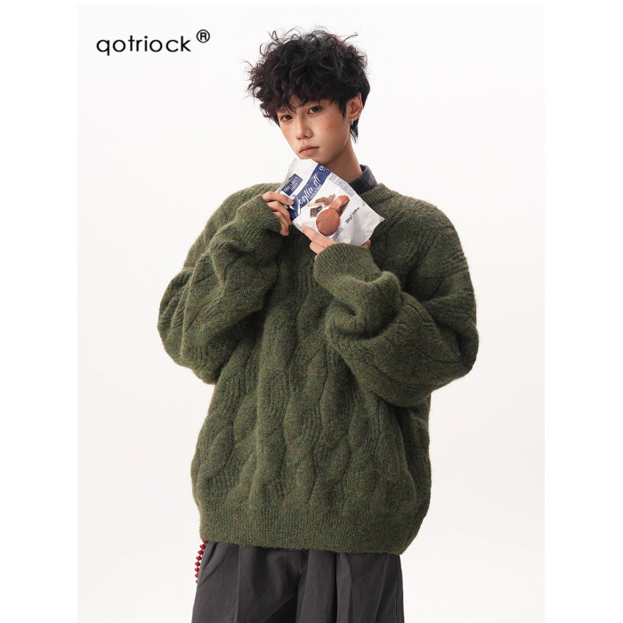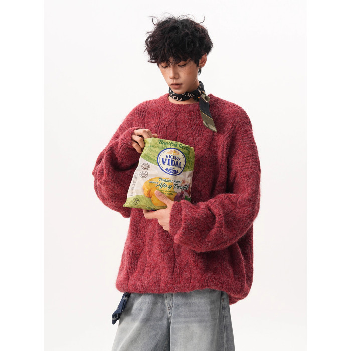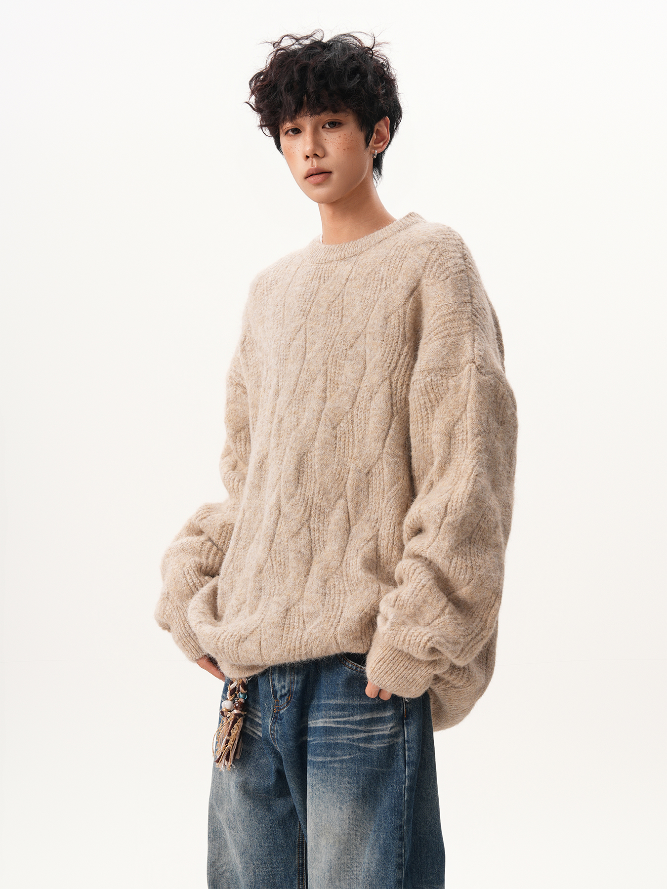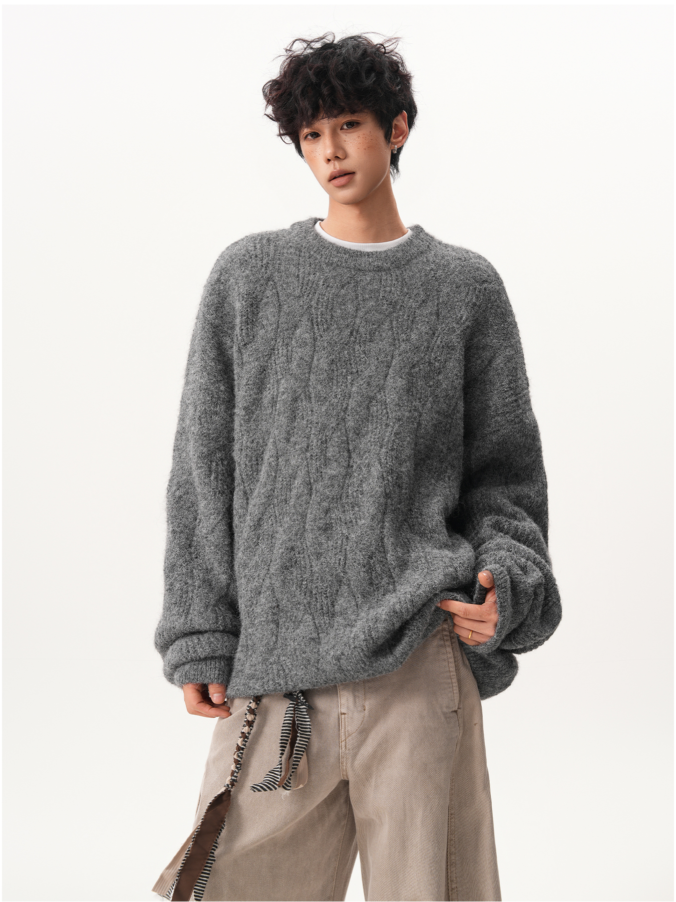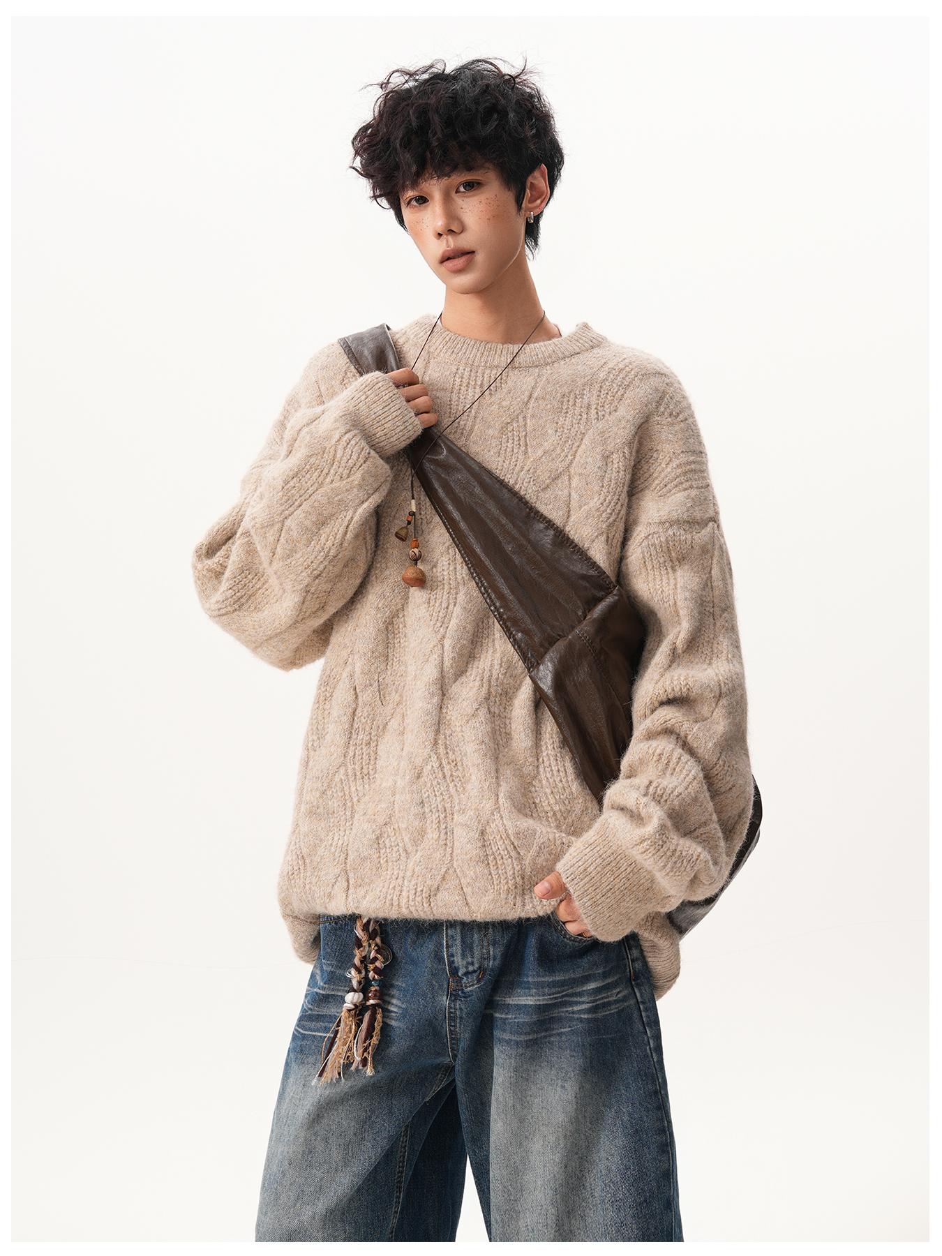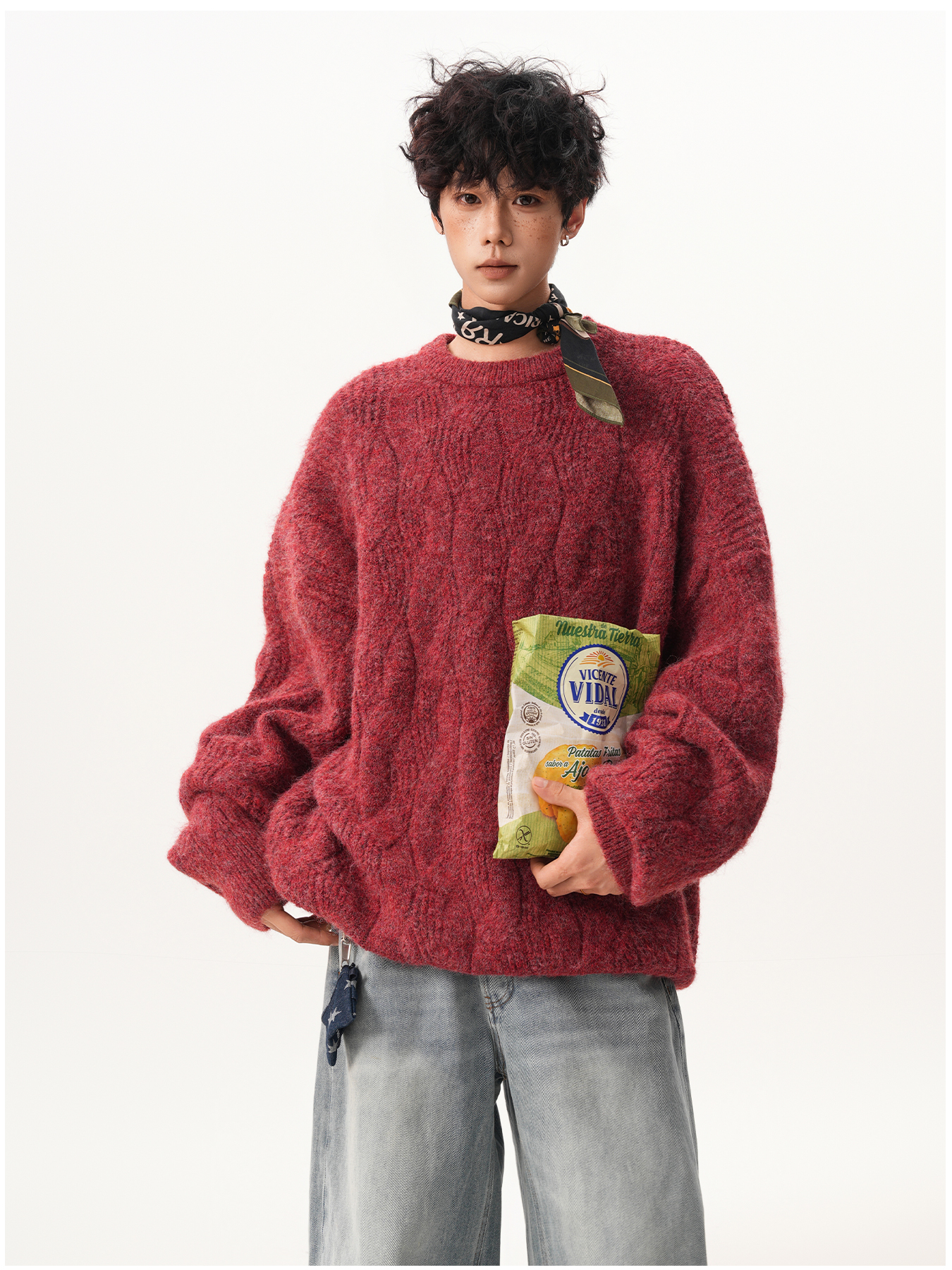 復古氛圍感圓領毛衣男女秋冬寬松慵懶感麻花厚實情侶針織外套上衣