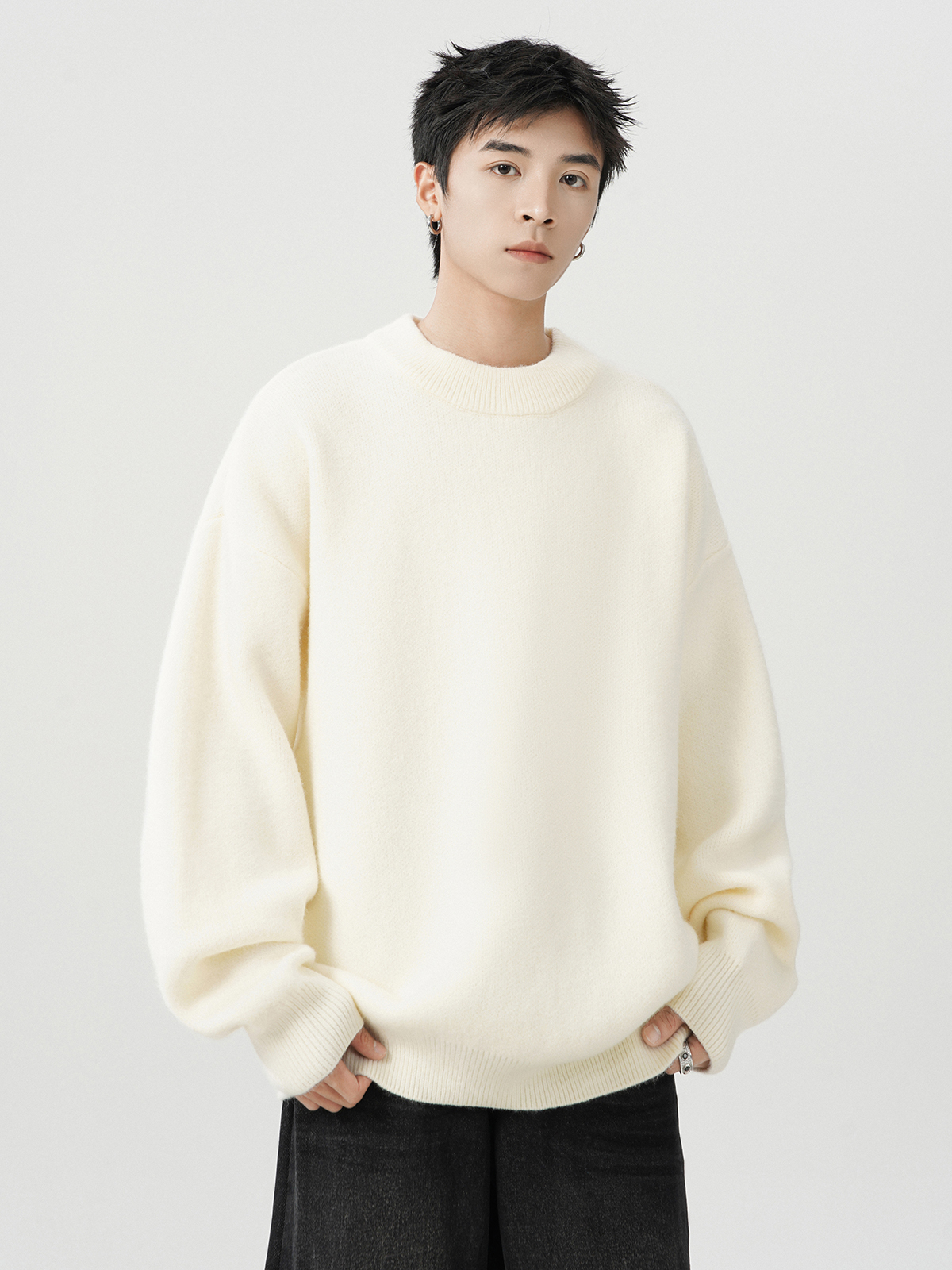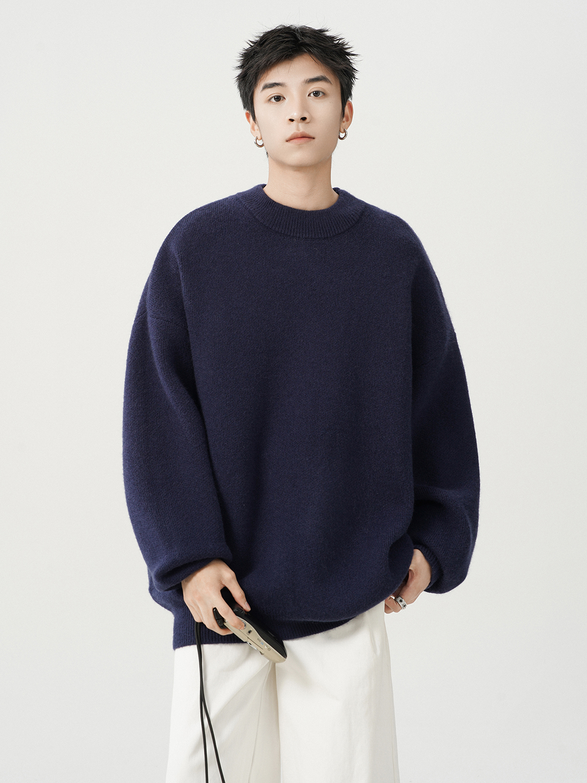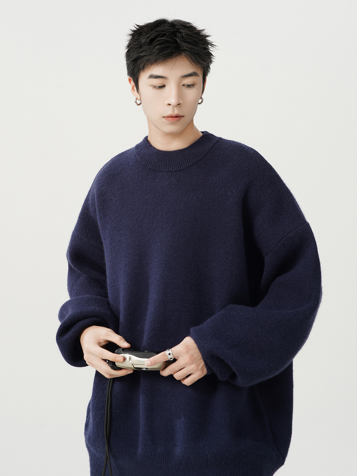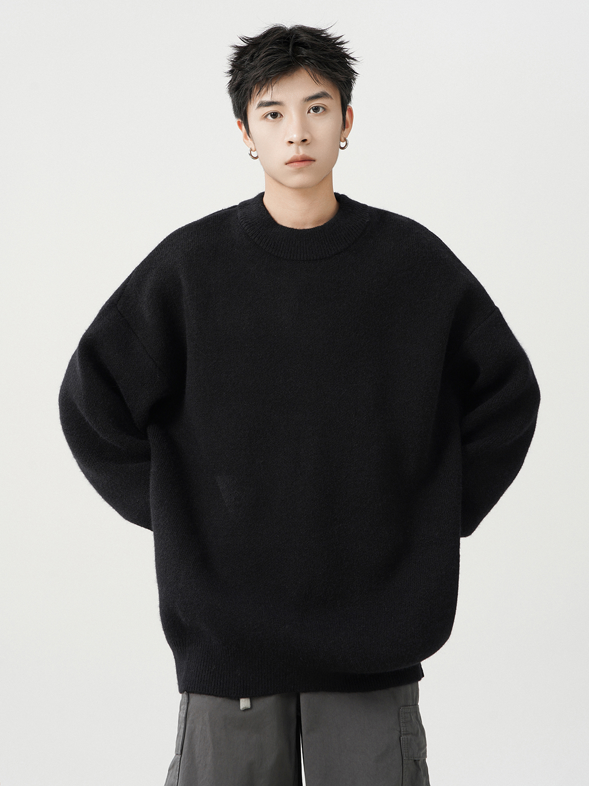 日系純色重磅圓領毛衣男秋冬季新款寬松慵懶風百搭套頭針織衫線衣