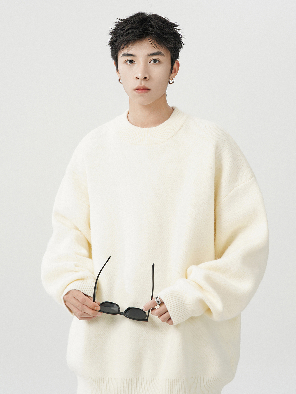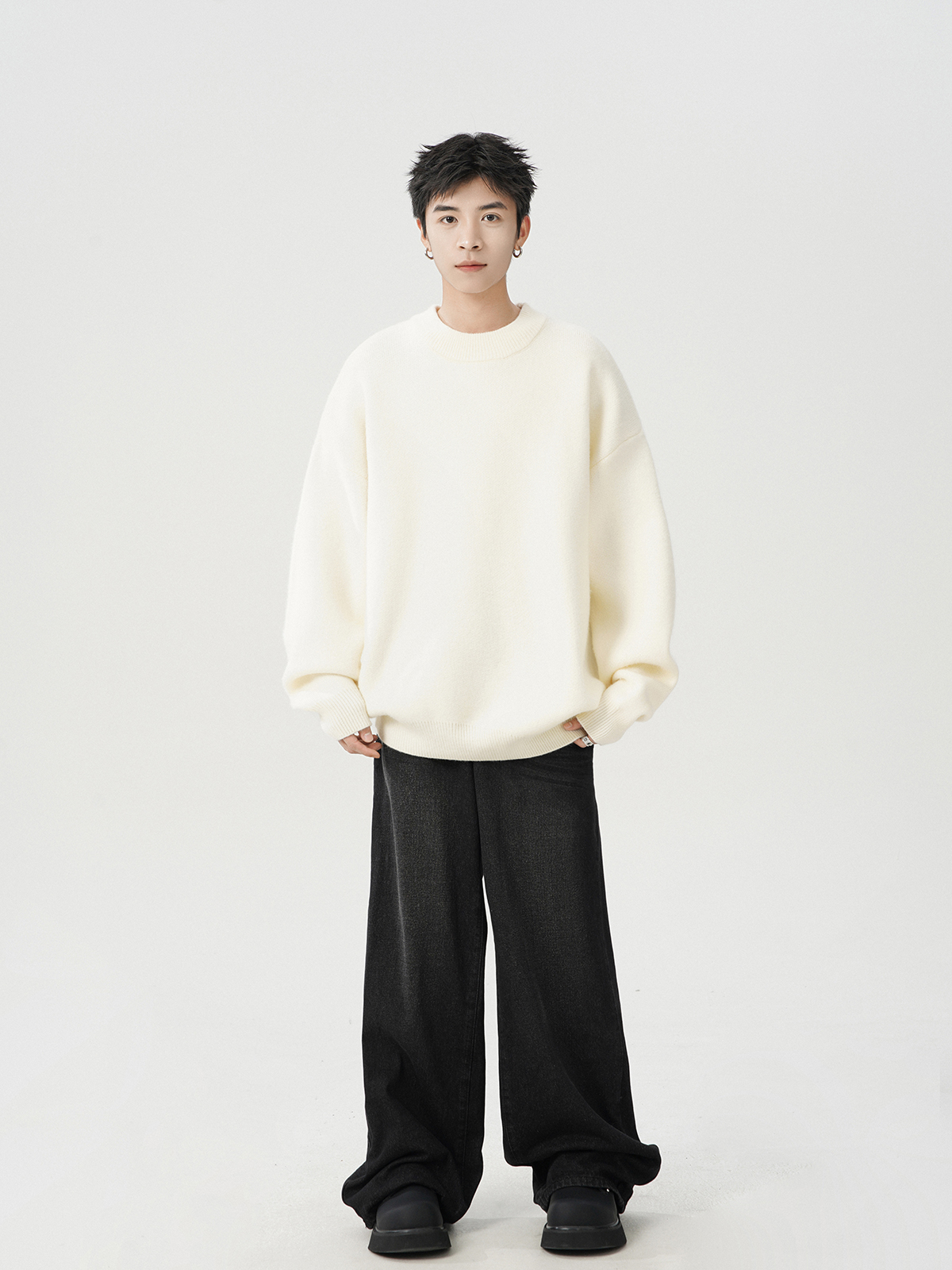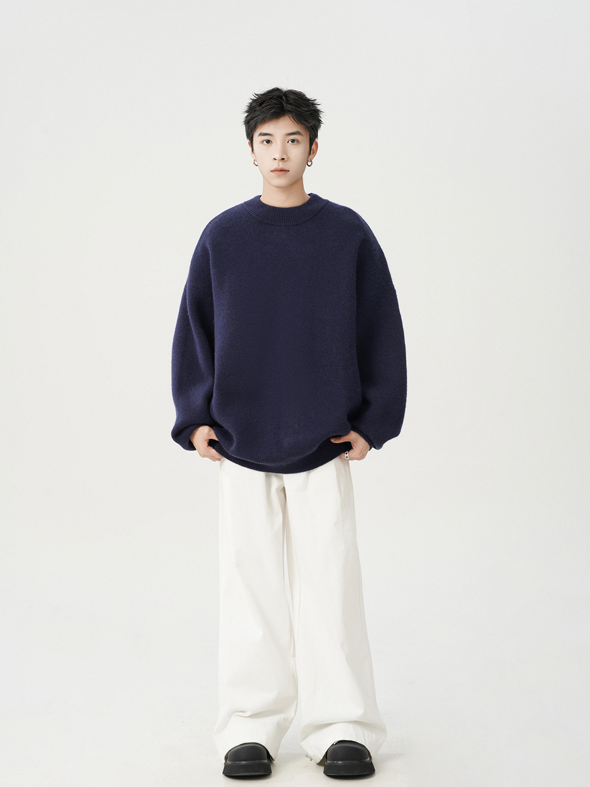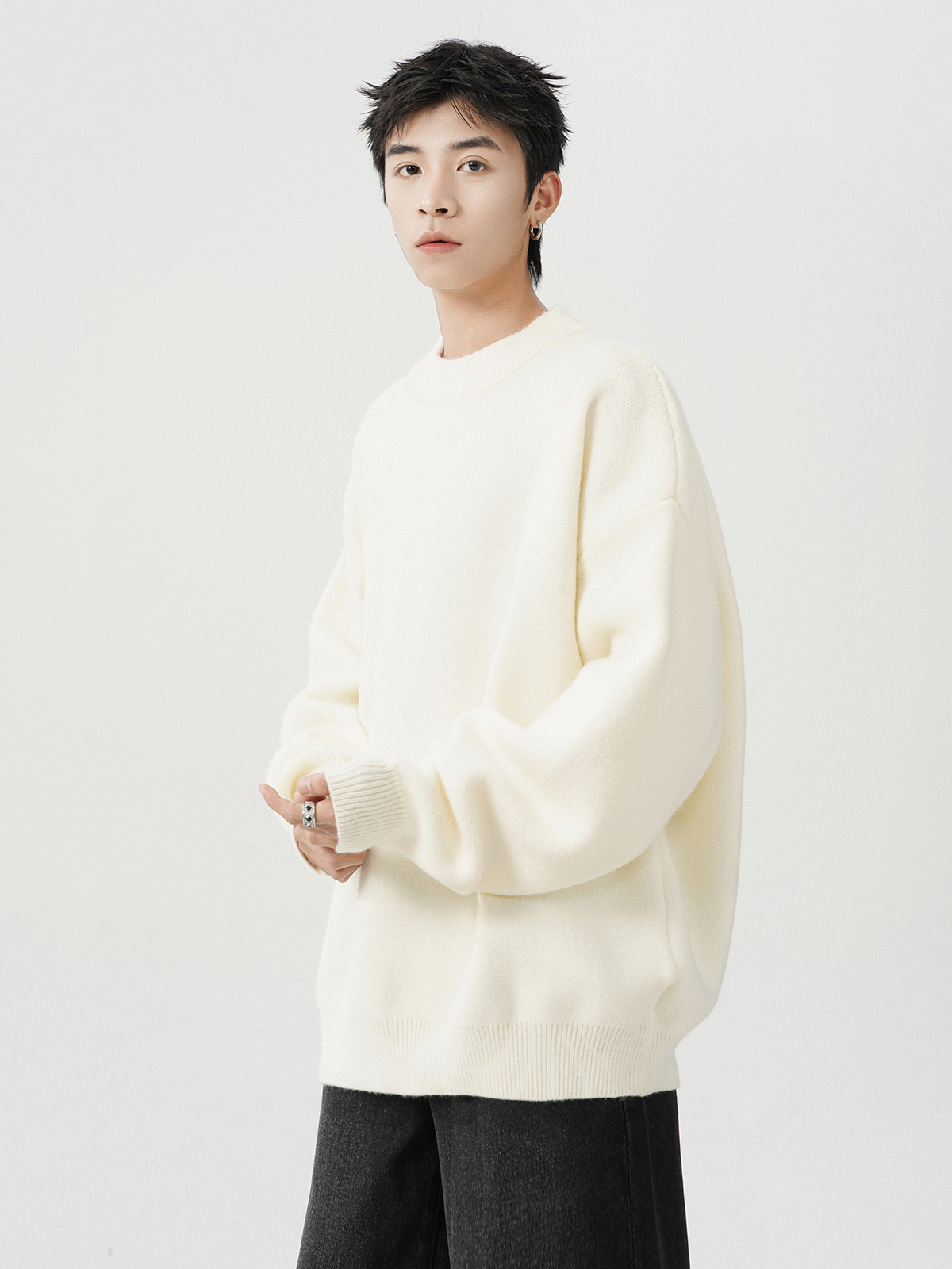 日系純色重磅圓領毛衣男秋冬季新款寬松慵懶風百搭套頭針織衫線衣