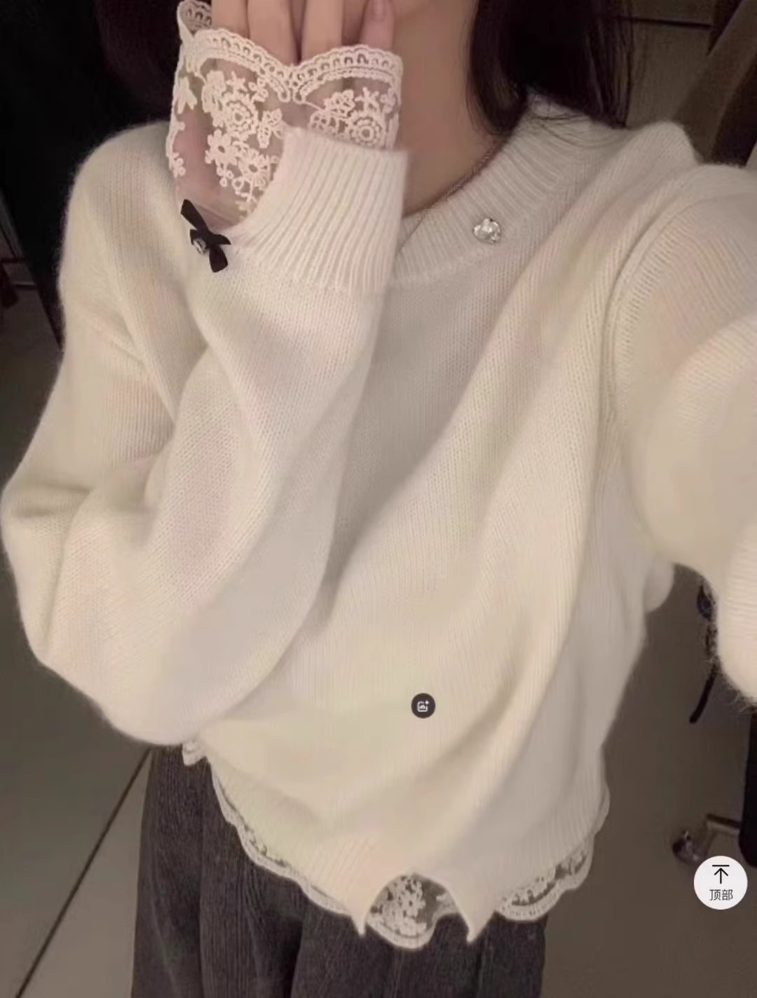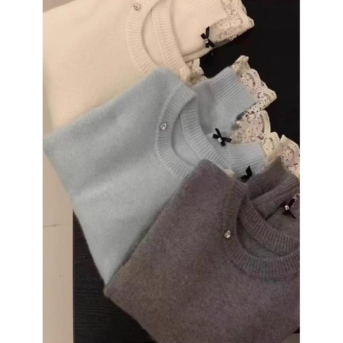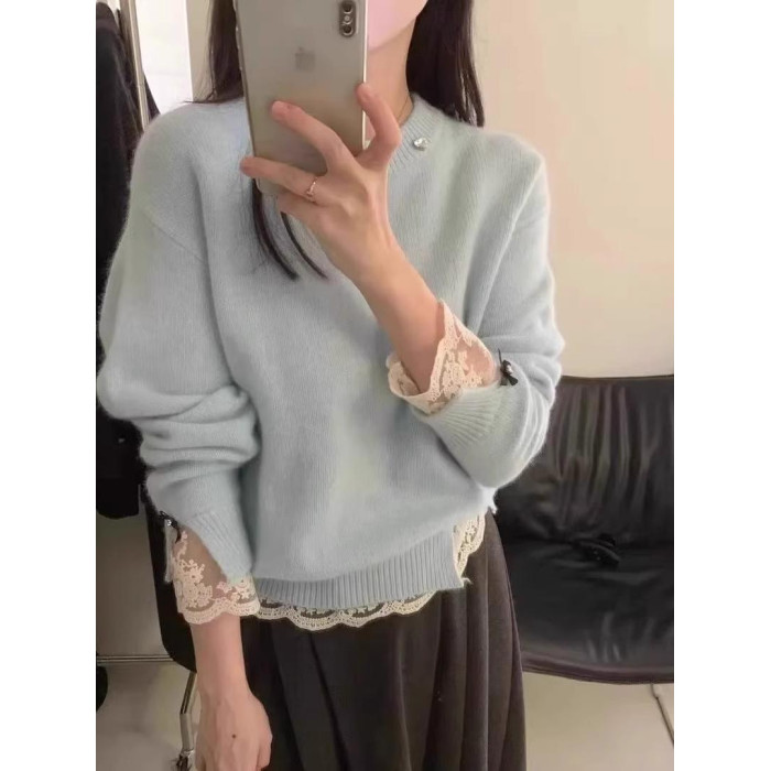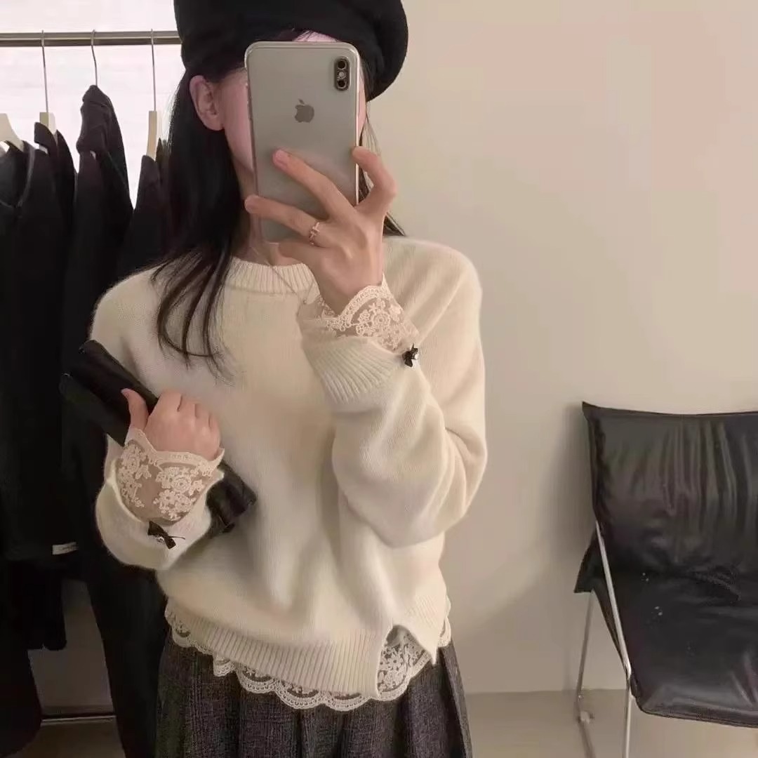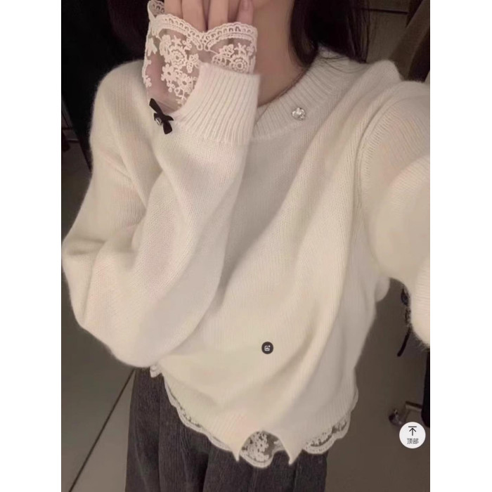 高級感白色蕾絲拼接浣熊絨毛衣女秋冬小個子寬松短款軟糯針織上衣