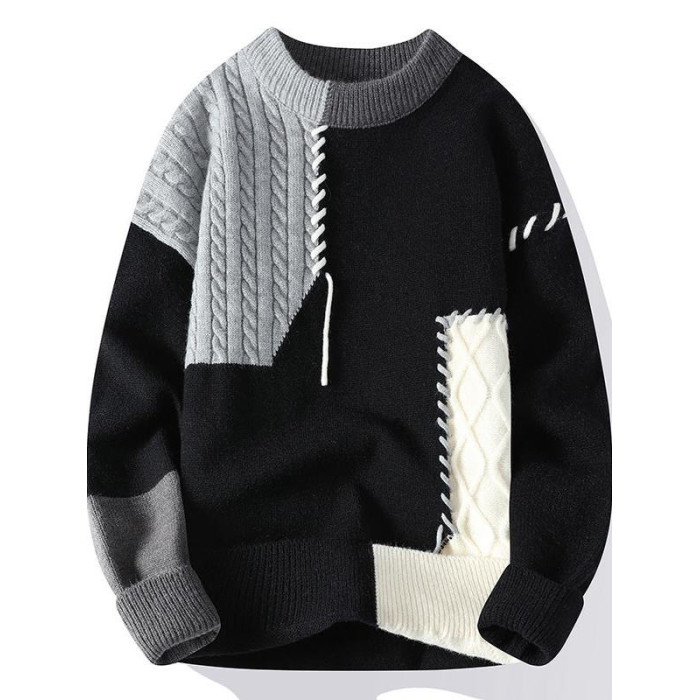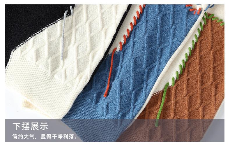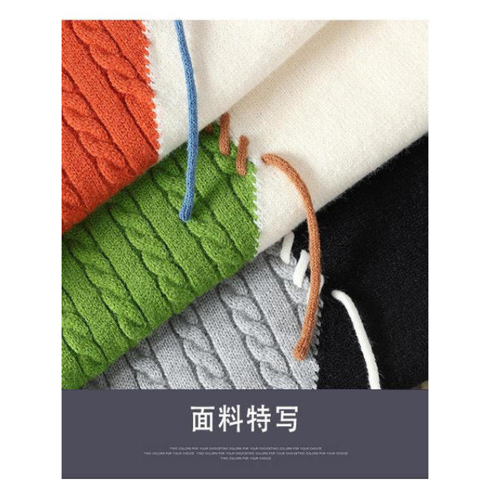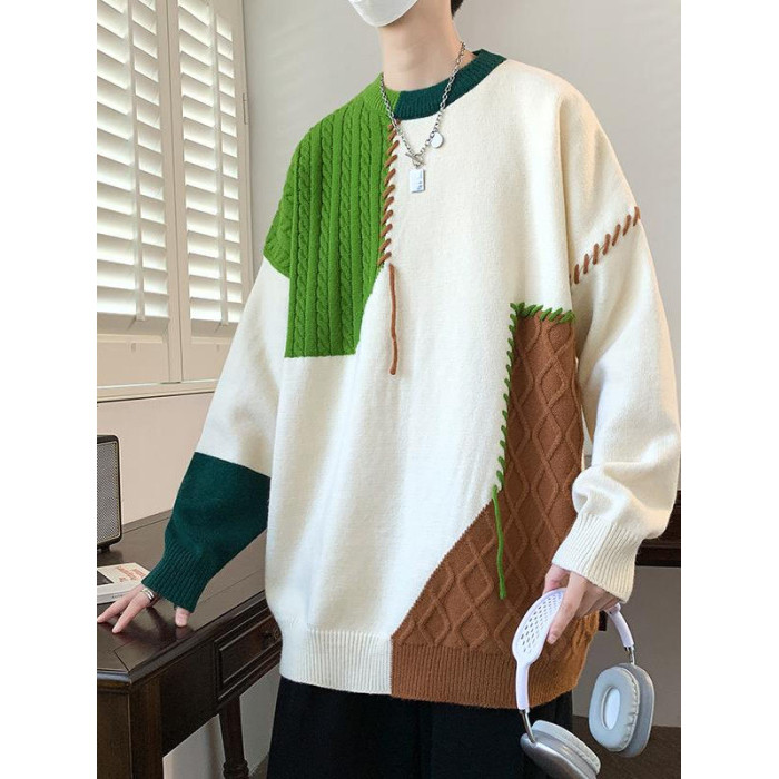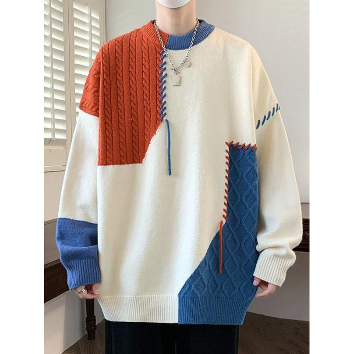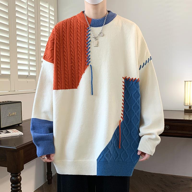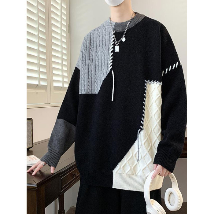 大碼300斤拼接撞色毛衣男冬季美式休閒個性設計感針織衫男青少年2