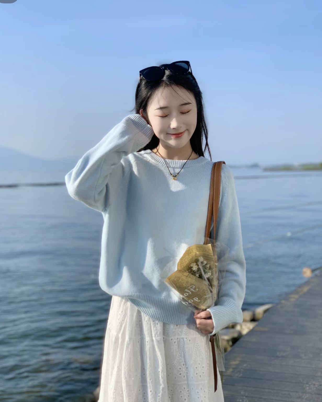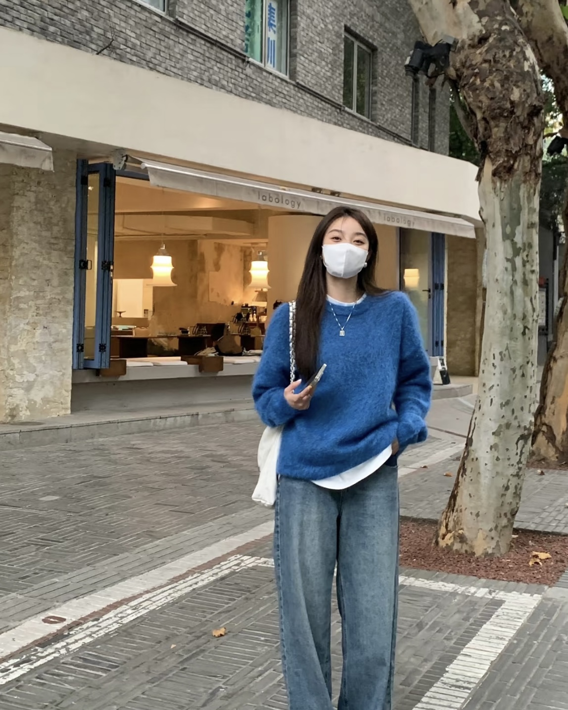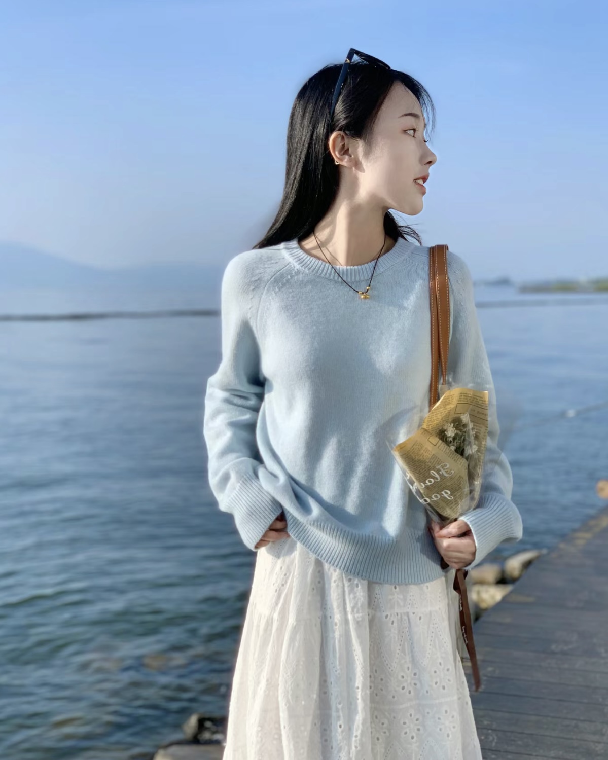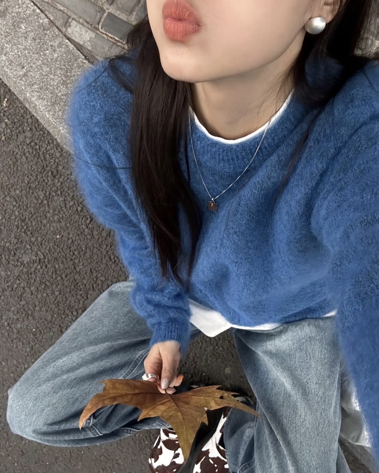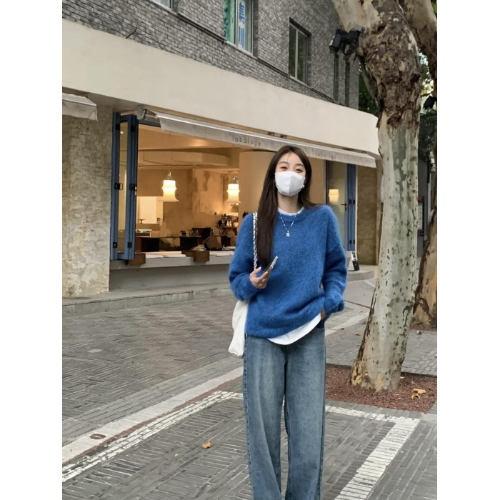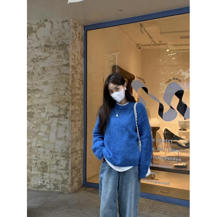 超顯白寶藍!小衆甜美套頭毛衣女冬季加厚氣質圓領復古針織衫外穿