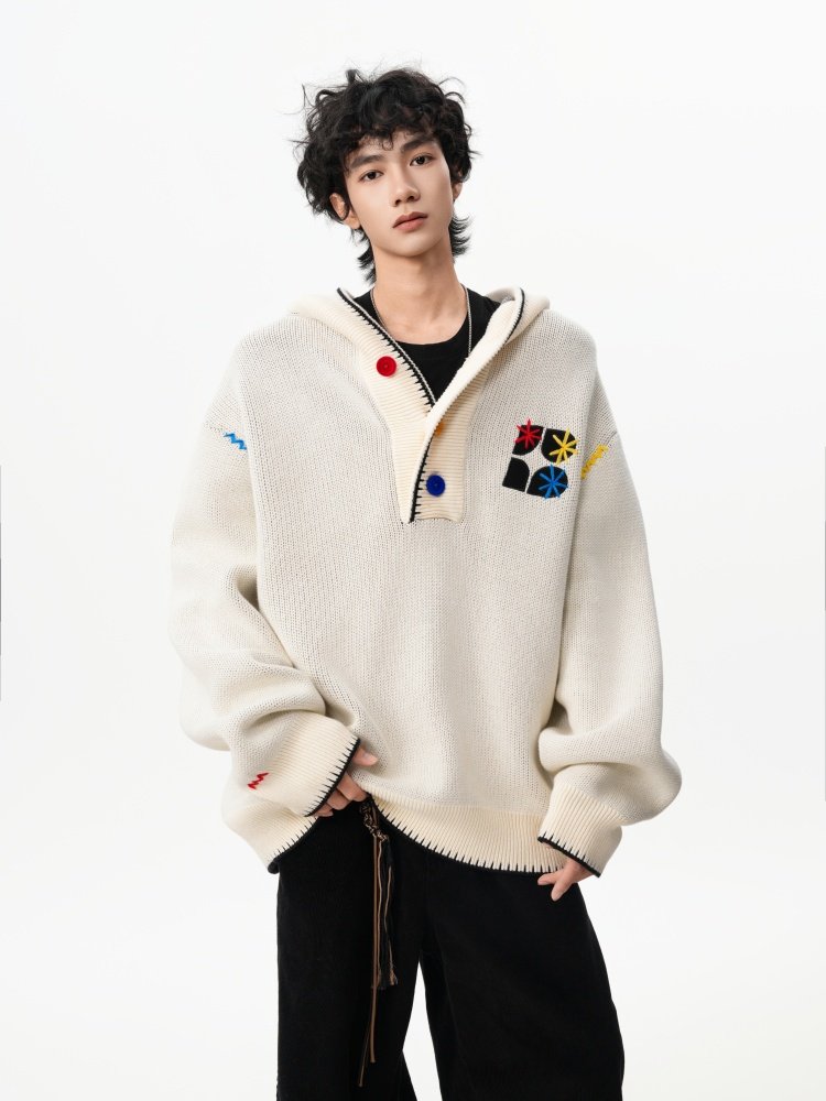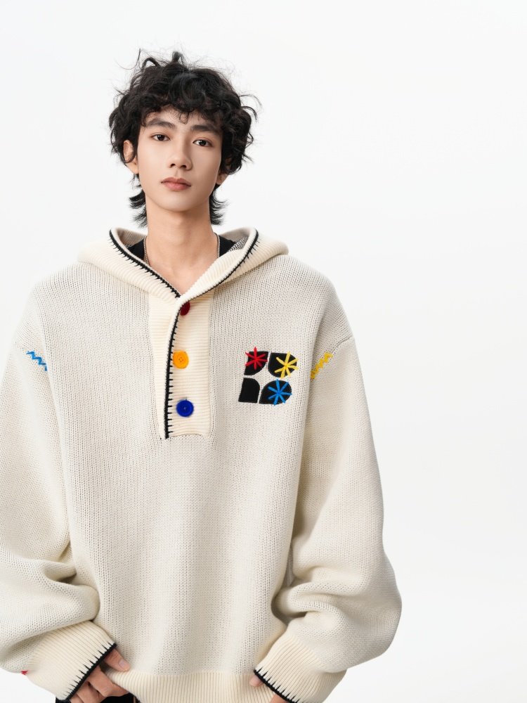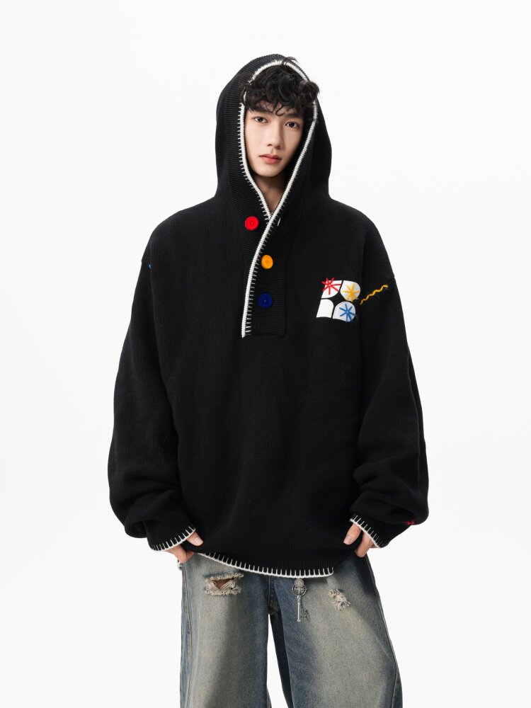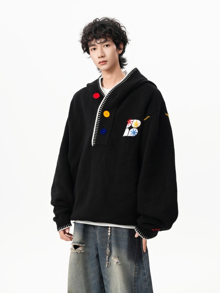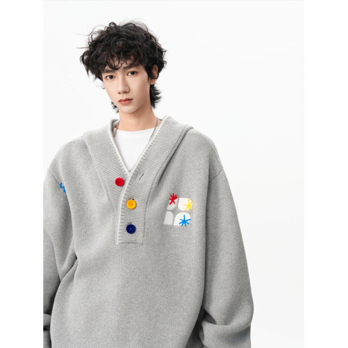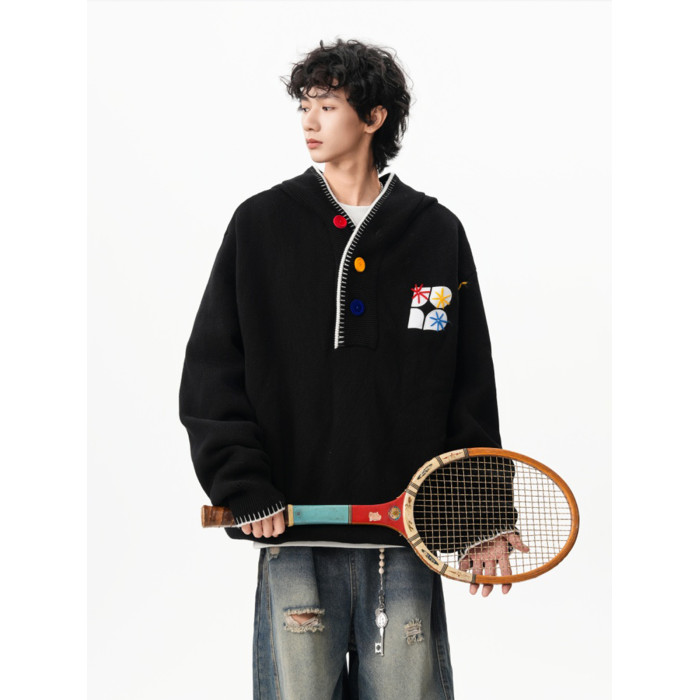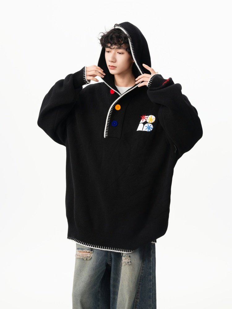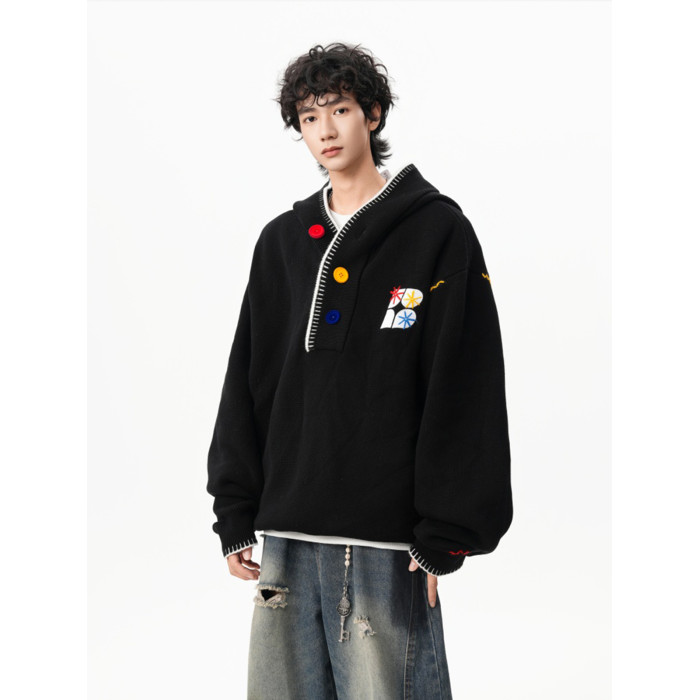 美式彩色紐釦連帽毛衣男冬季重磅刺綉針織衫外套高街百搭情侶上衣