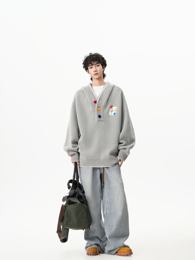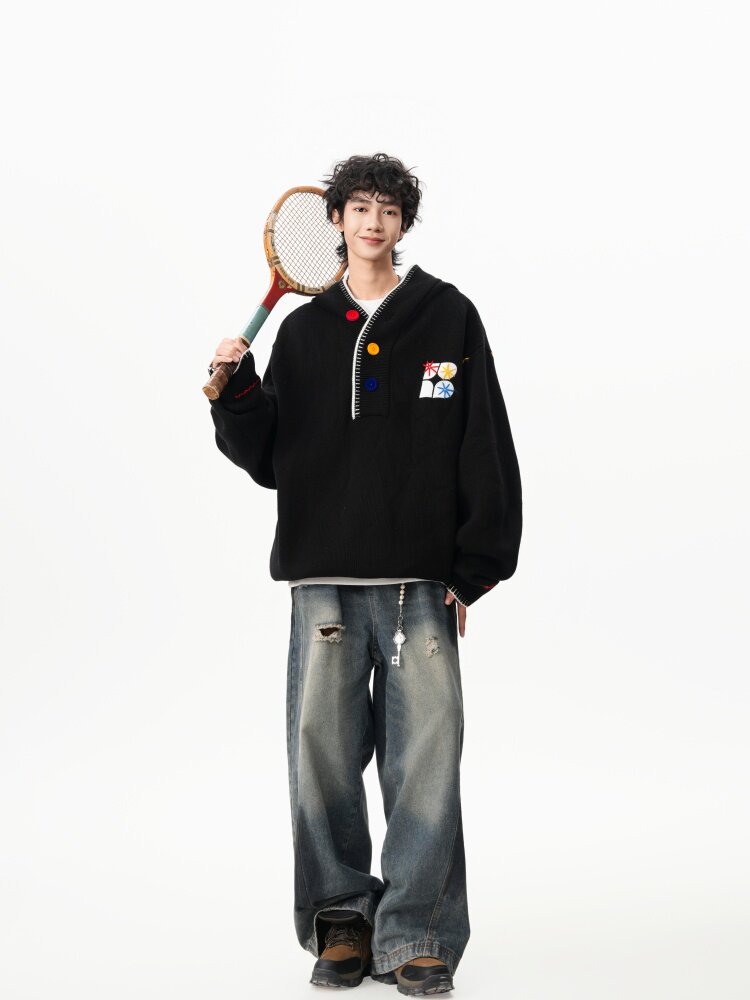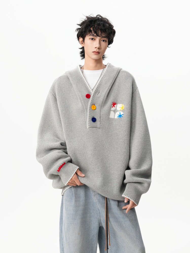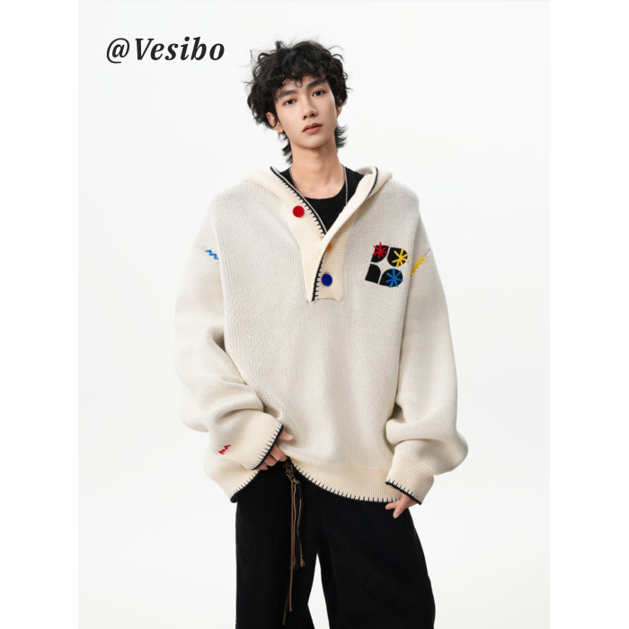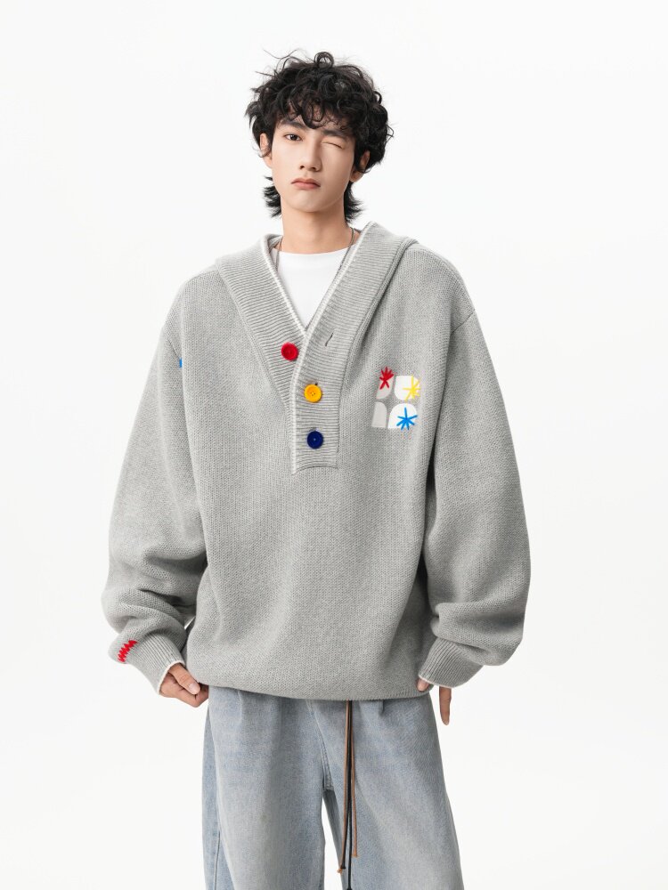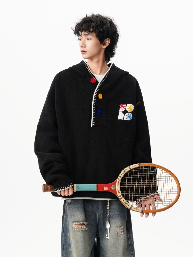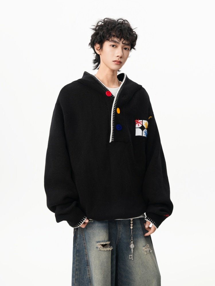 美式彩色紐釦連帽毛衣男冬季重磅刺綉針織衫外套高街百搭情侶上衣