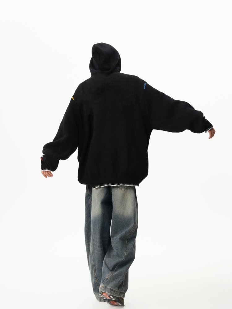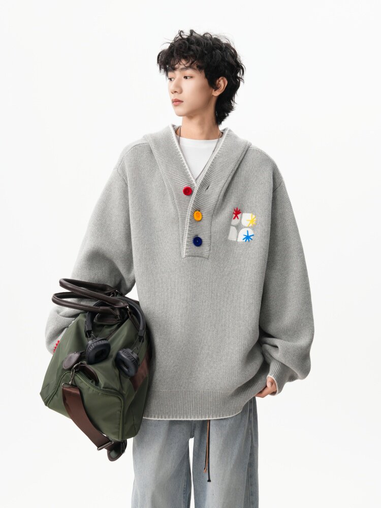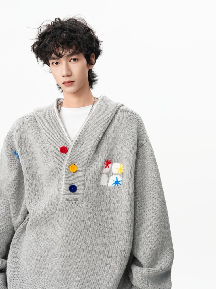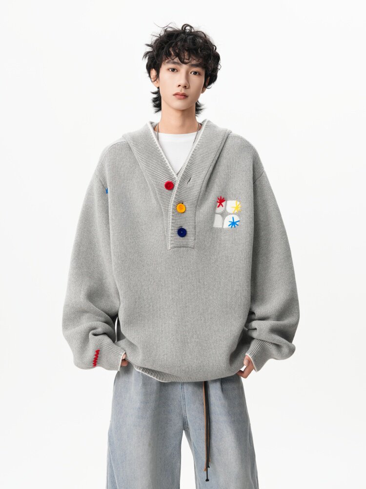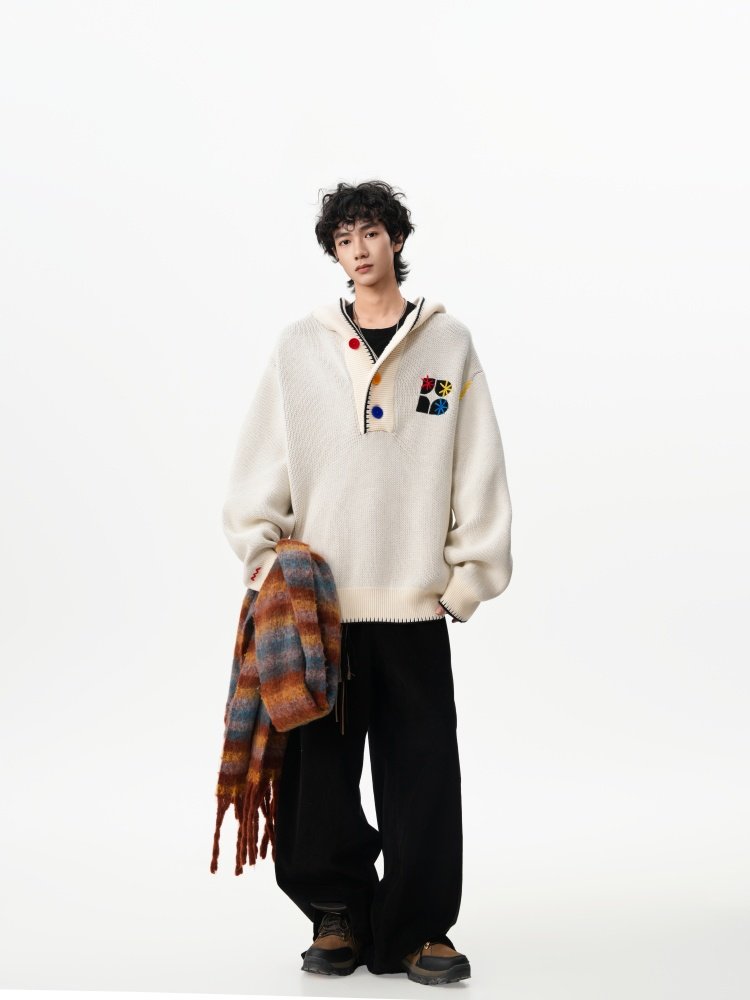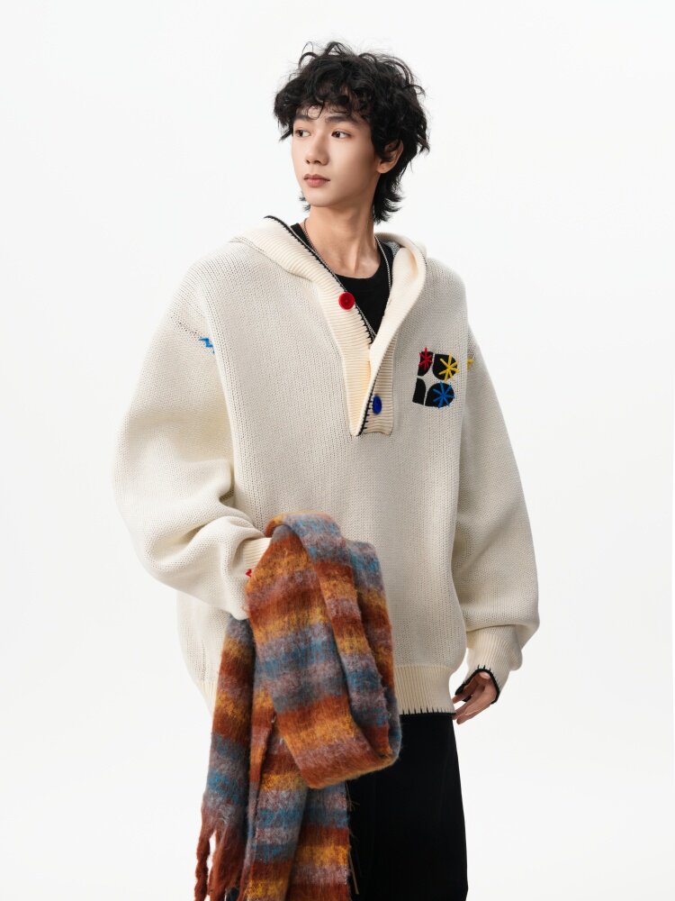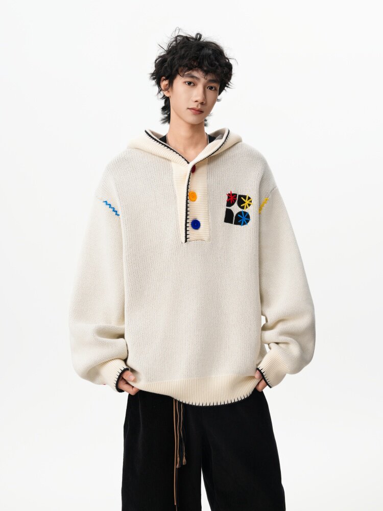 美式彩色紐釦連帽毛衣男冬季重磅刺綉針織衫外套高街百搭情侶上衣