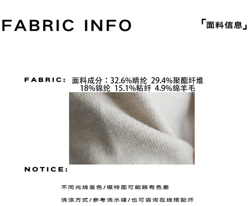 | 材質成分 | 聚丙烯腈纖維(腈綸)32.6% 聚酯纖維29.4% 聚醯胺纖維(錦綸)18% 莫代爾纖維(莫代爾)15.1% 羊毛4.9% |