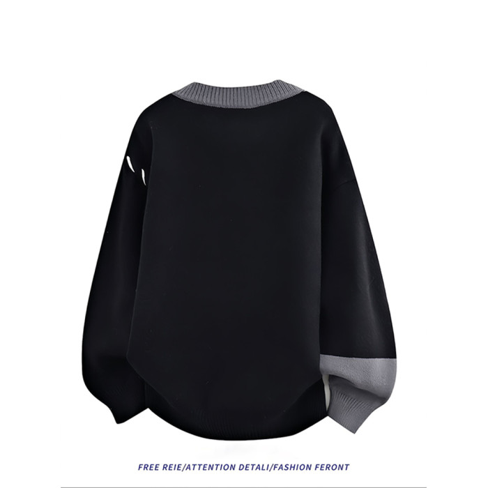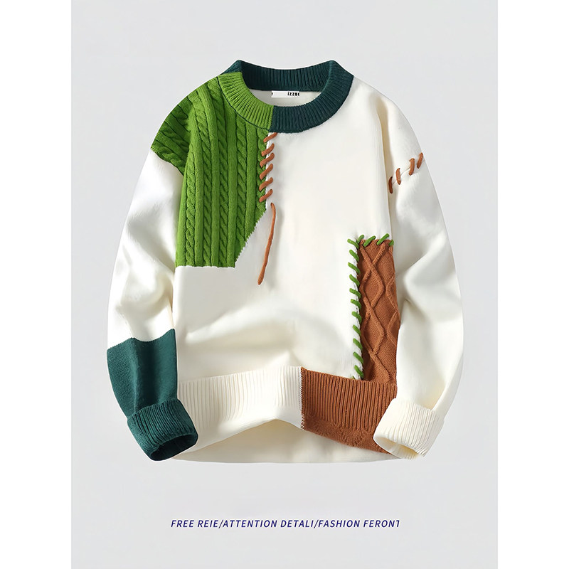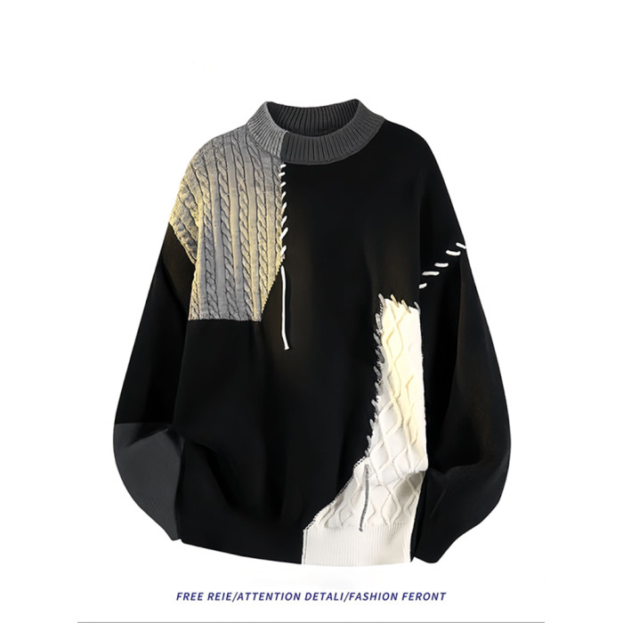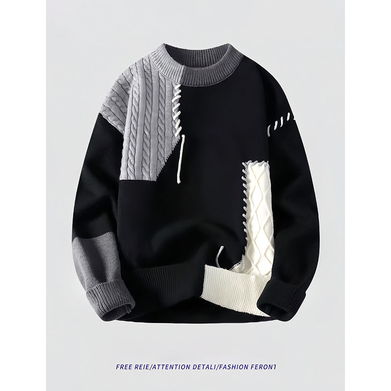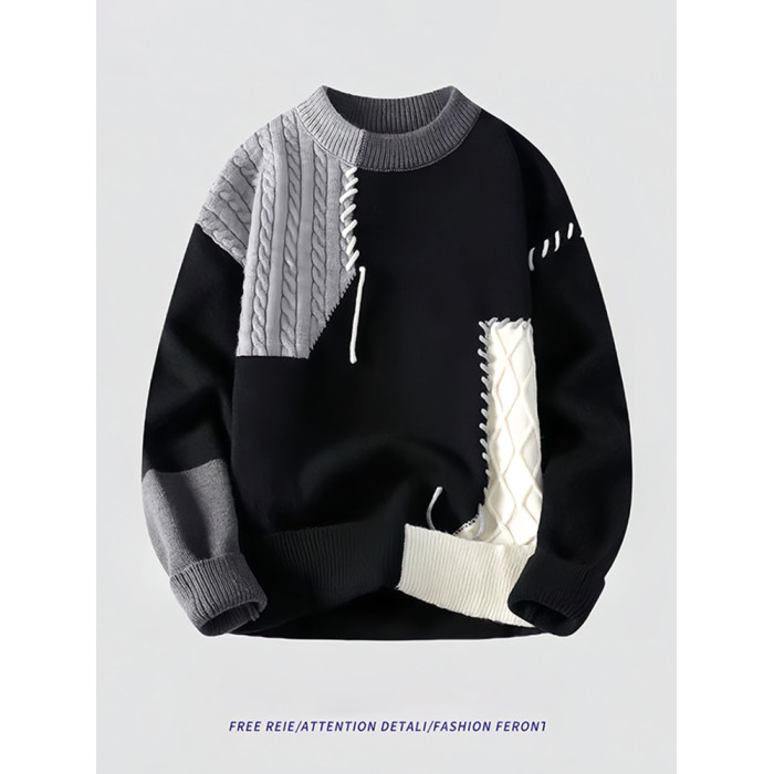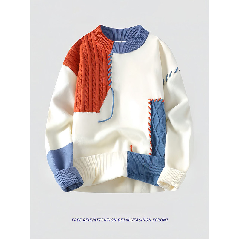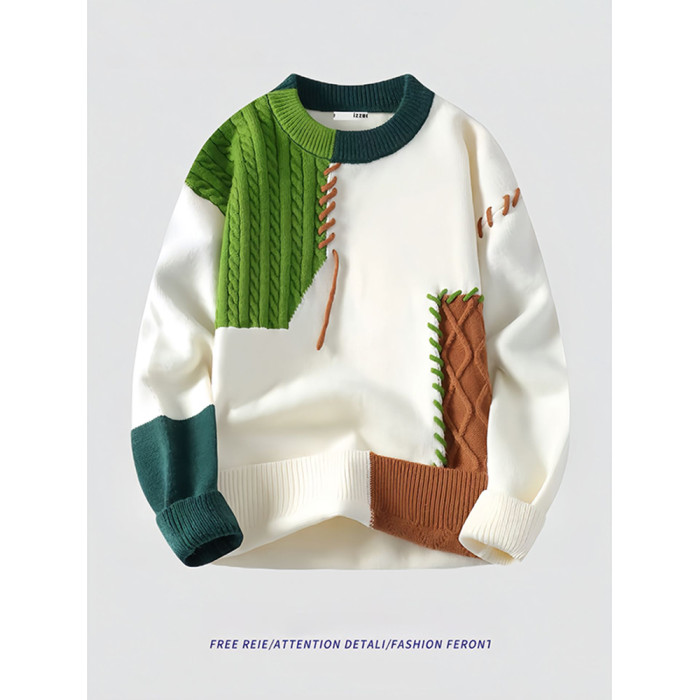 美式撞色拼接圓領毛衣男款秋冬季高級感痞帥小衆設計感針織打底衫