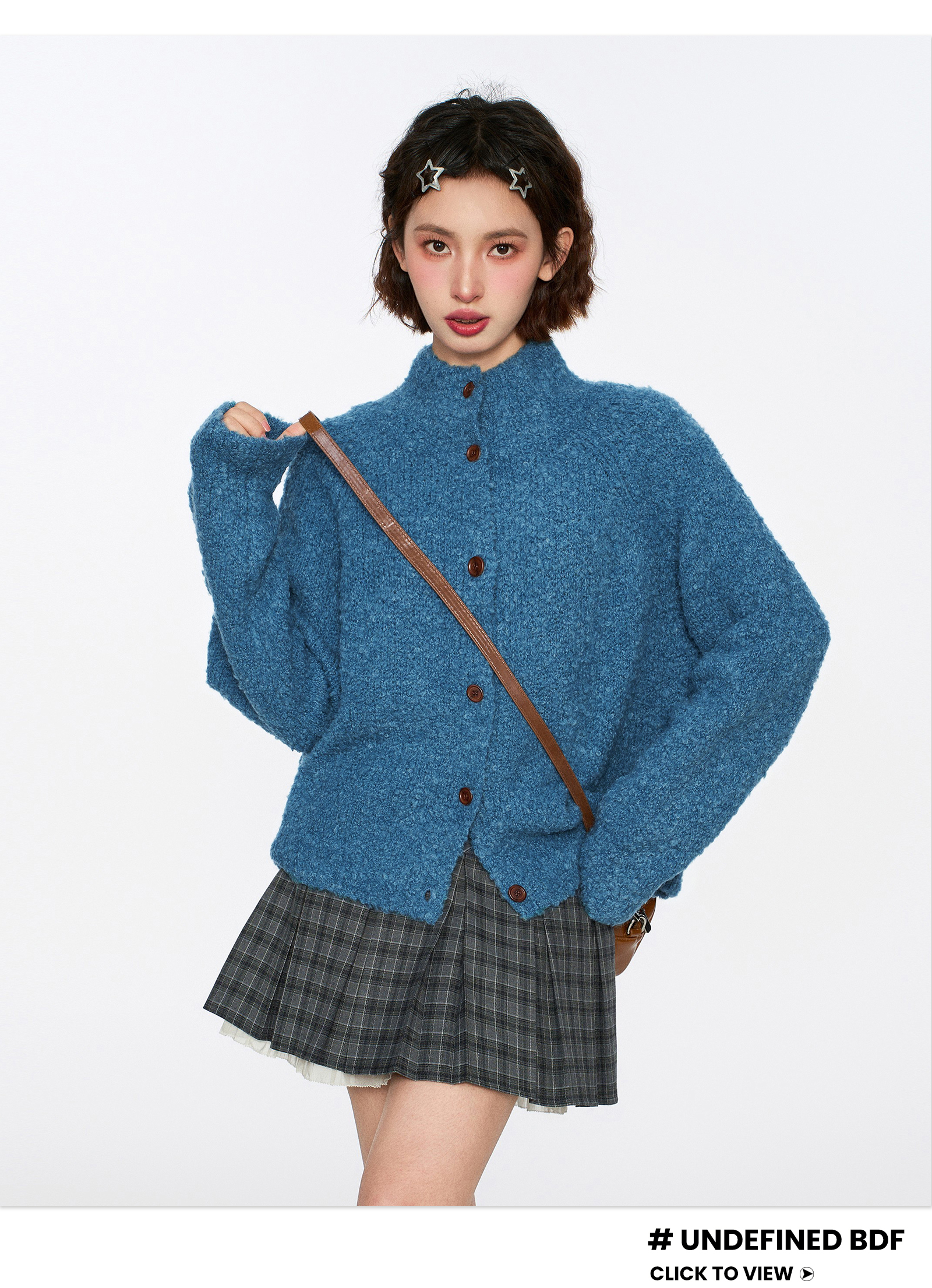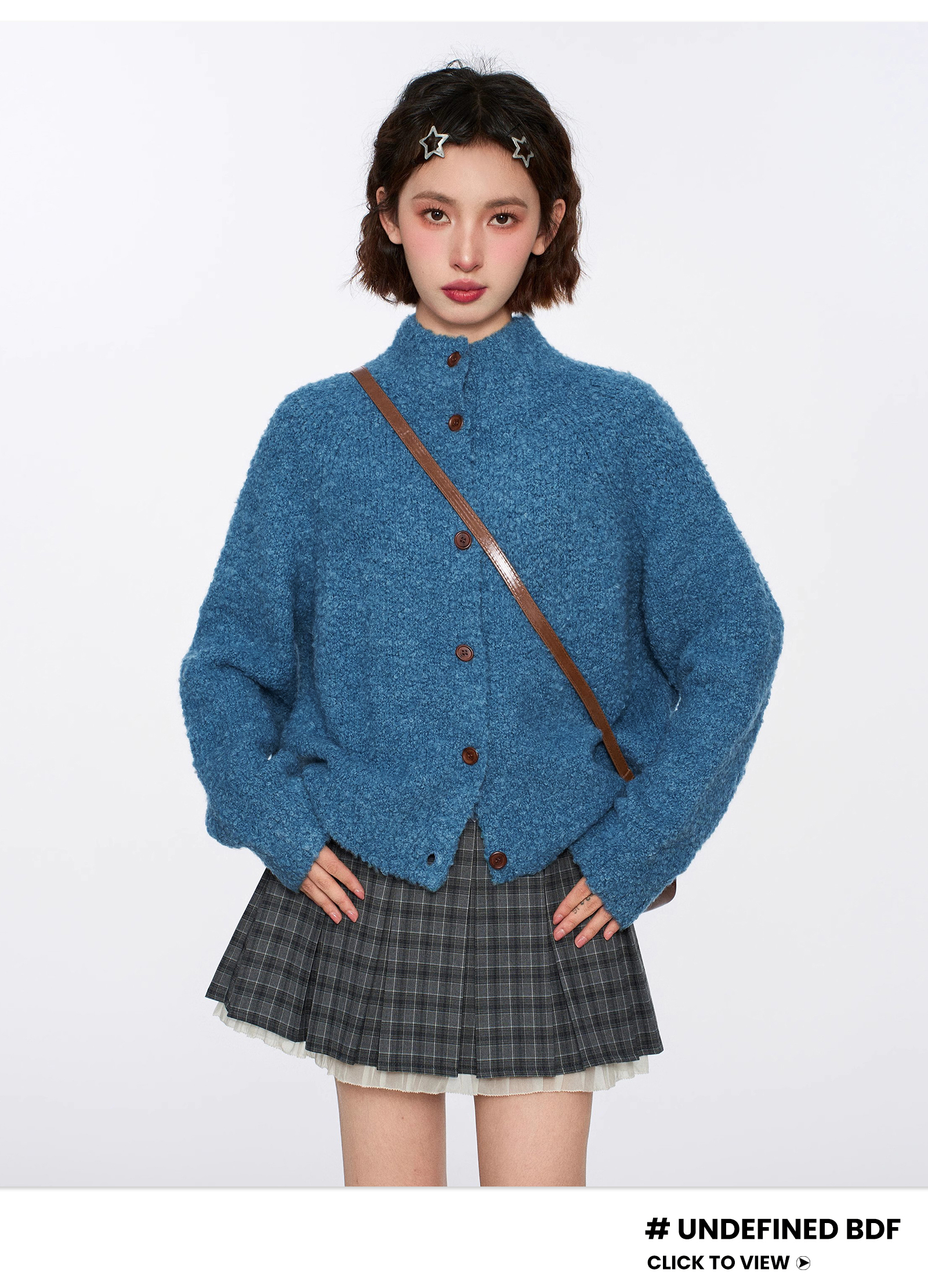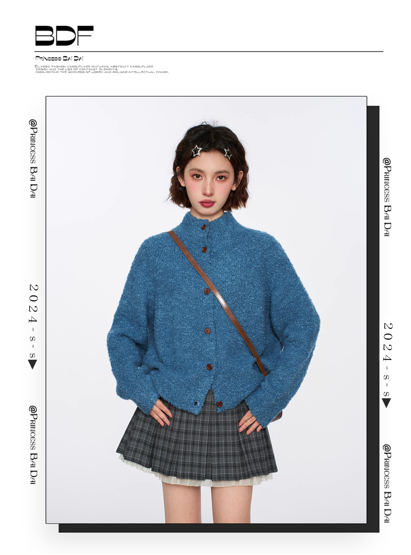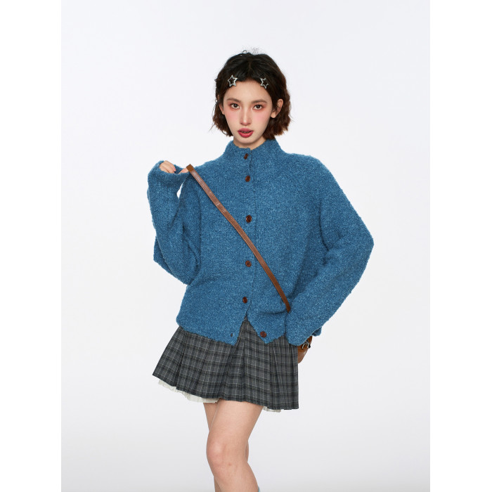 復古藍色半高領針織毛衣開衫女秋冬季寬松慵懶浣熊絨立領加厚外套