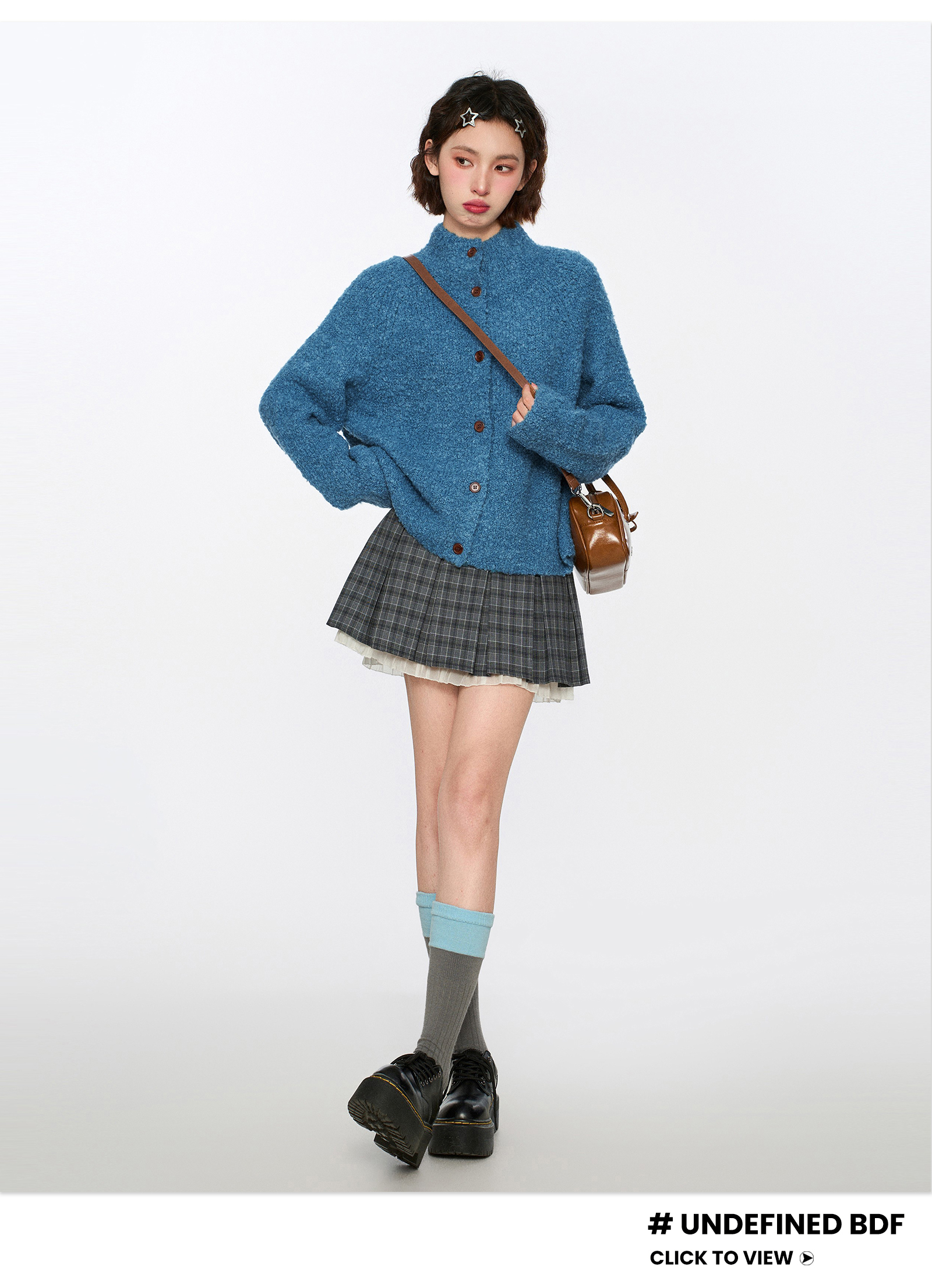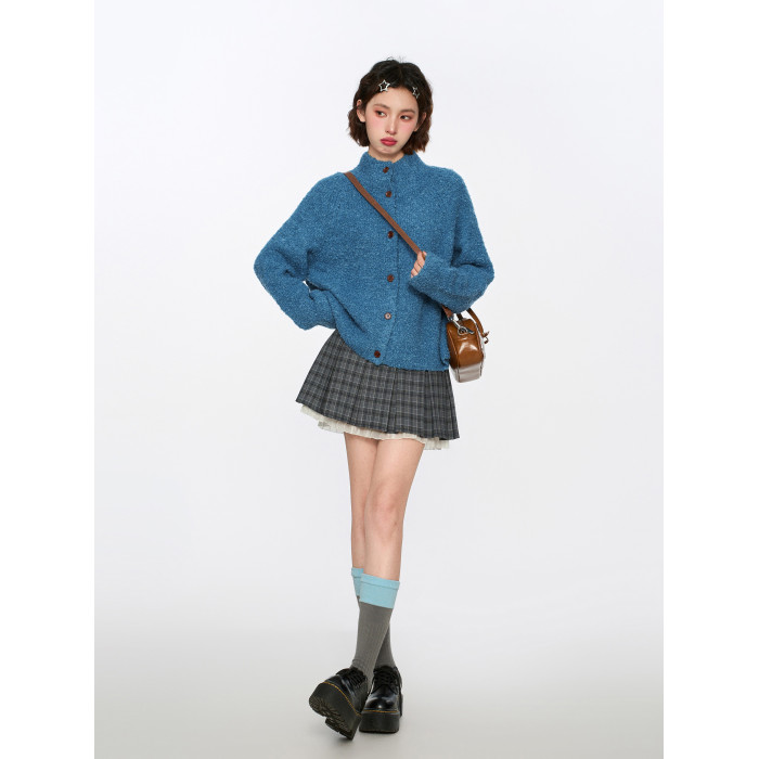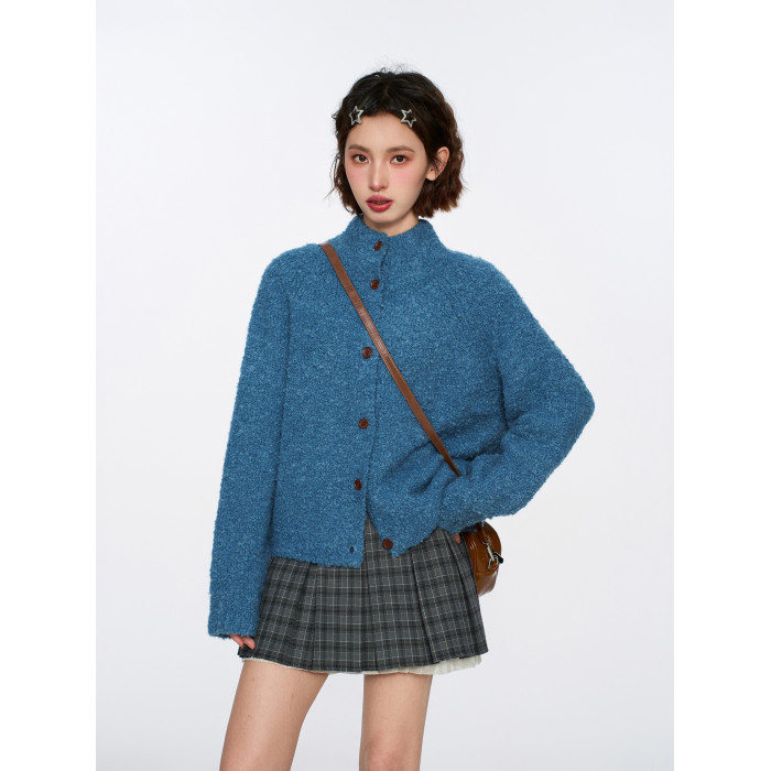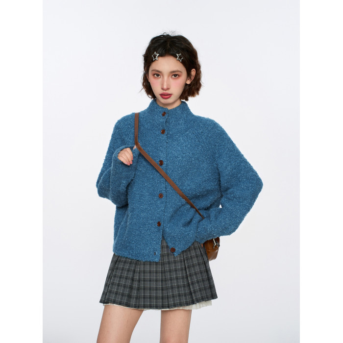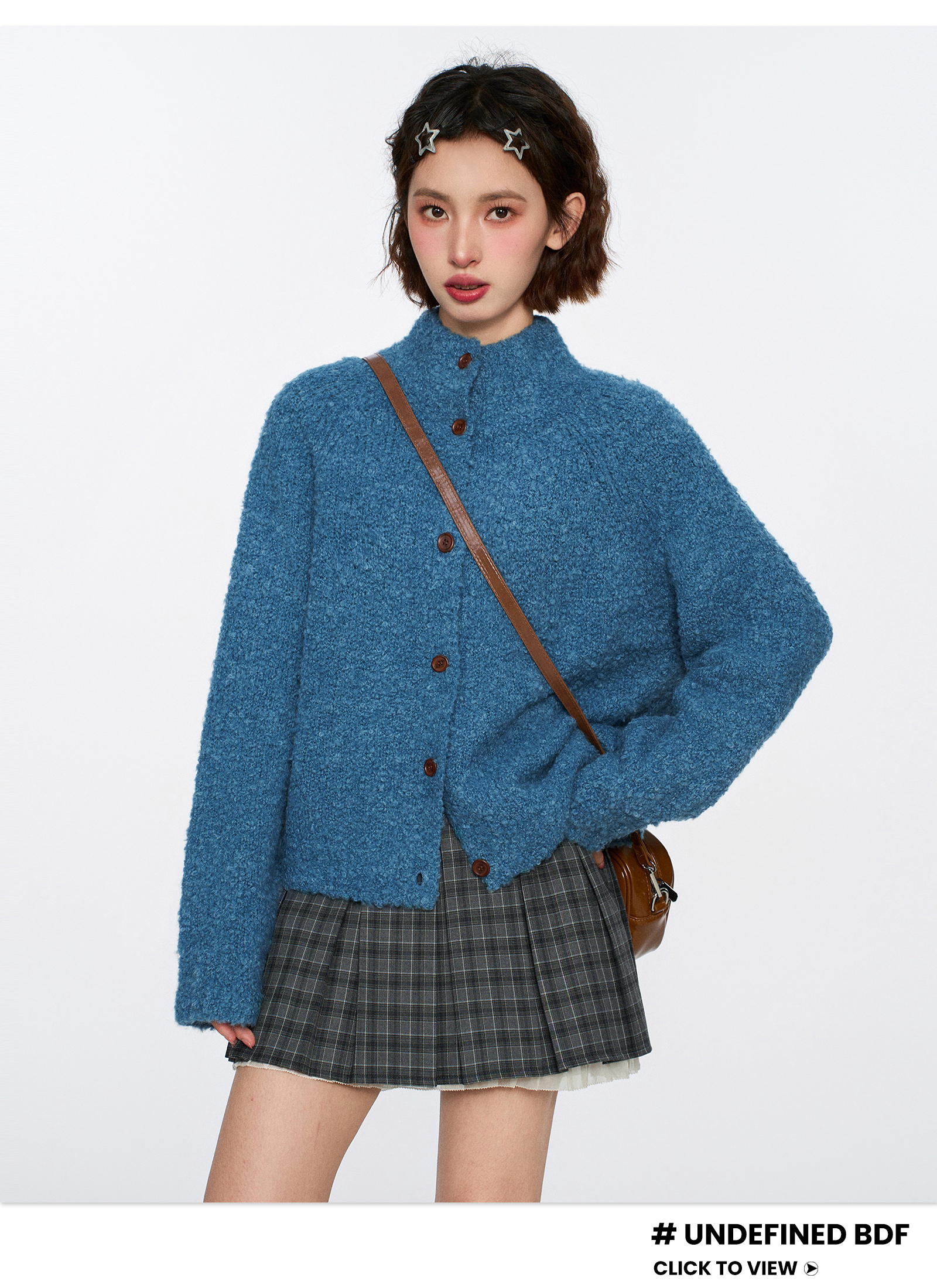 復古藍色半高領針織毛衣開衫女秋冬季寬松慵懶浣熊絨立領加厚外套