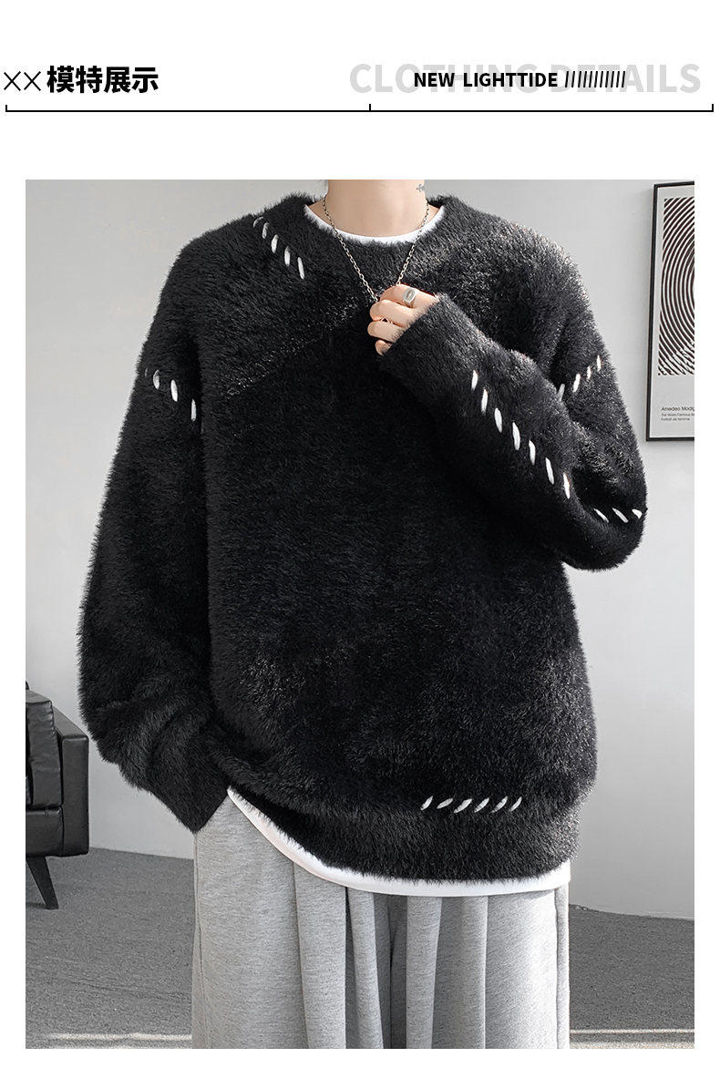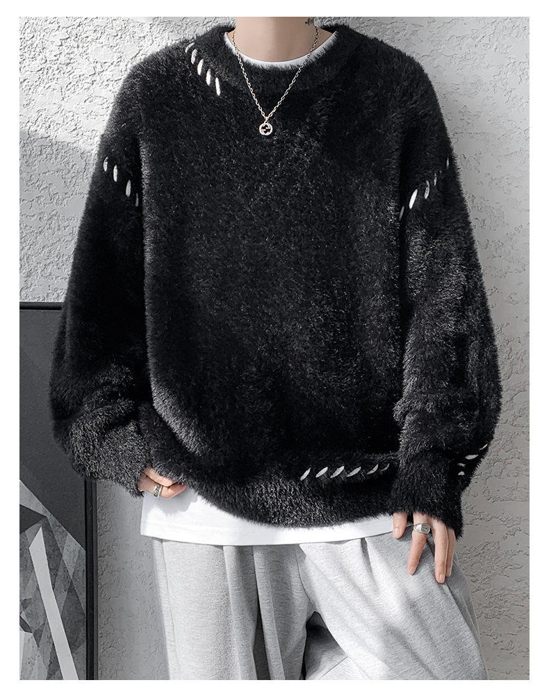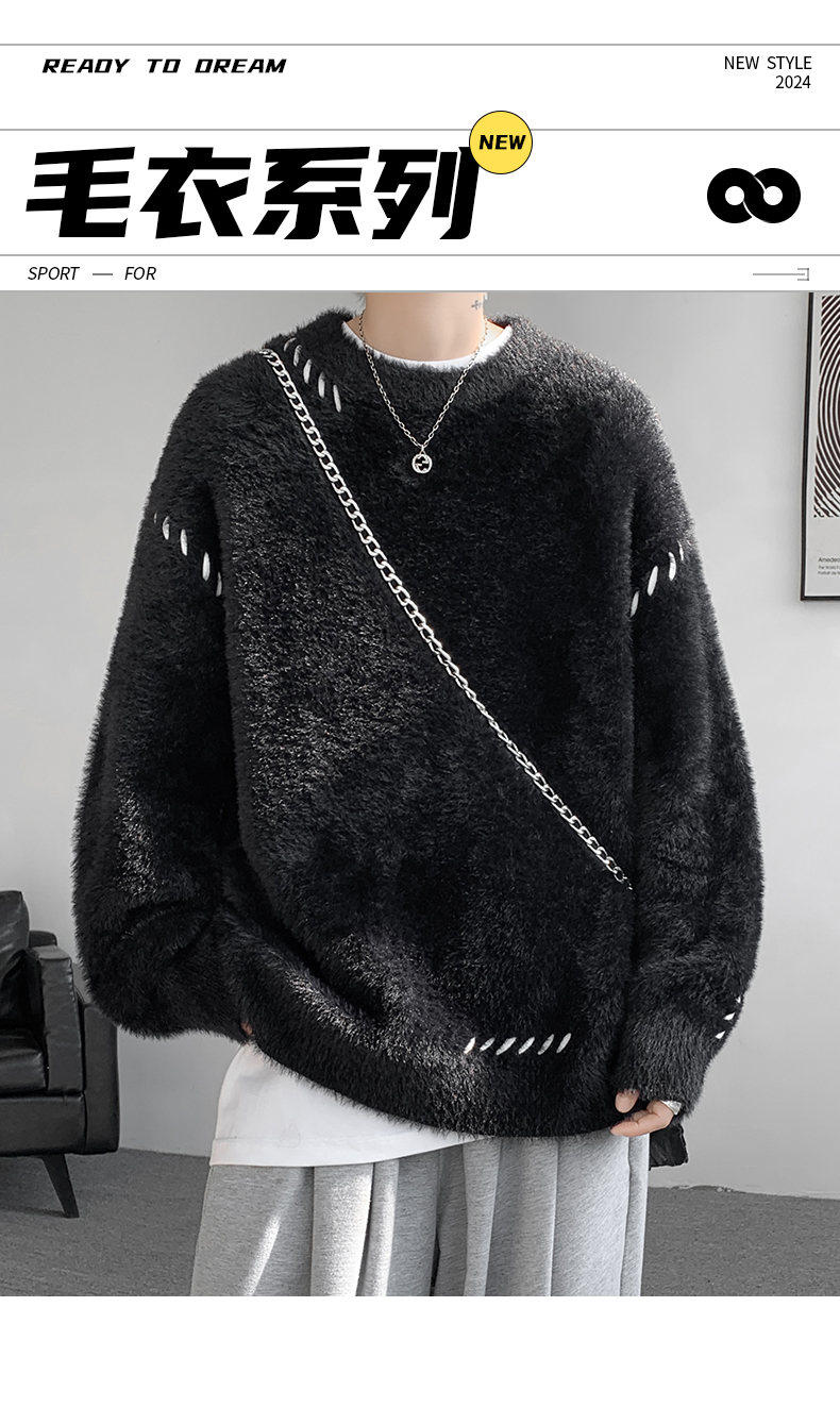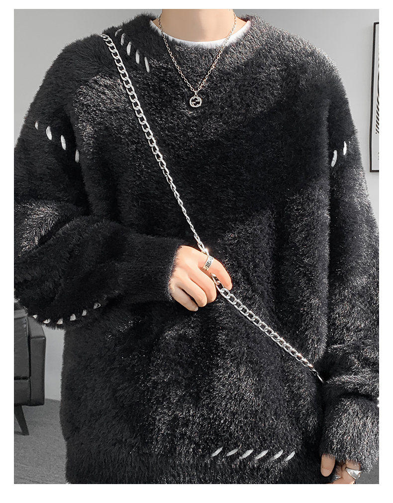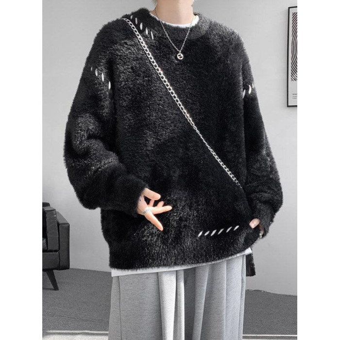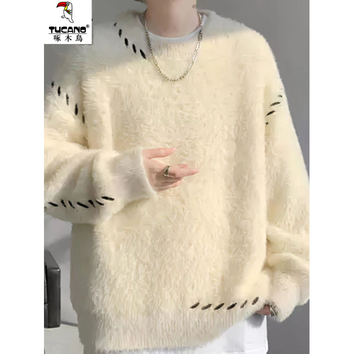 啄木鳥貂絨毛衣男秋冬季青少年慵嬾風潮流寬鬆百搭休閒純色針織衫