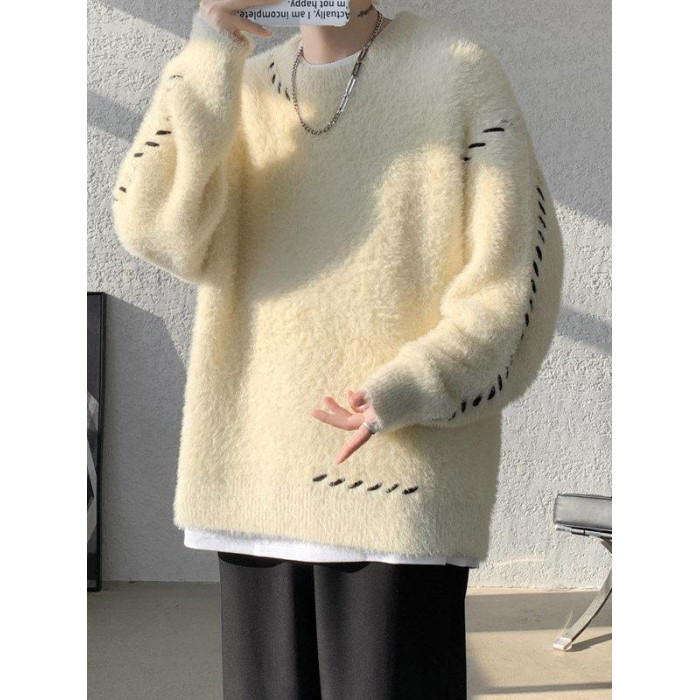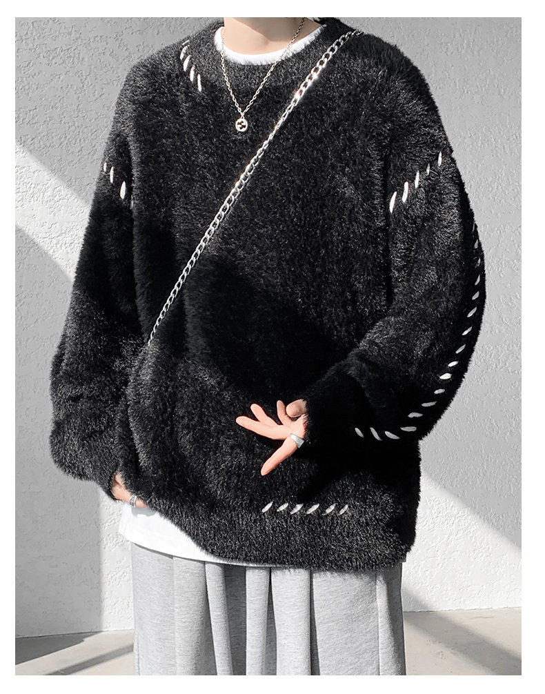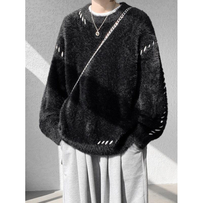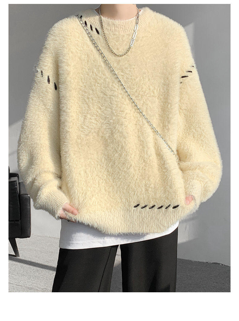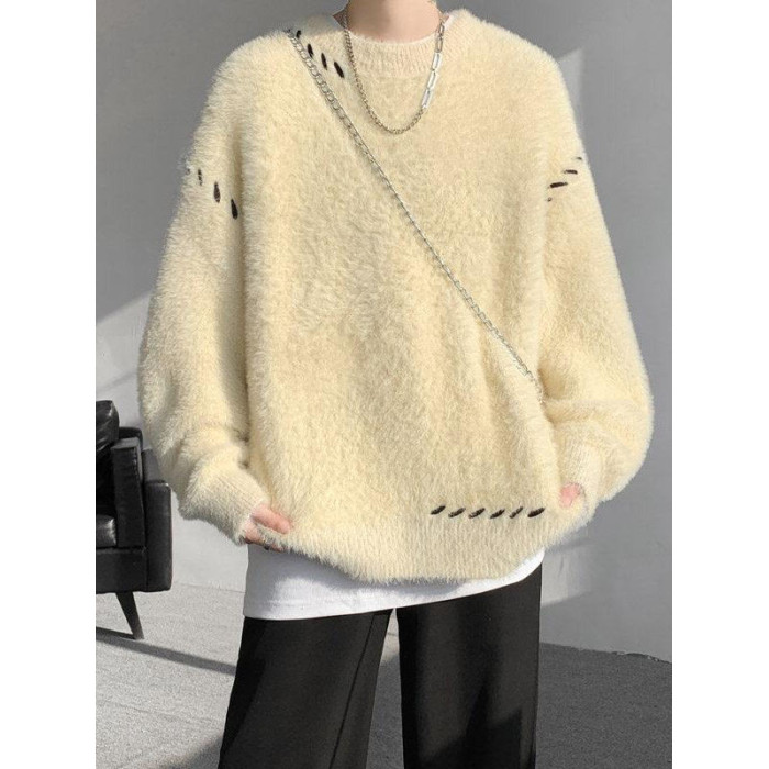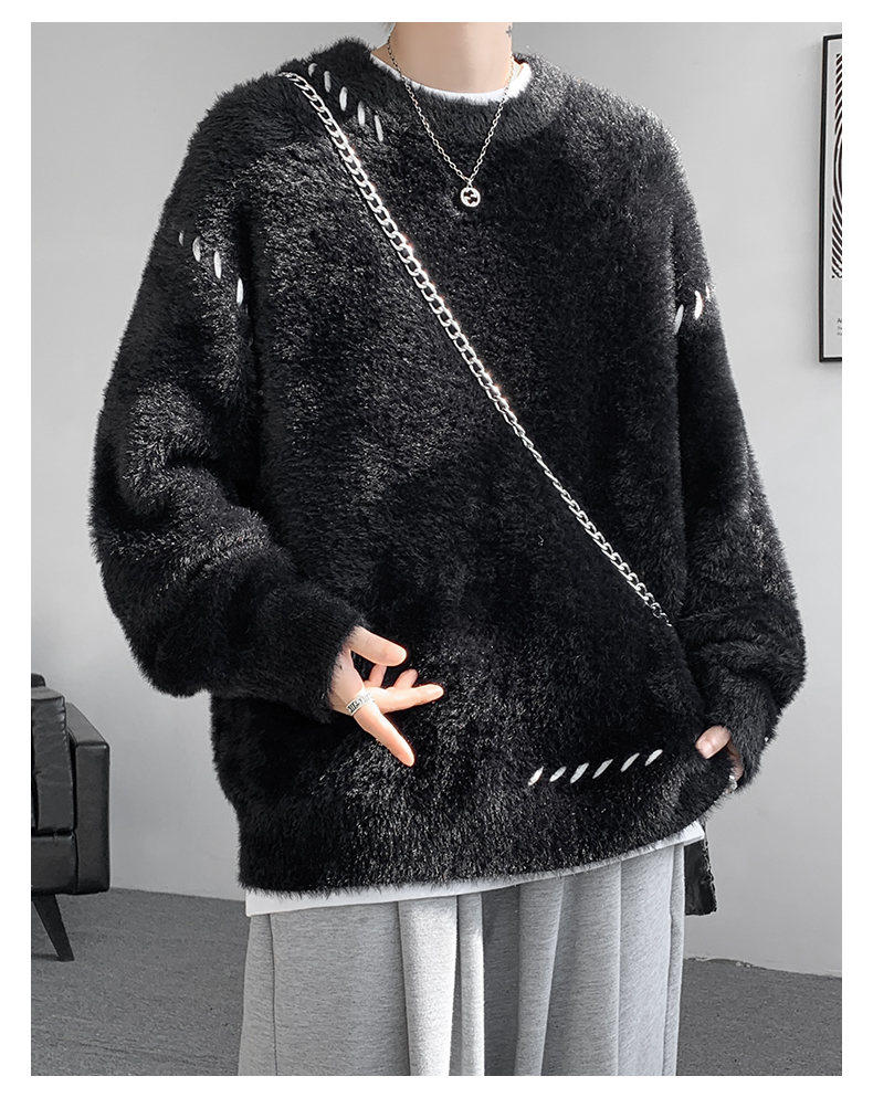 啄木鳥貂絨毛衣男秋冬季青少年慵嬾風潮流寬鬆百搭休閒純色針織衫
