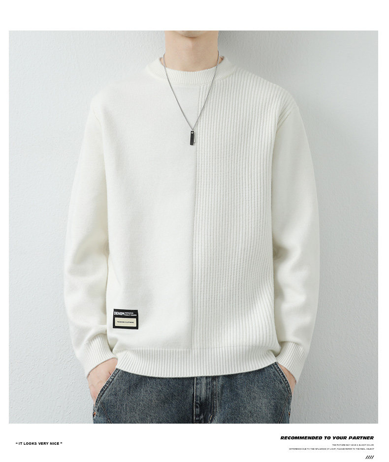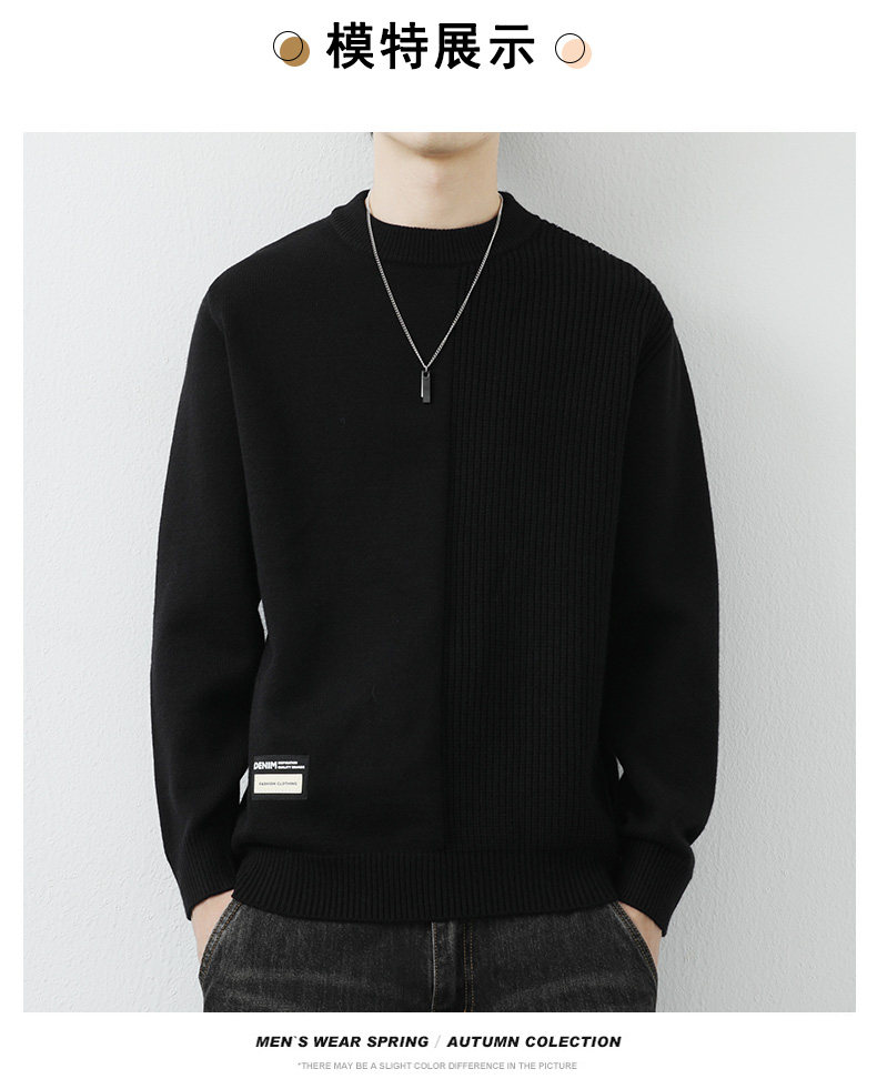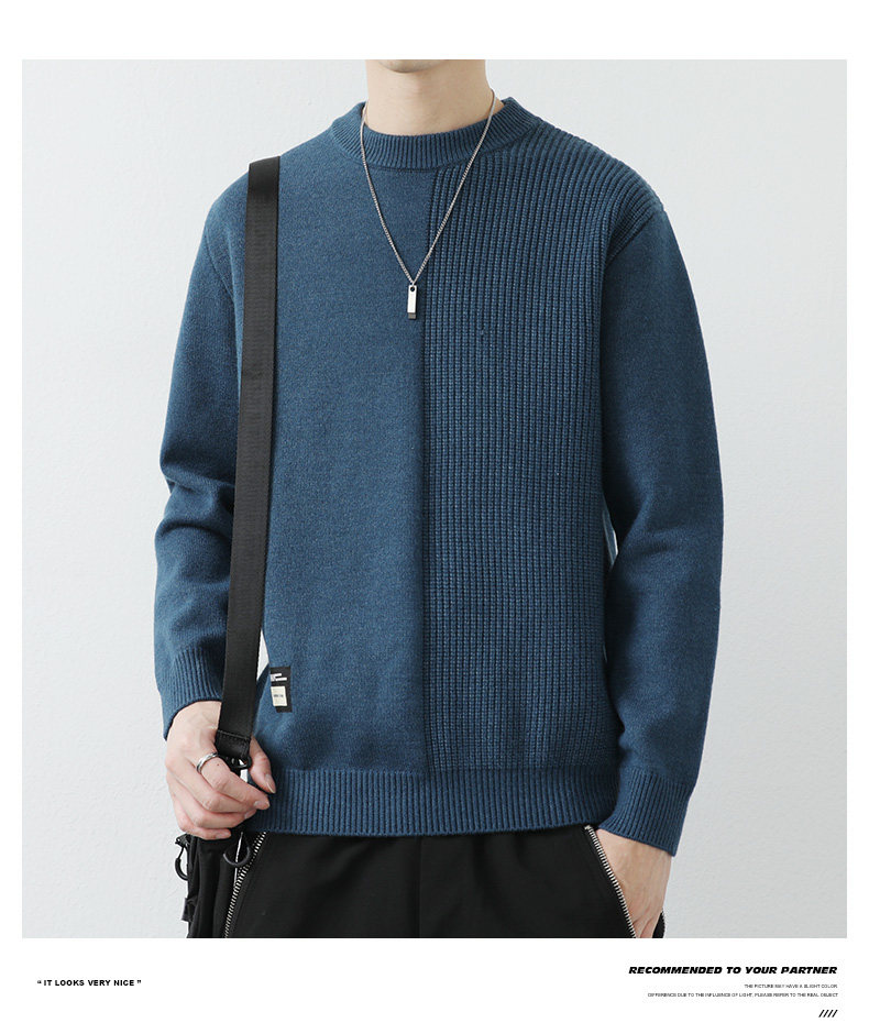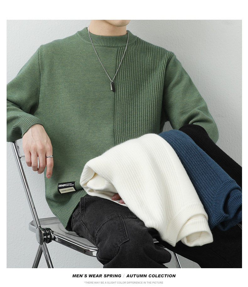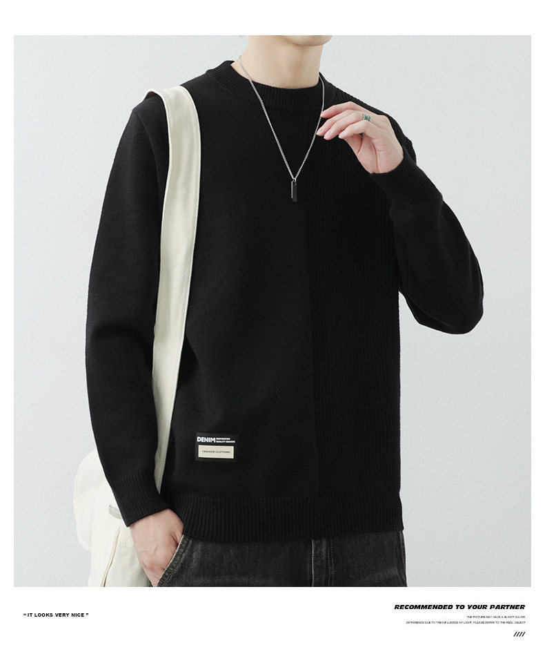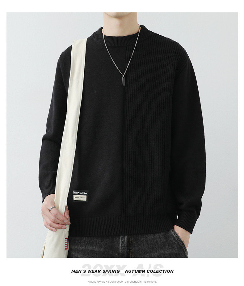高級感拼接圓領毛衣男士打底衫秋冬季寬鬆日系簡約針織衫休閒線衣