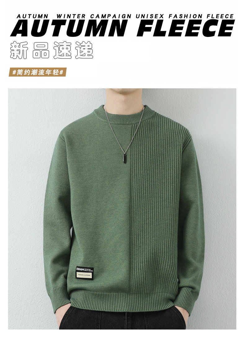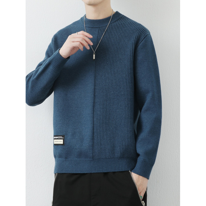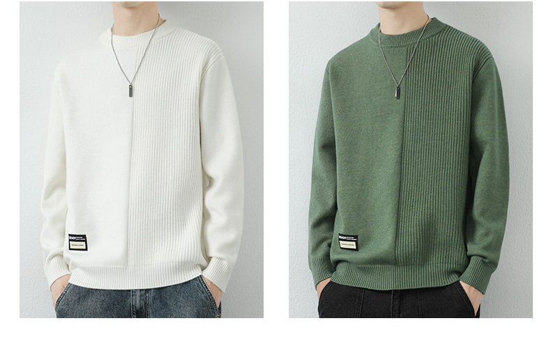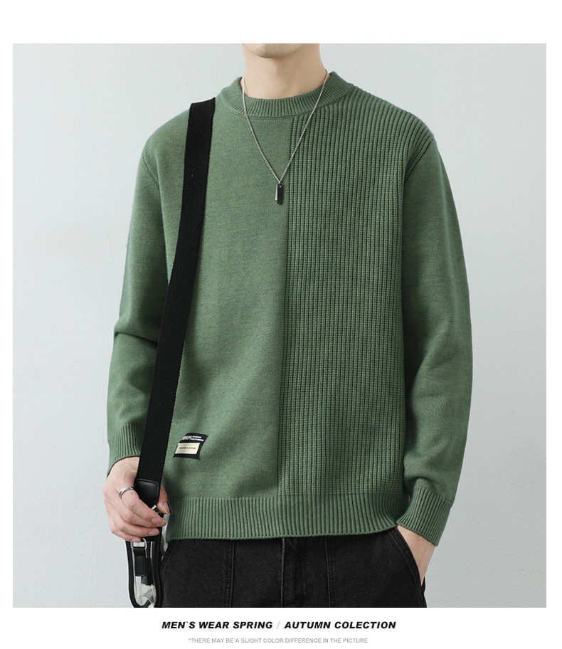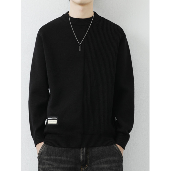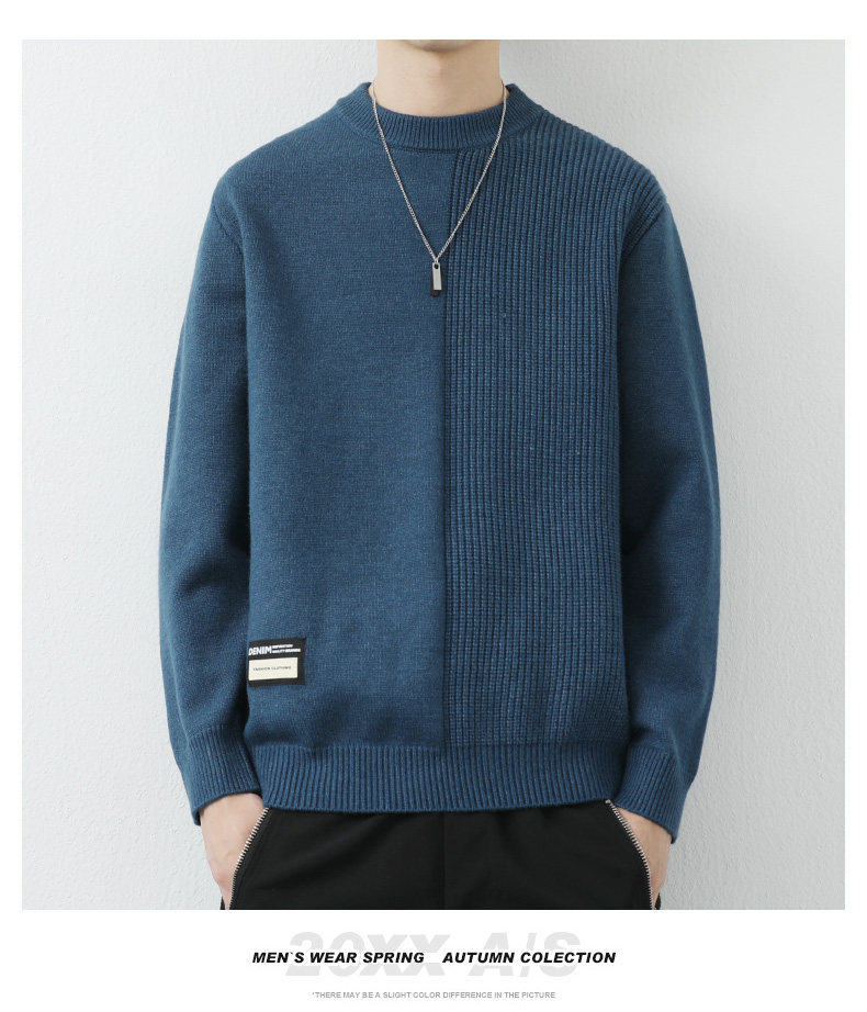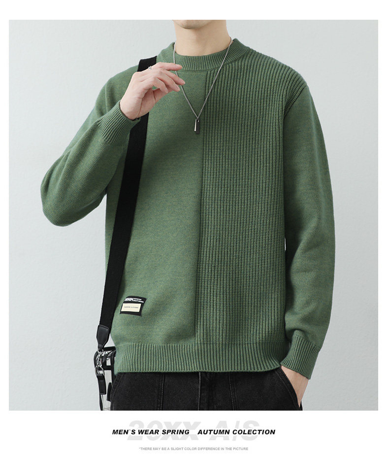 高級感拼接圓領毛衣男士打底衫秋冬季寬鬆日系簡約針織衫休閒線衣