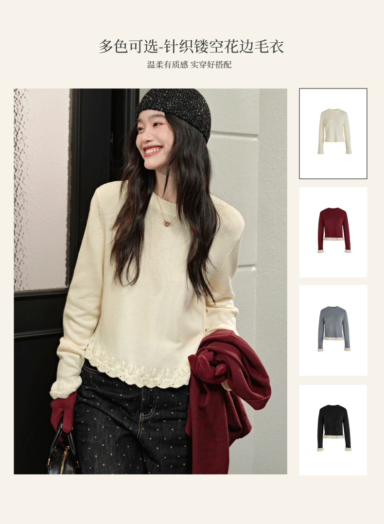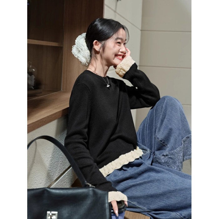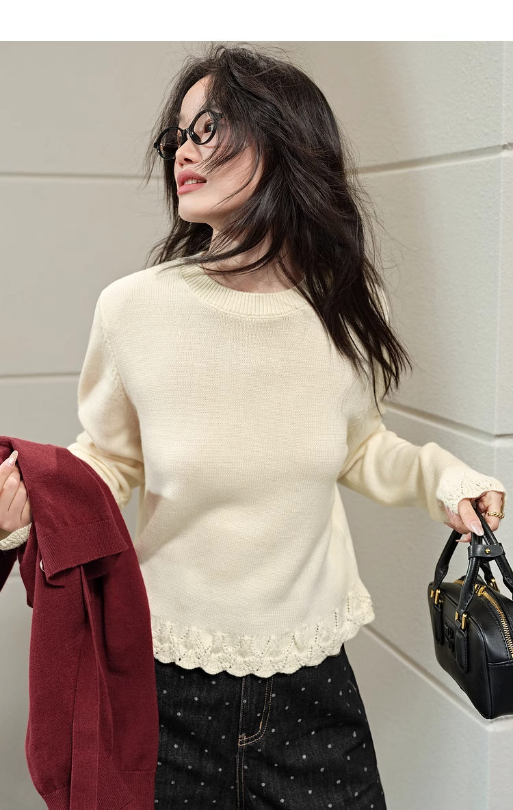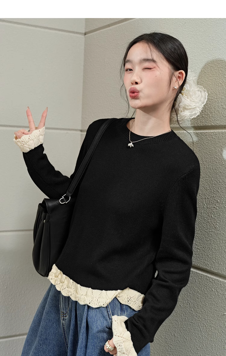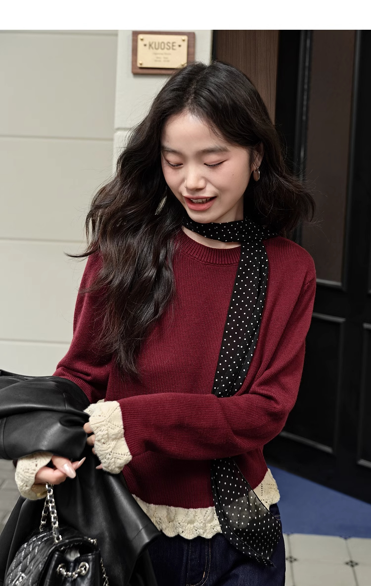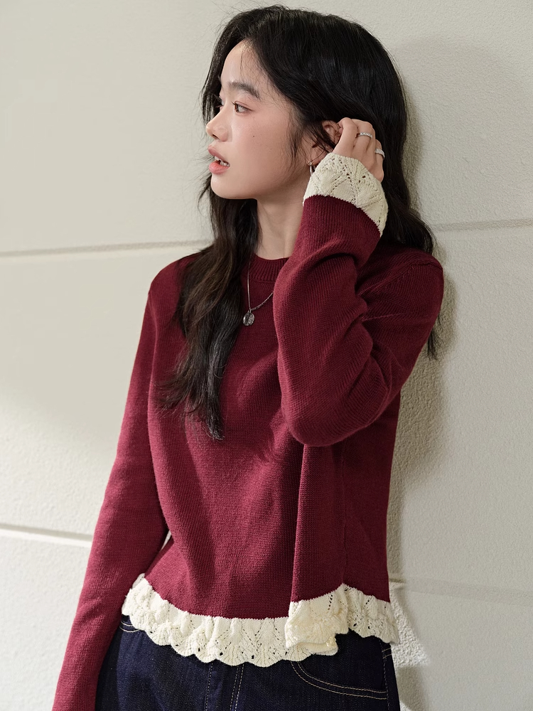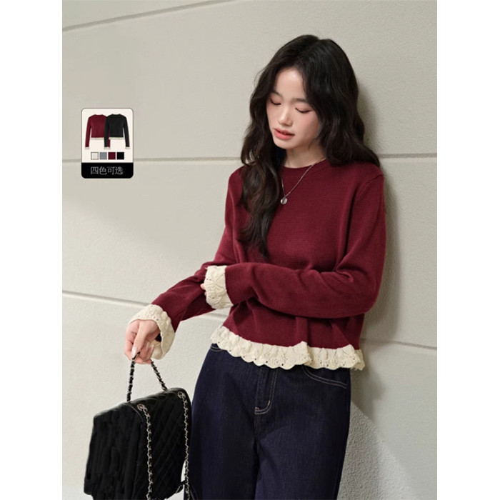 紅色假兩件毛衣女春秋季新款黑色鏤空花邊針織顯瘦內搭打底衫上衣