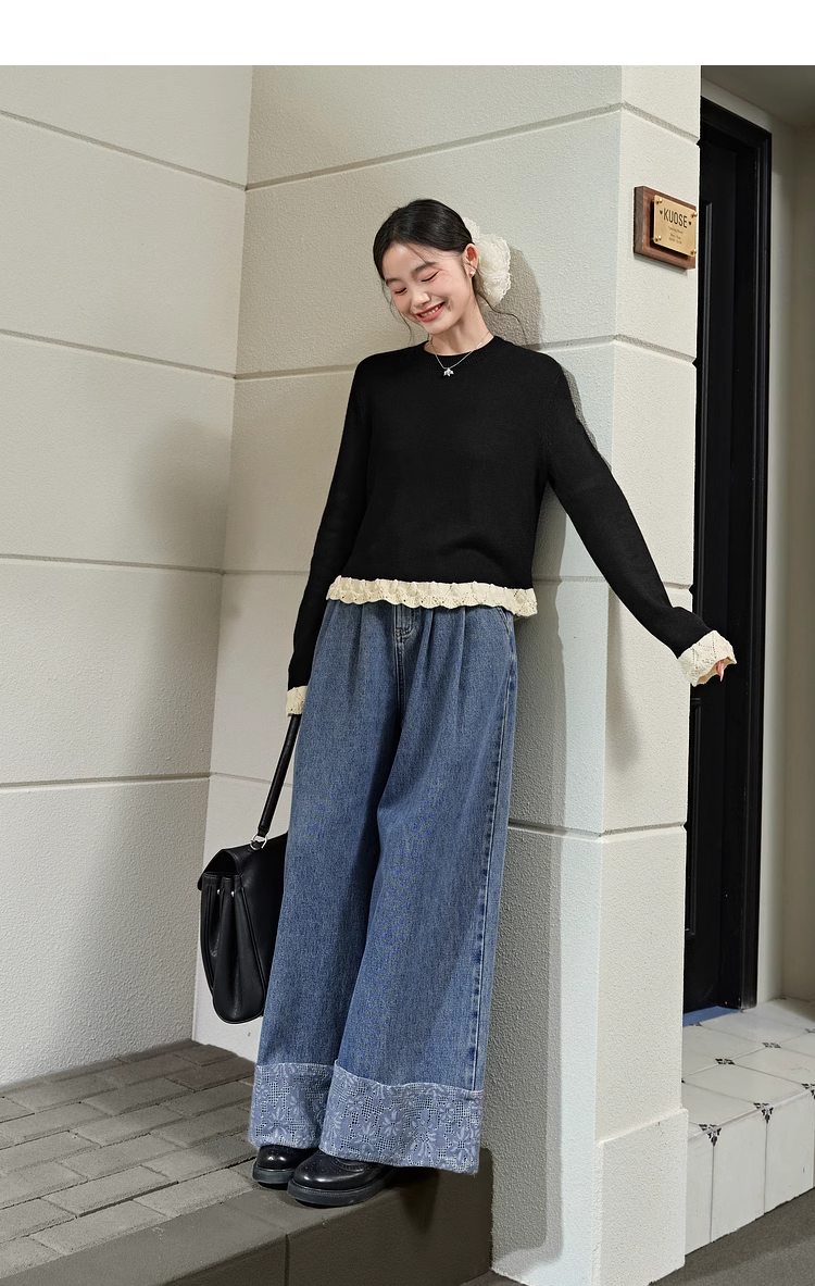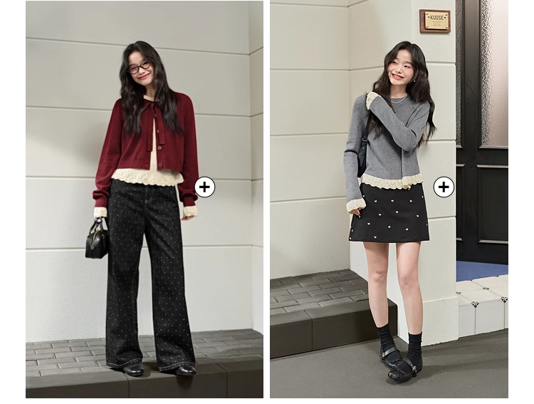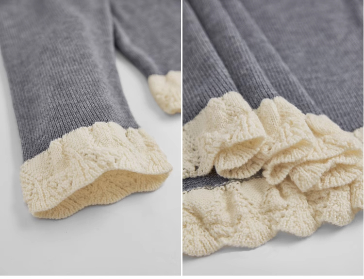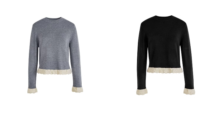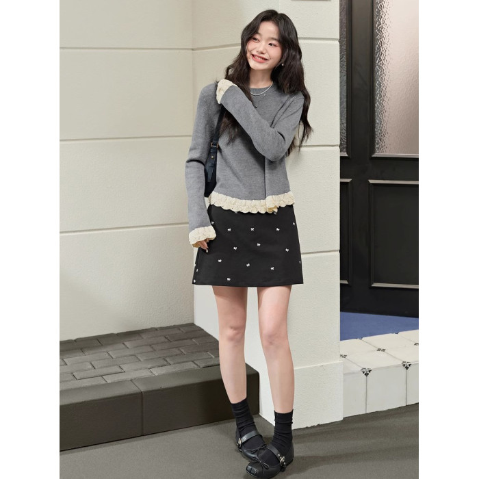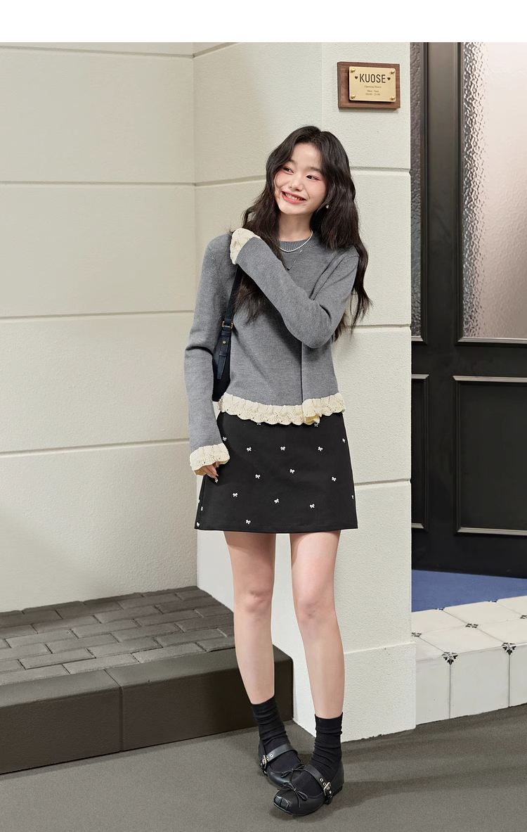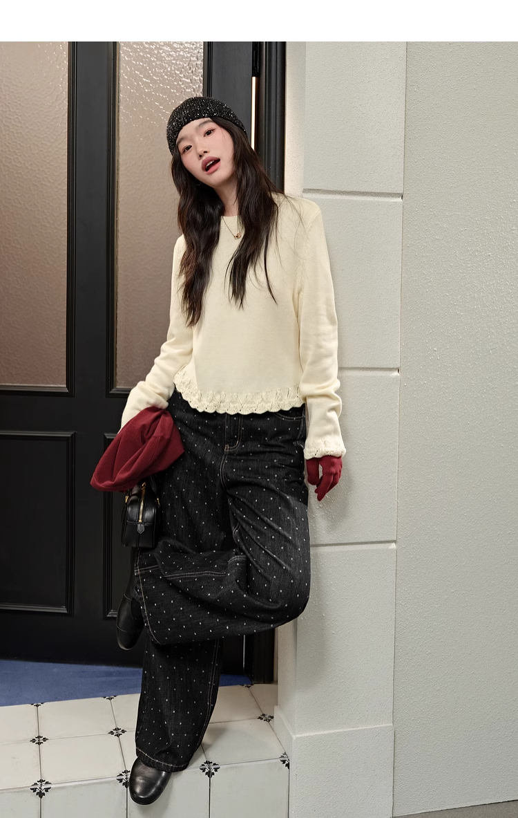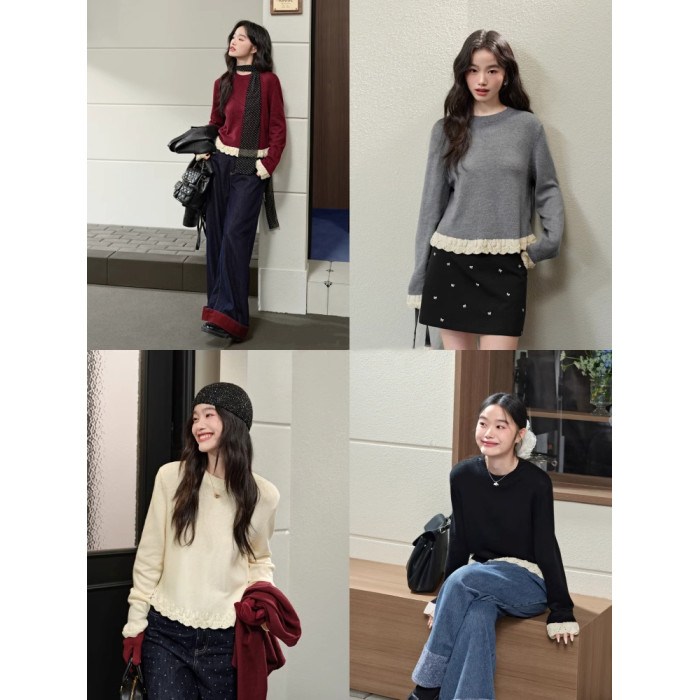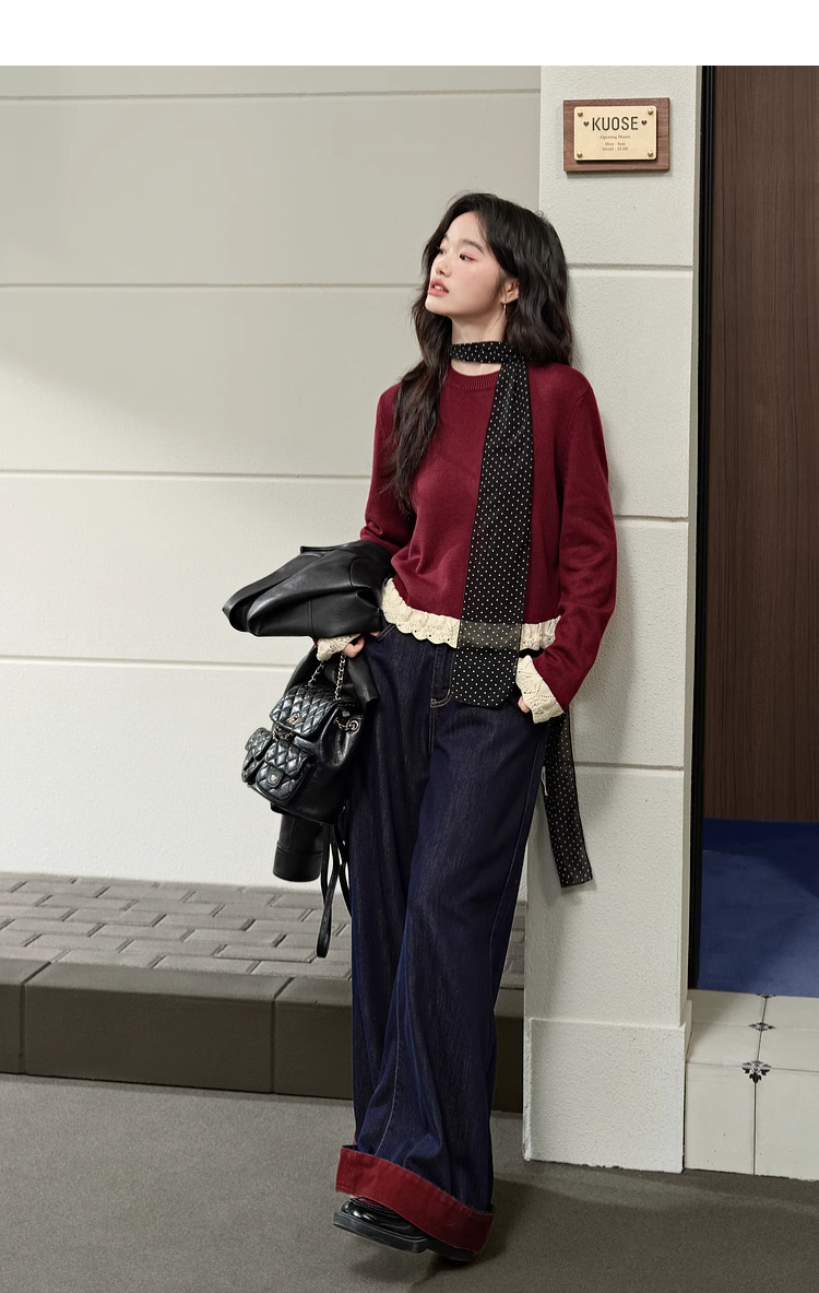 紅色假兩件毛衣女春秋季新款黑色鏤空花邊針織顯瘦內搭打底衫上衣