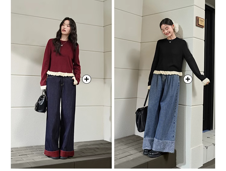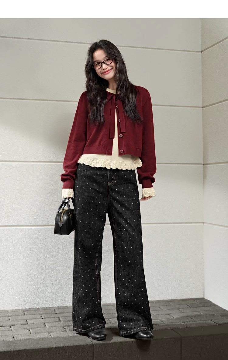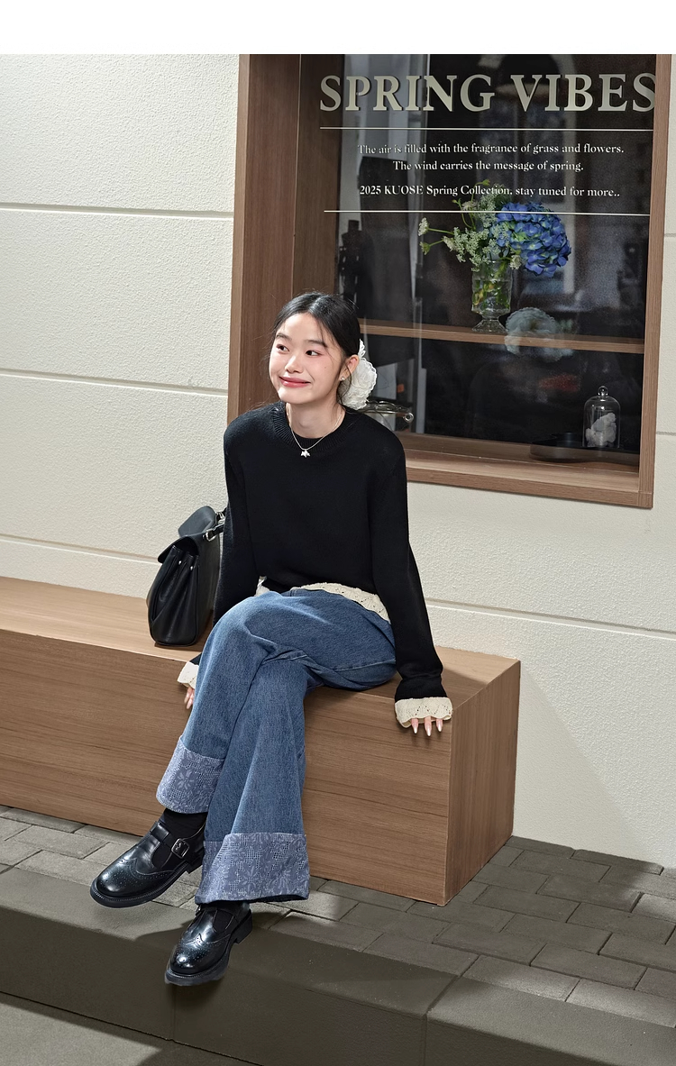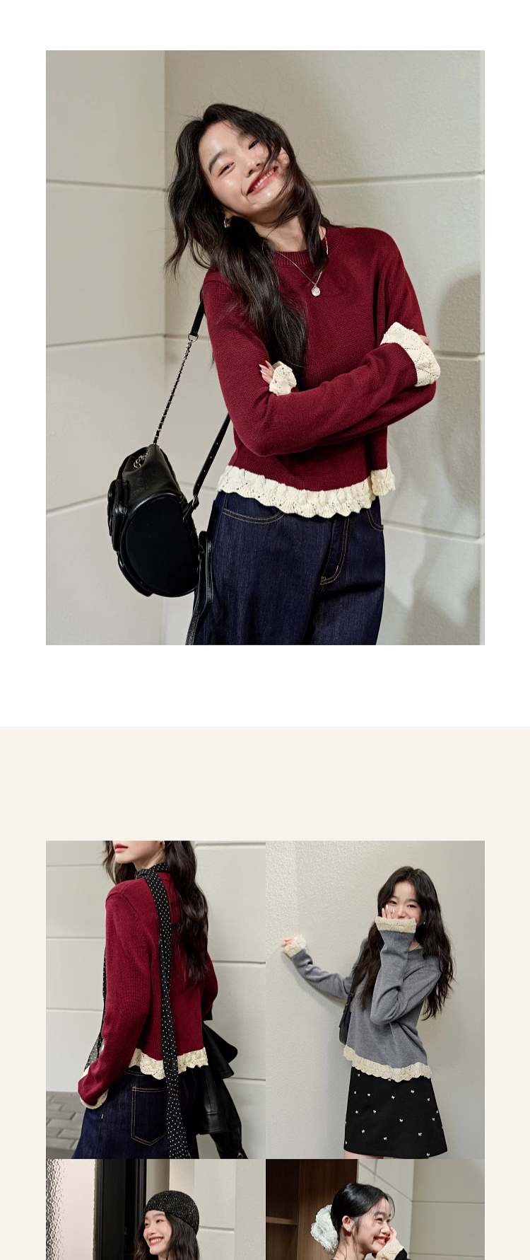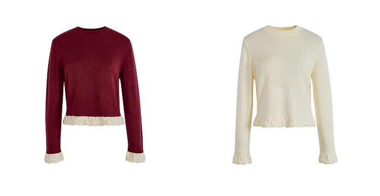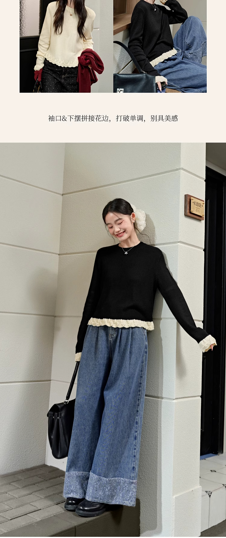 紅色假兩件毛衣女春秋季新款黑色鏤空花邊針織顯瘦內搭打底衫上衣