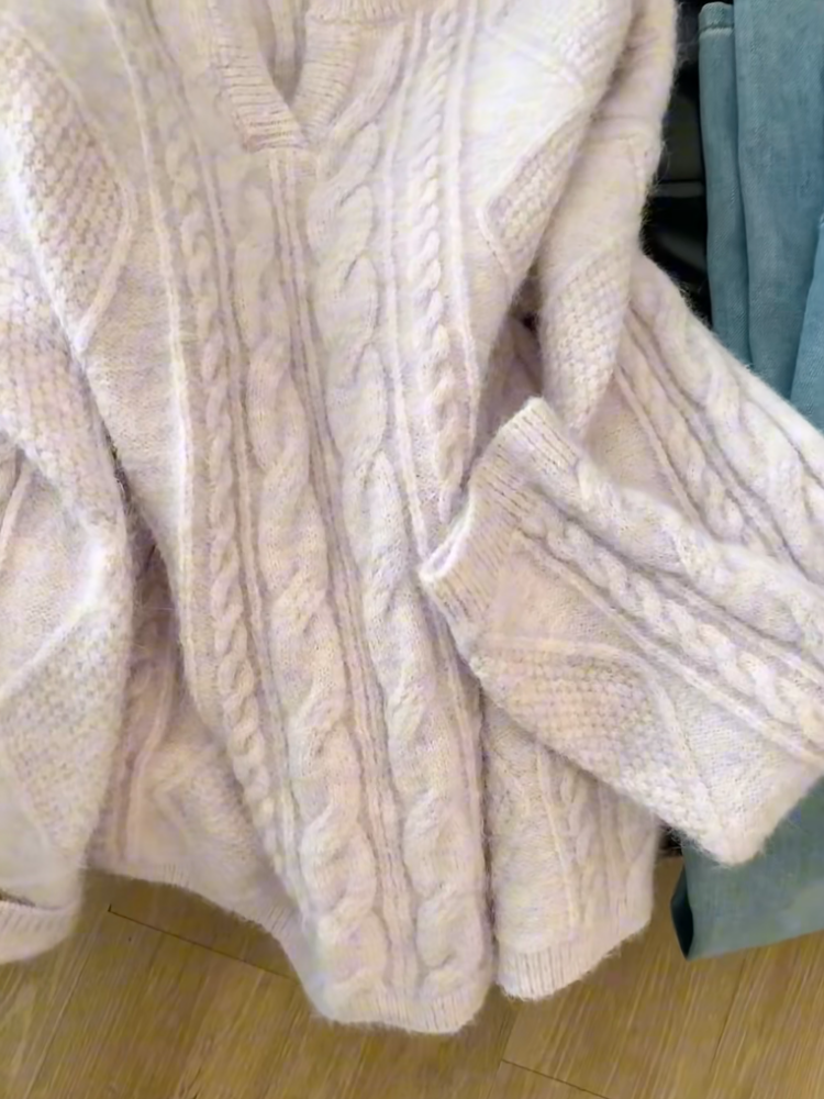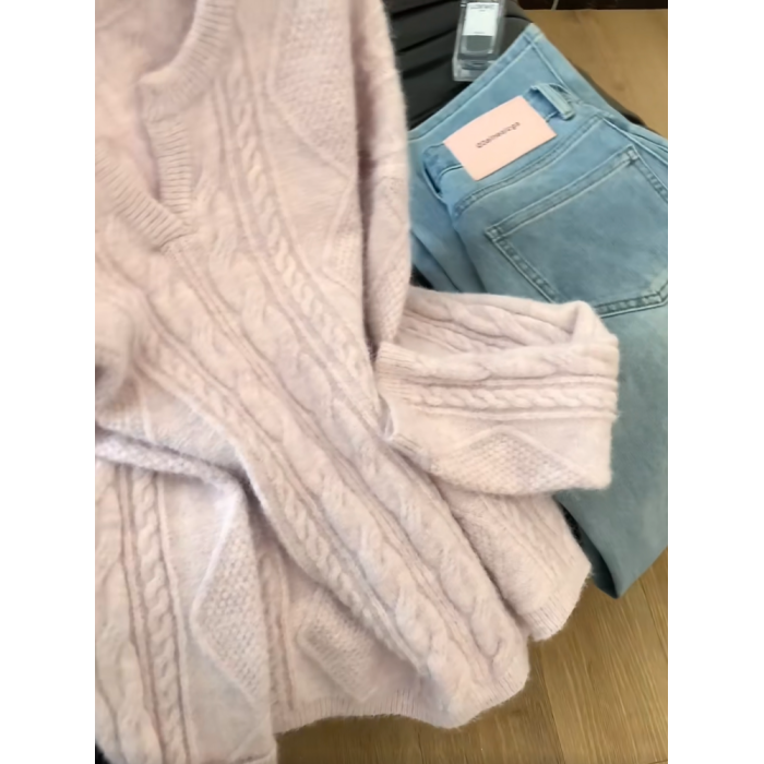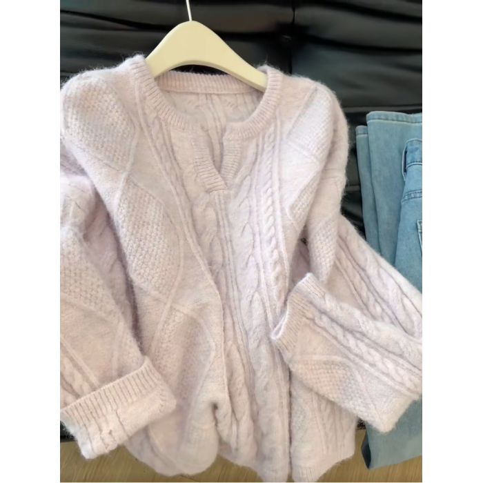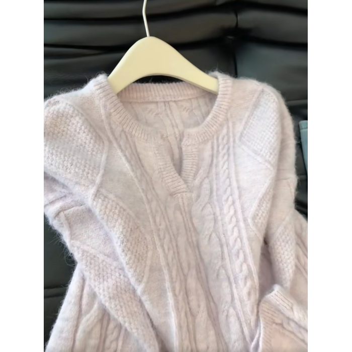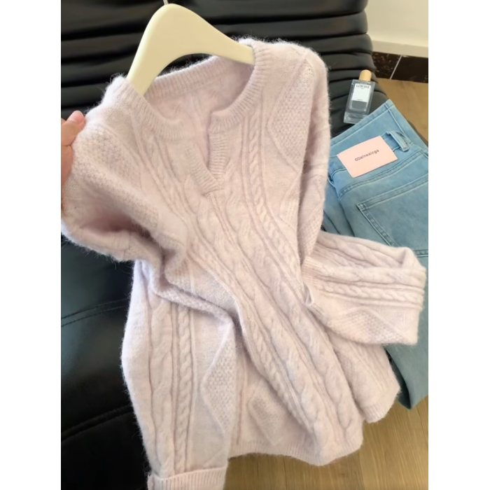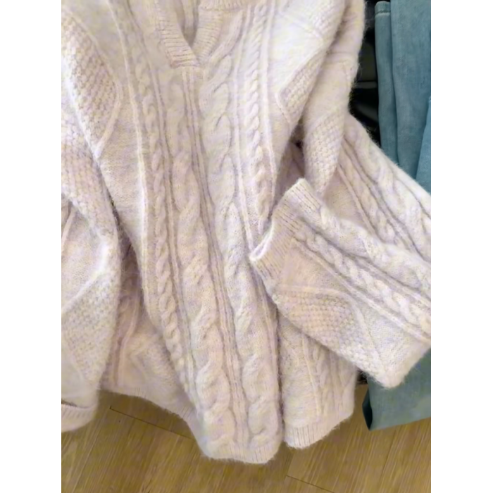 寬松大碼輕奢高級貨粉紫色麻花V領針織上衣女冬季慵懶風洋氣毛衣