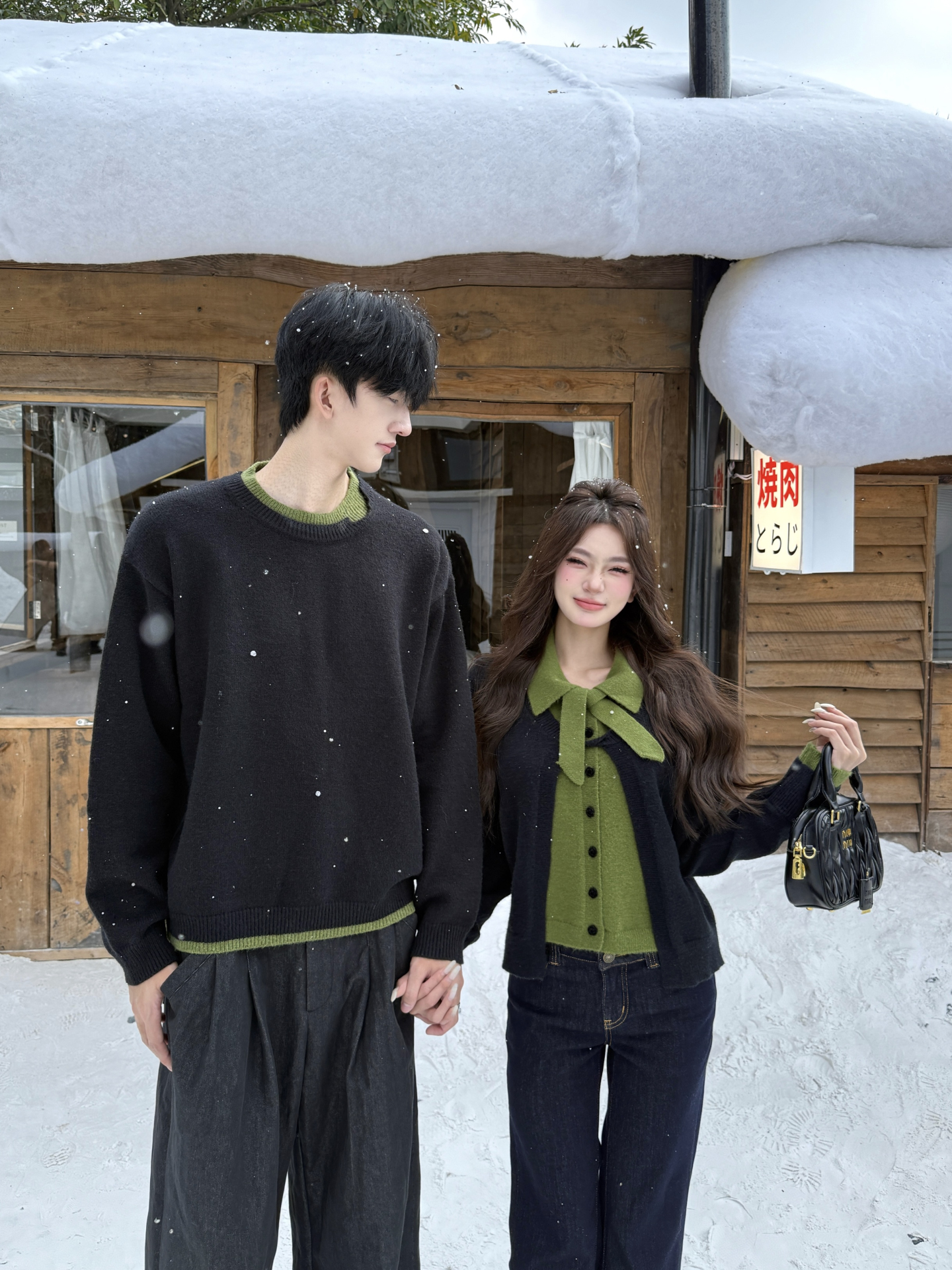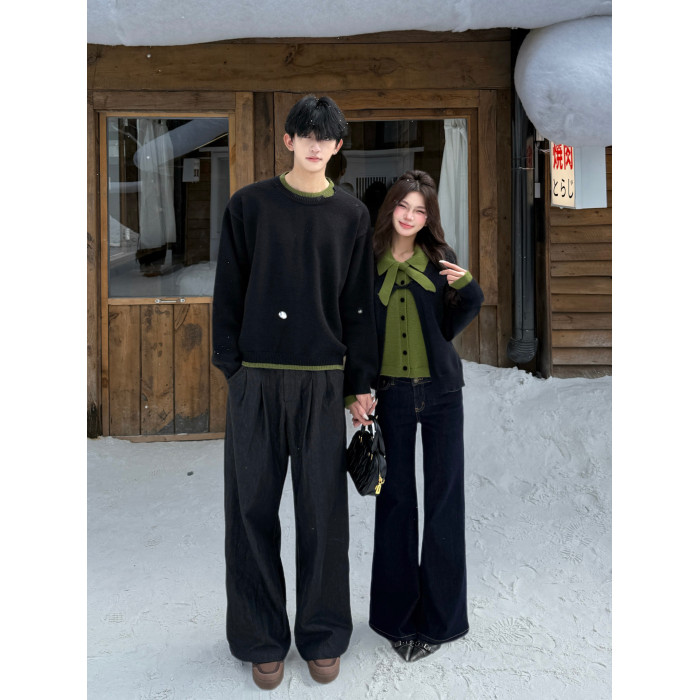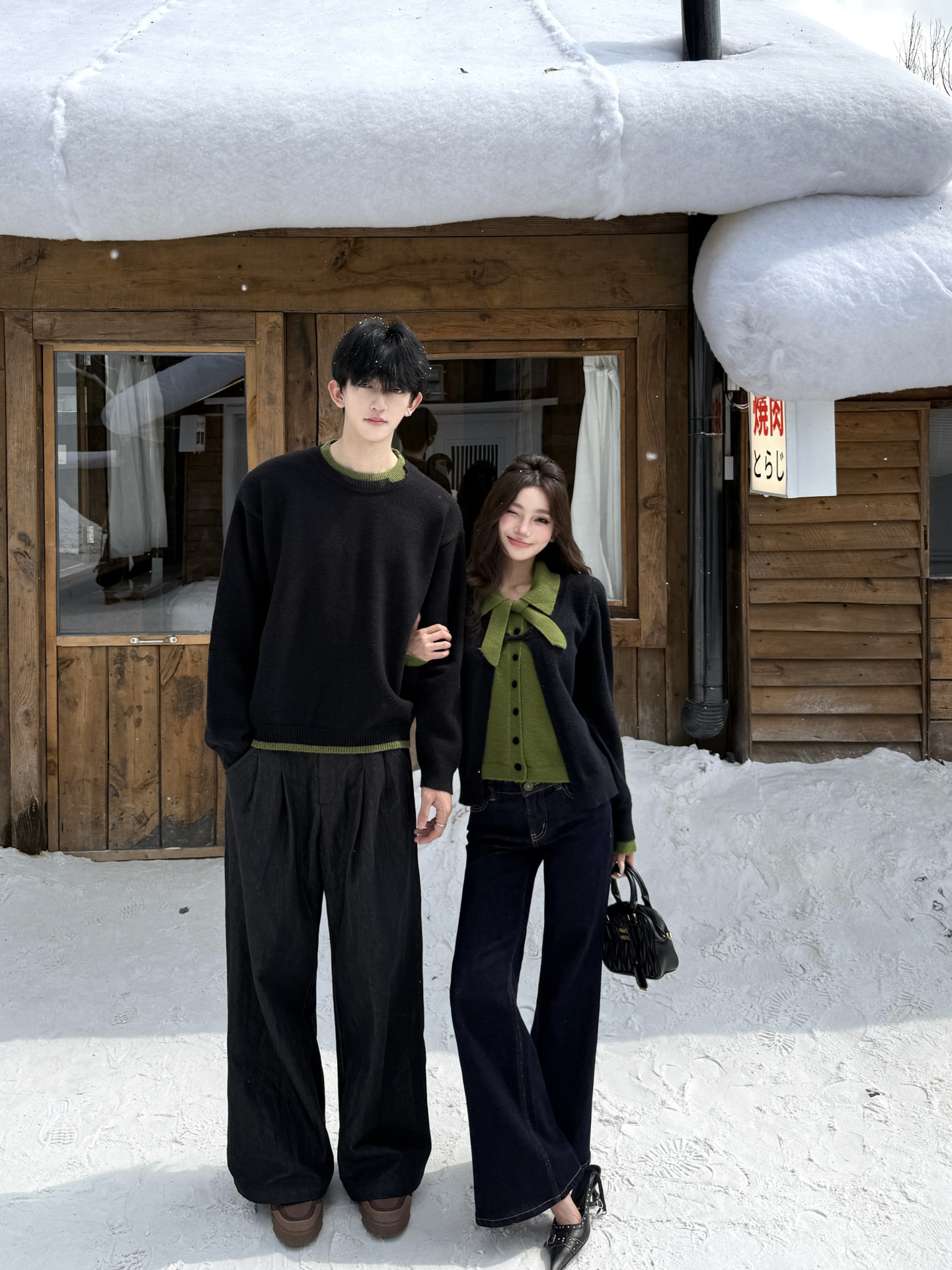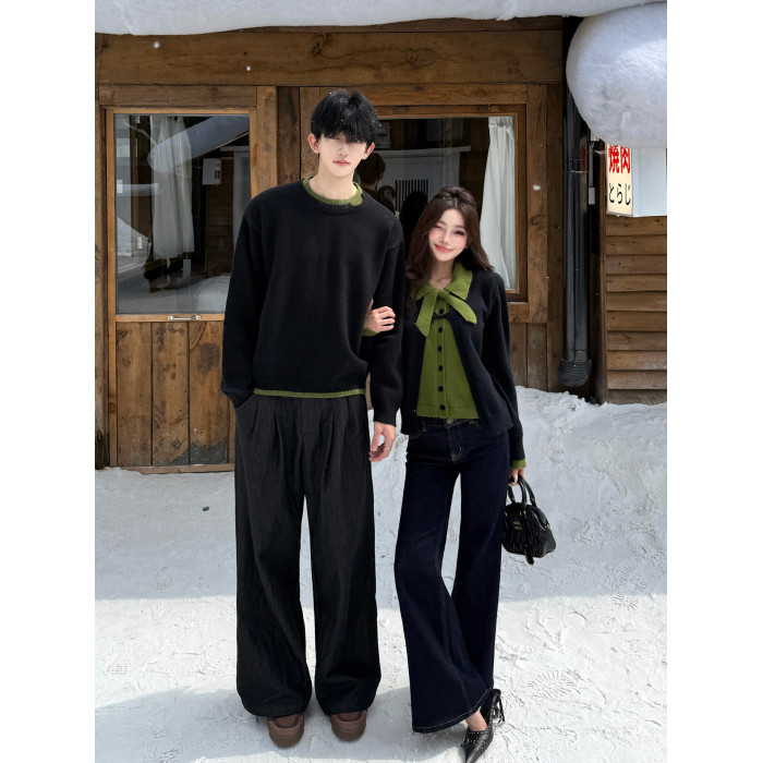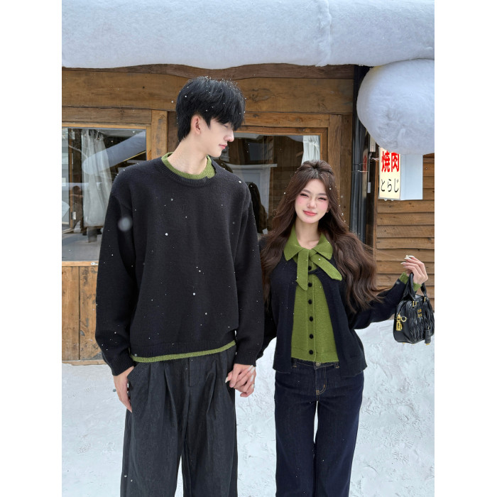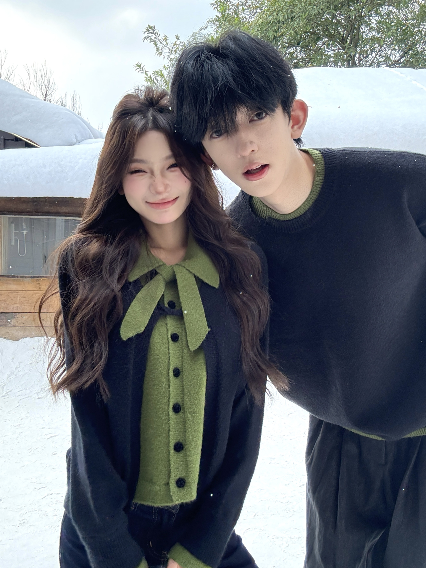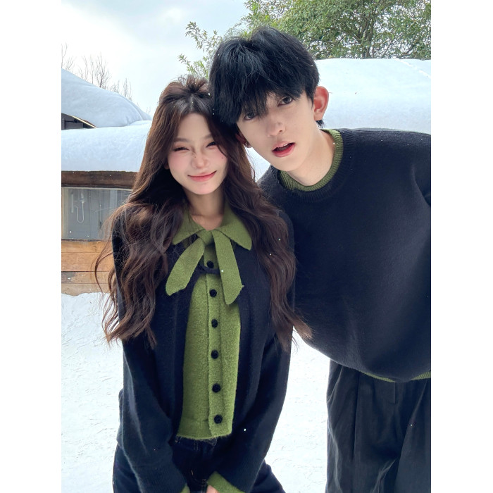 小衆設計感情侶裝毛衣秋冬假兩件撞色蝴蝶結一長一短針織開衫外套