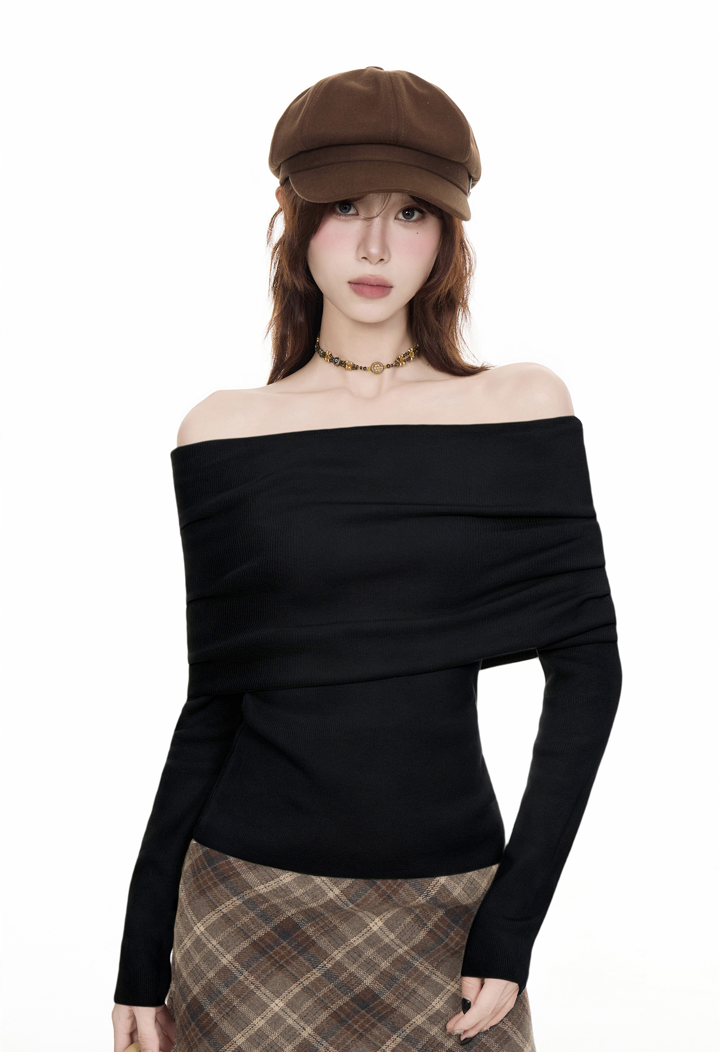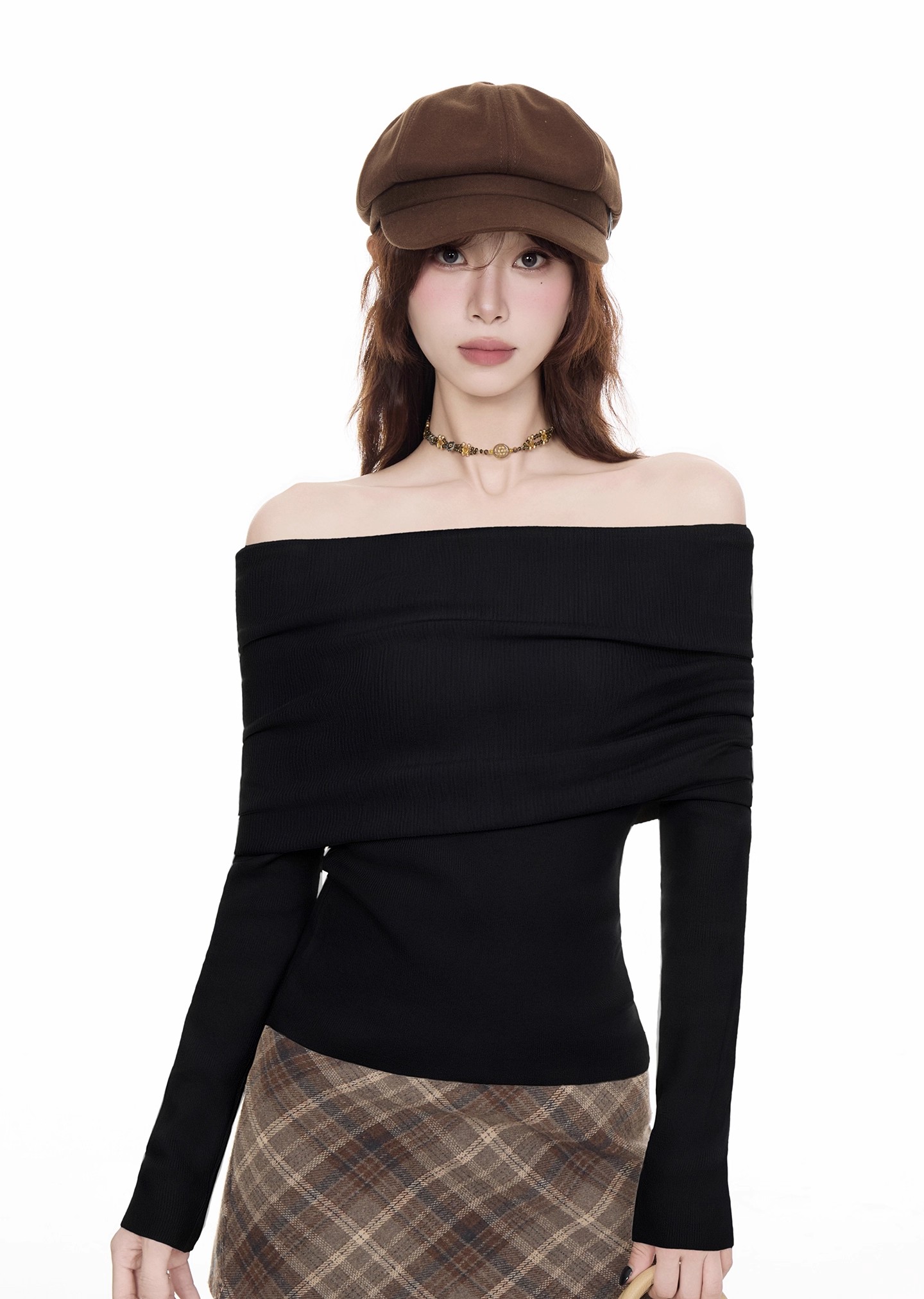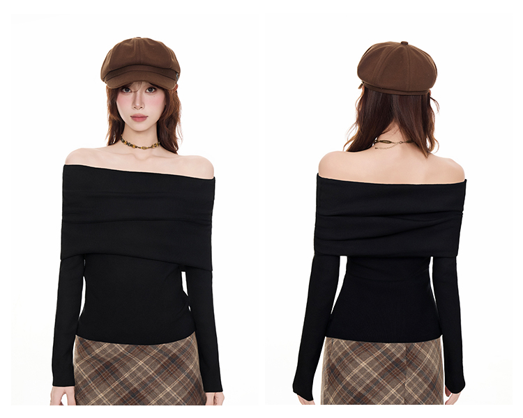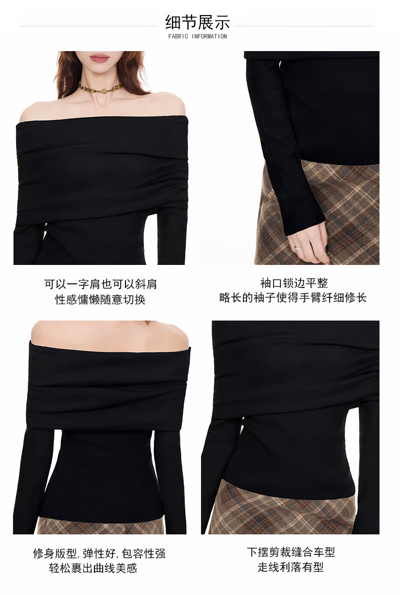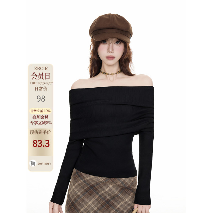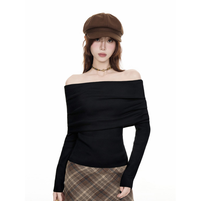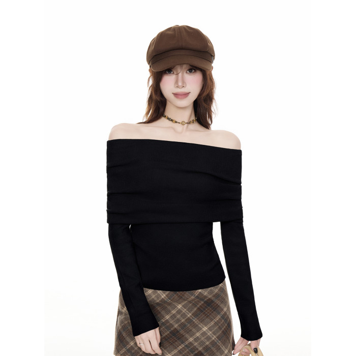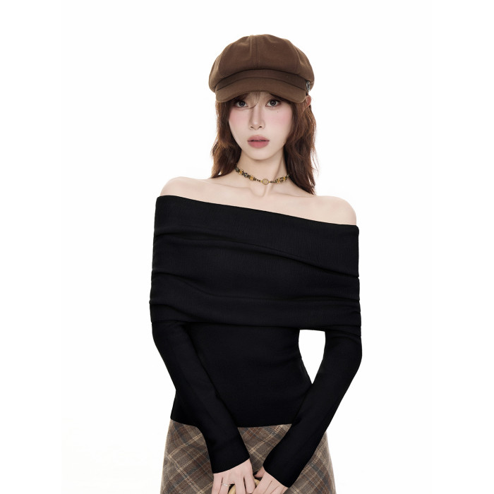 法式黑色一字肩毛衣女2025秋冬設計感慵懶風收腰顯瘦長袖t恤上衣