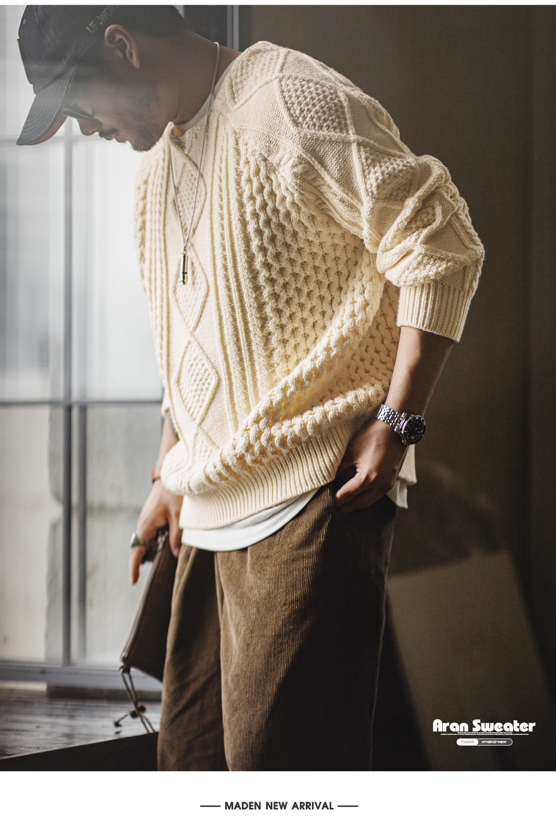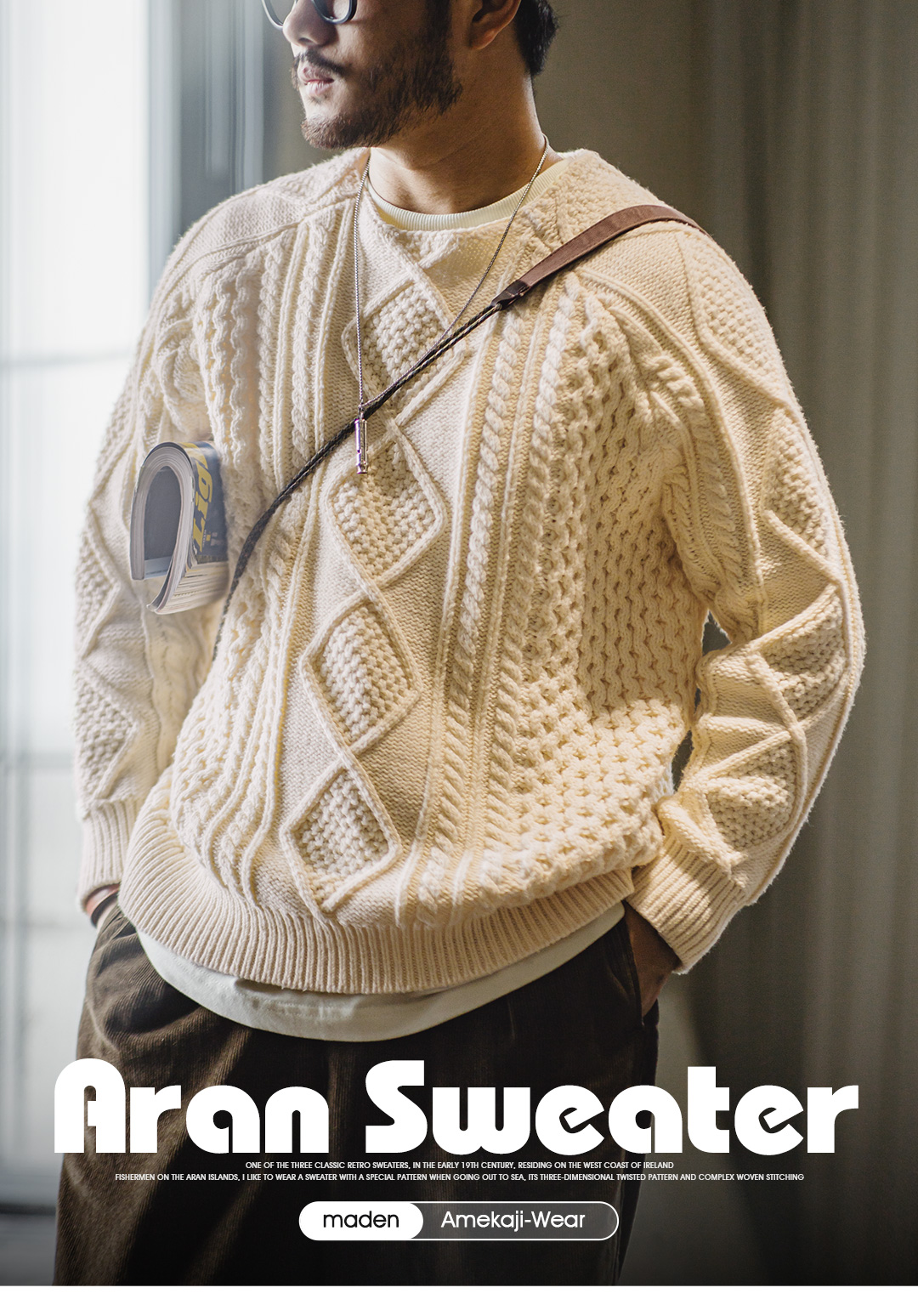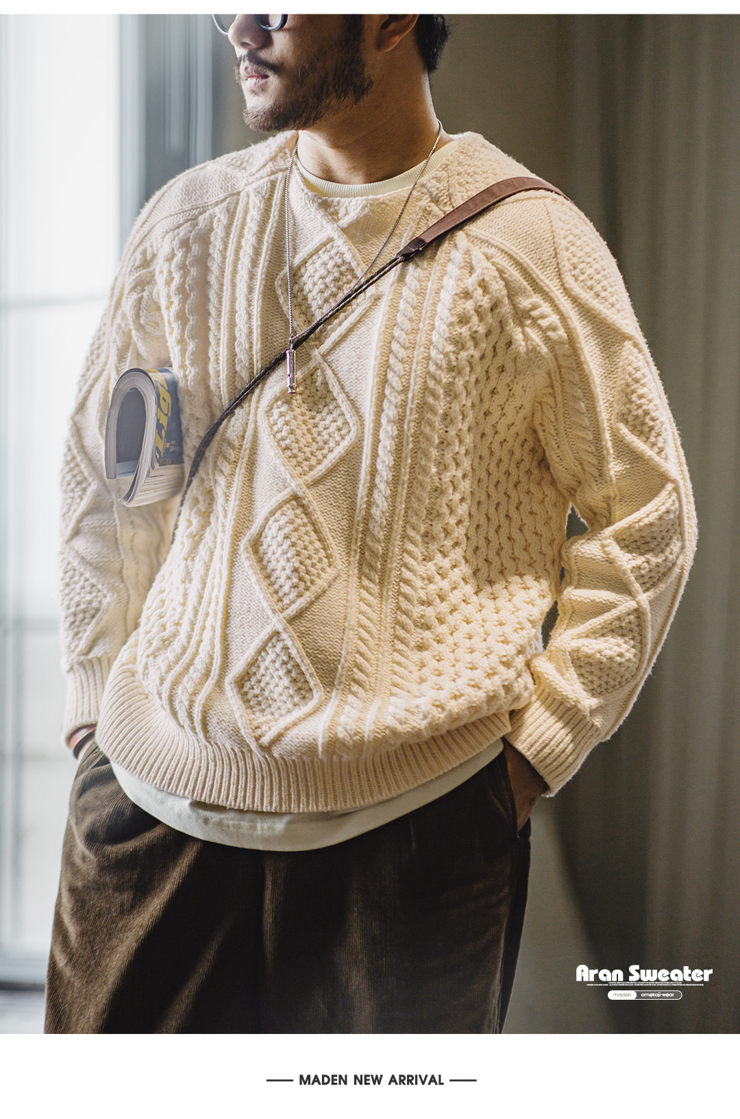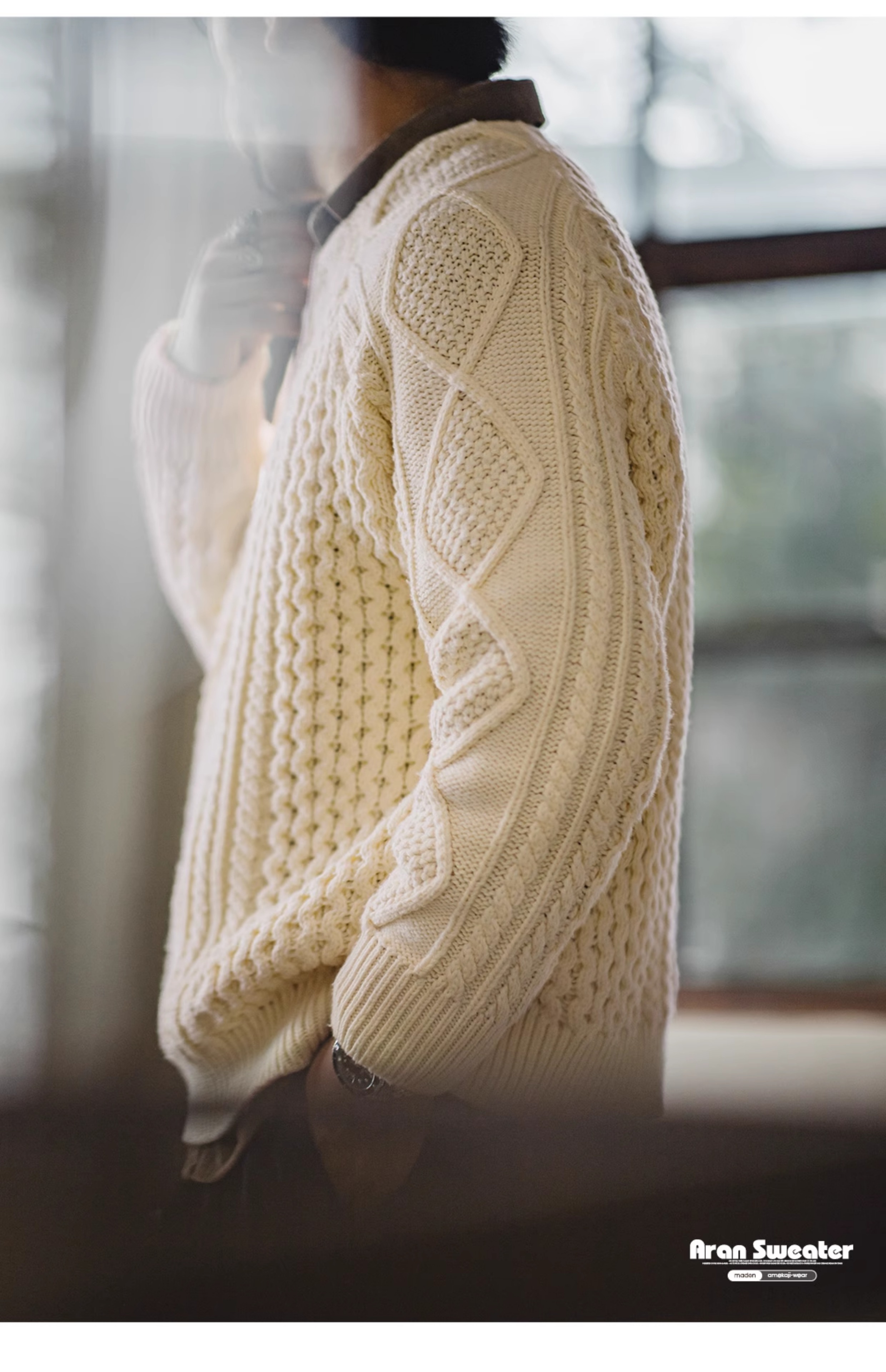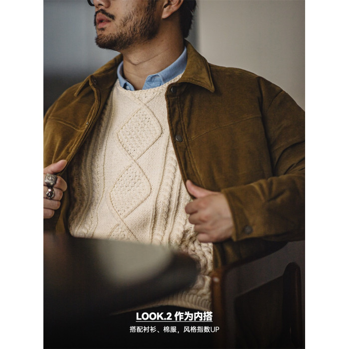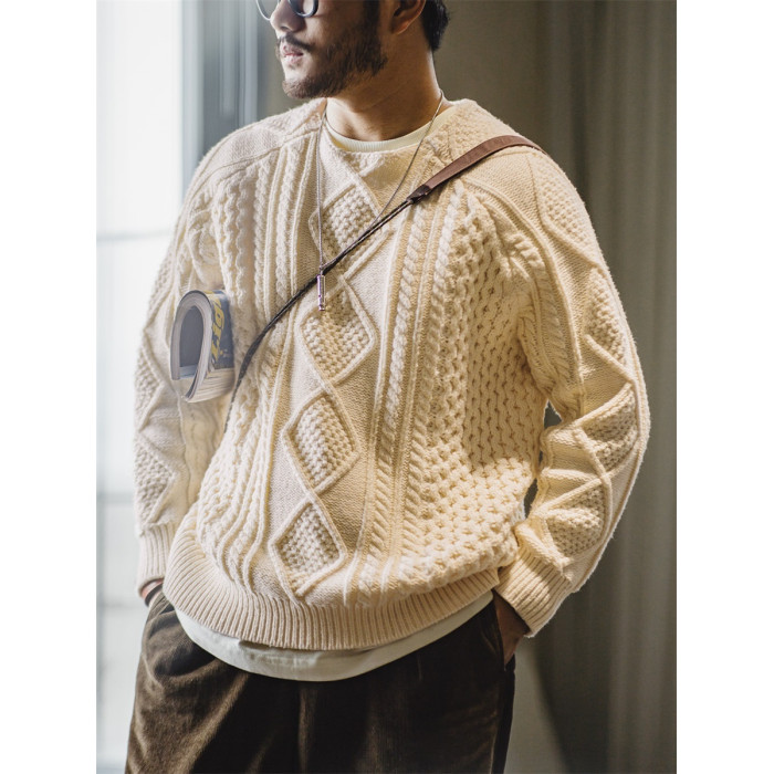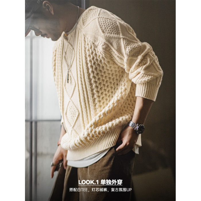 馬登工裝美式復古絞花阿蘭毛衣圓領漁夫米白編織麻花針織衫男秋