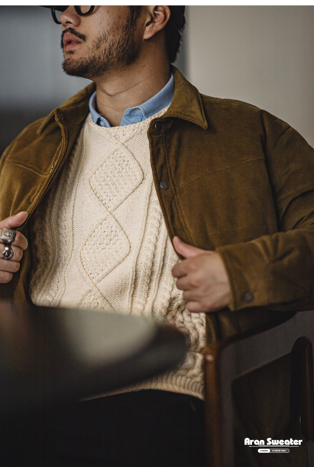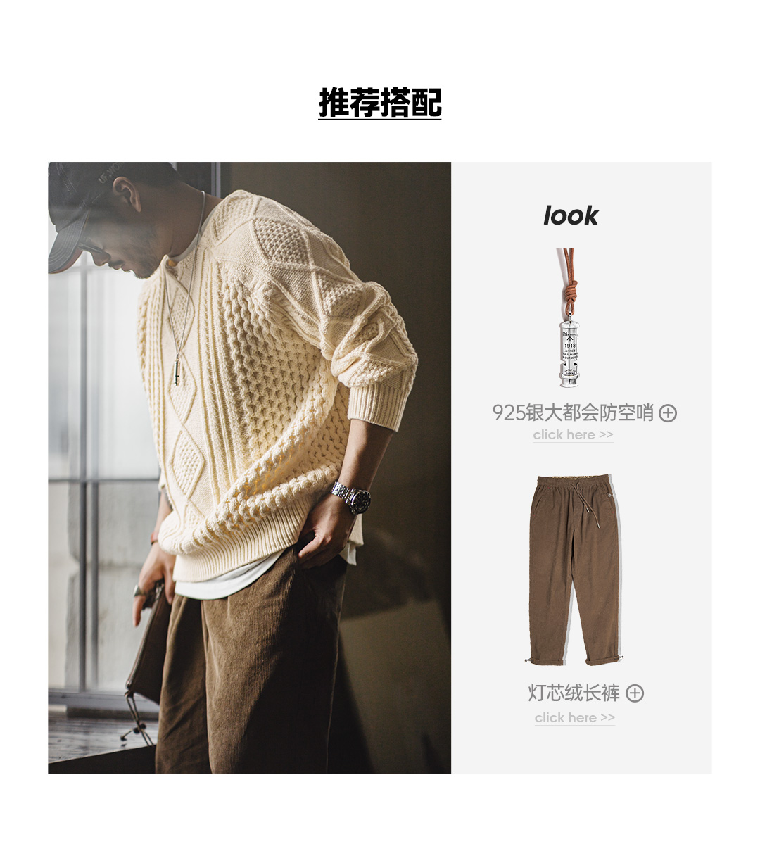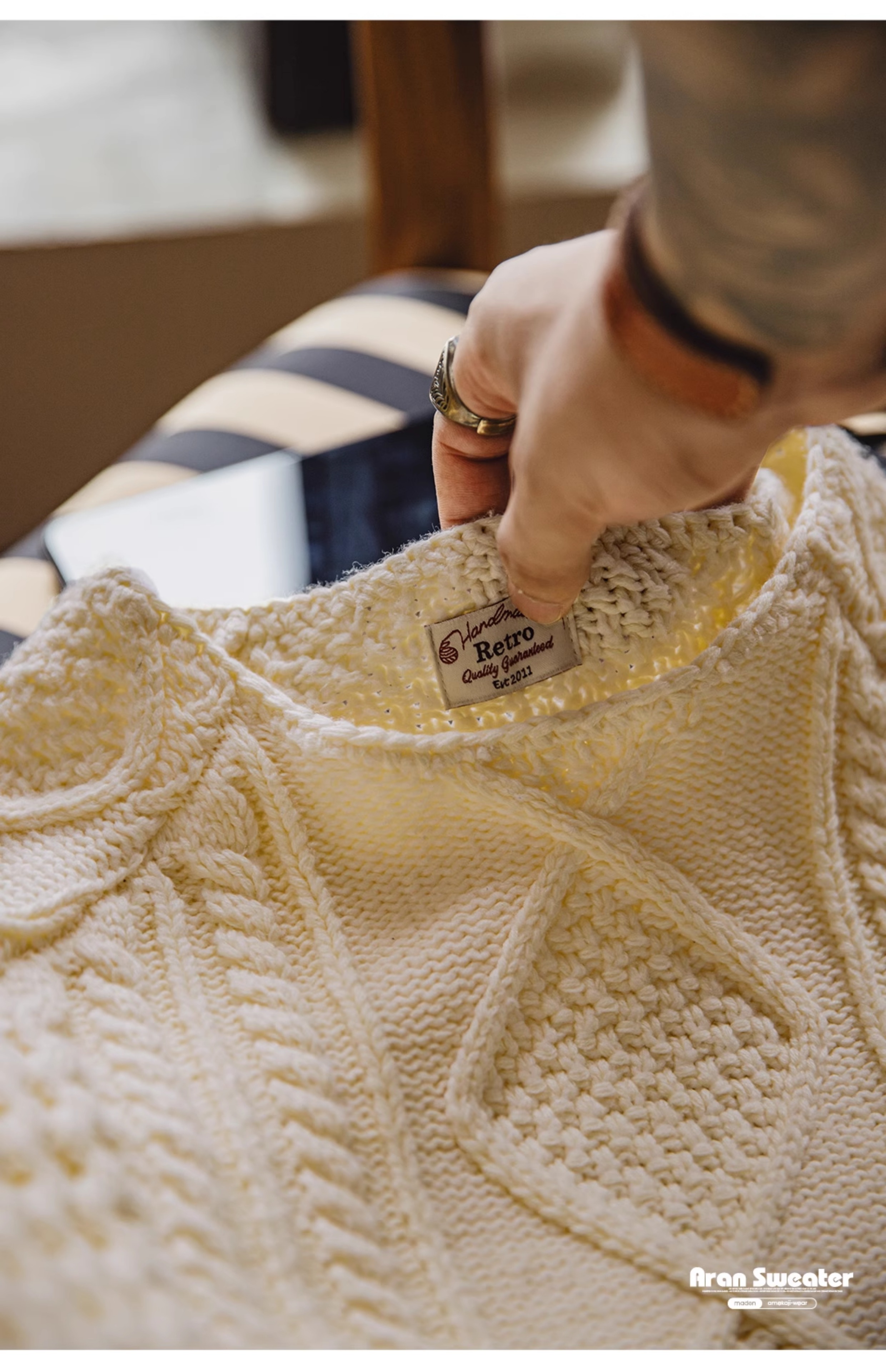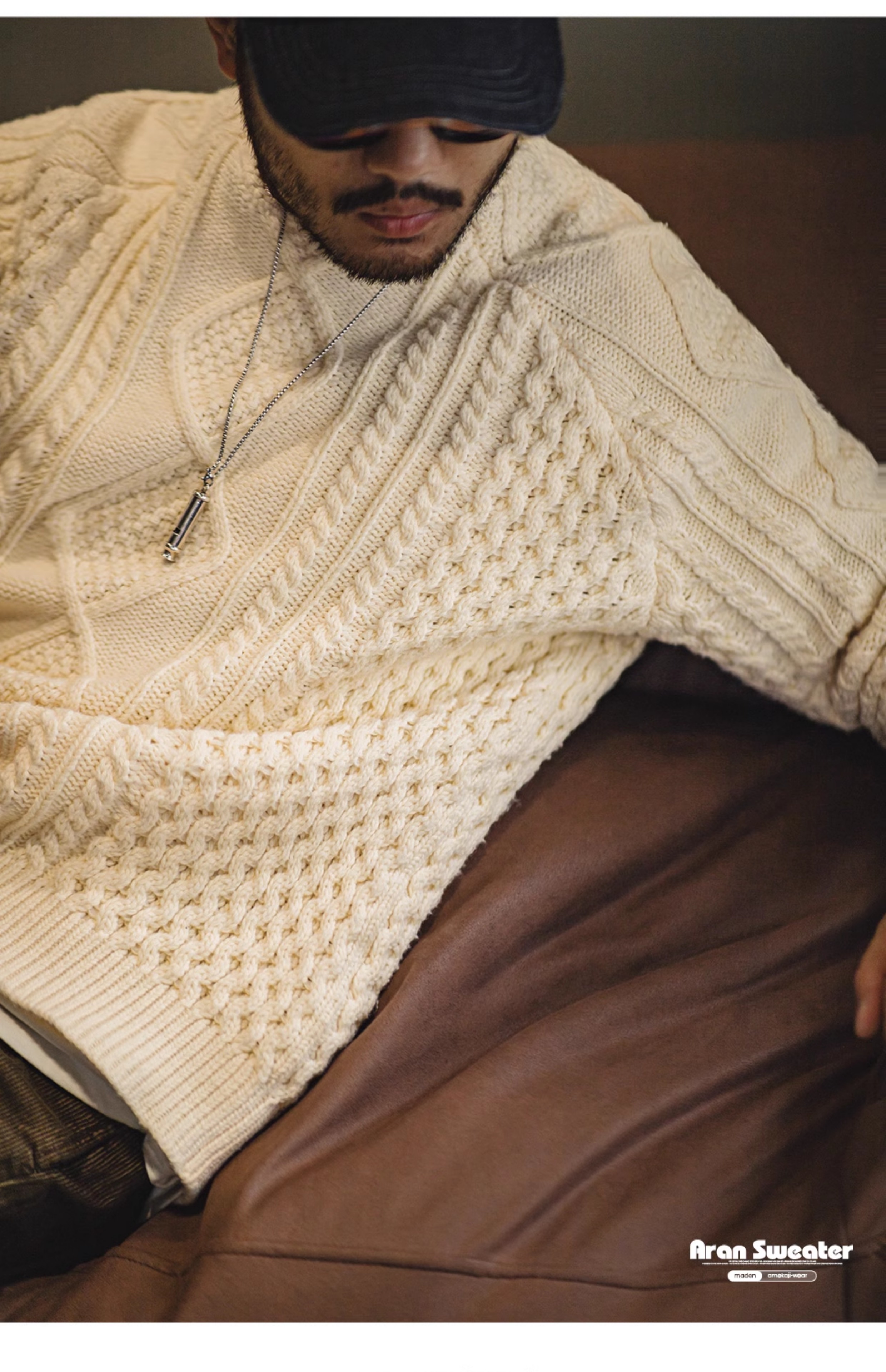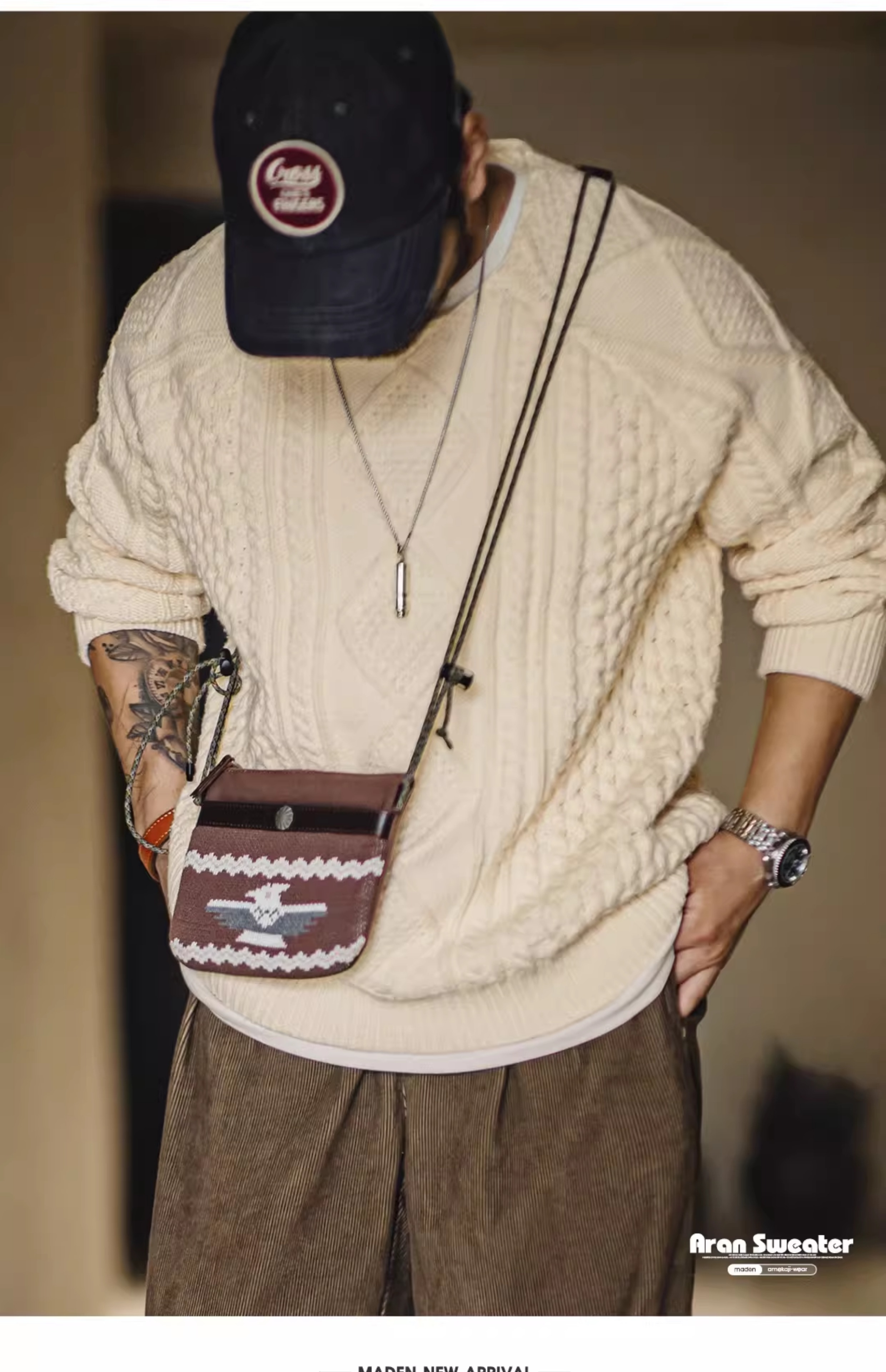 馬登工裝美式復古絞花阿蘭毛衣圓領漁夫米白編織麻花針織衫男秋