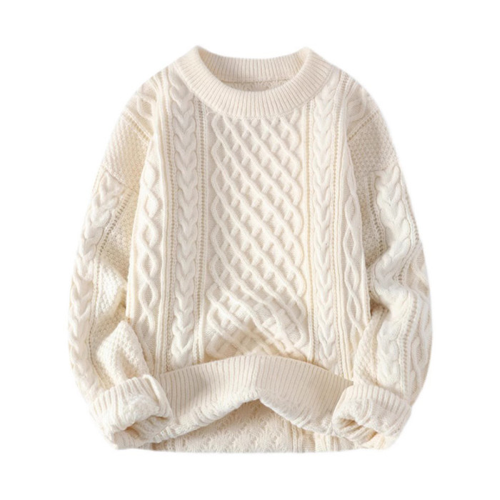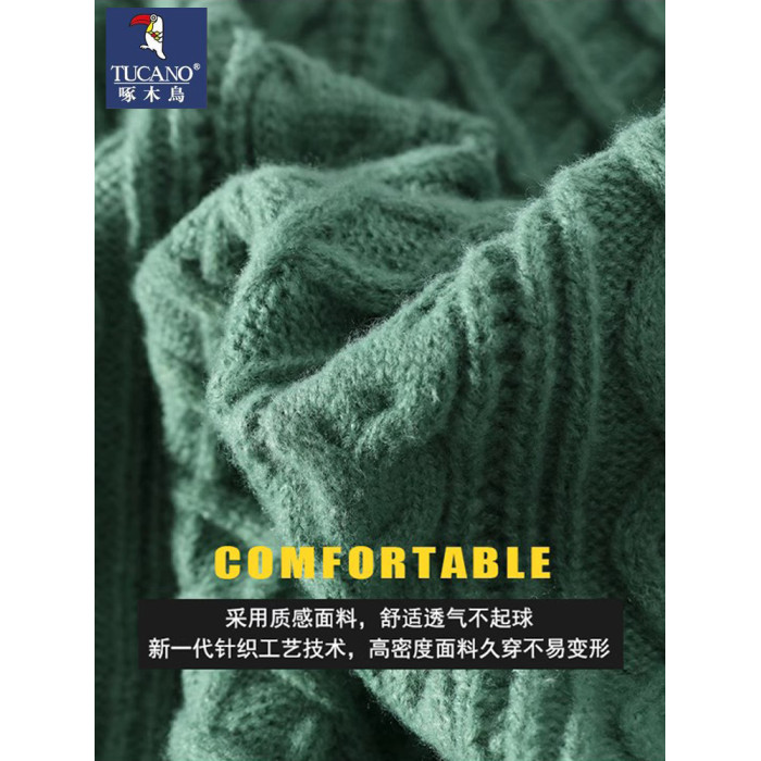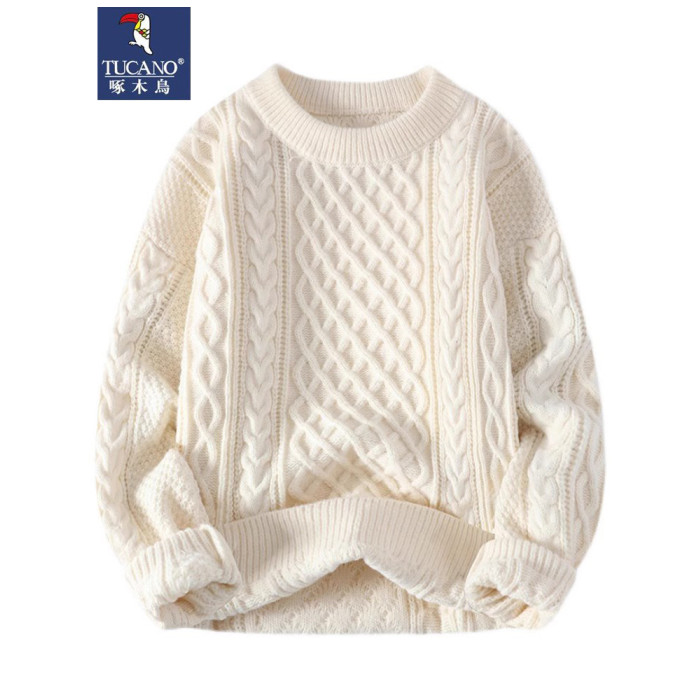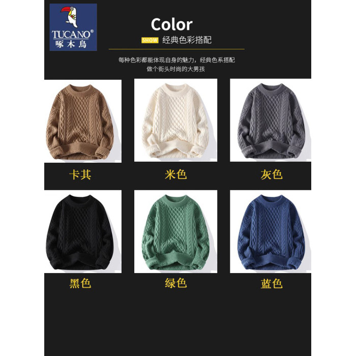 啄木鳥圓領針織麻花毛衣男秋冬季寬松情侶打底衫潮流加絨加厚長袖